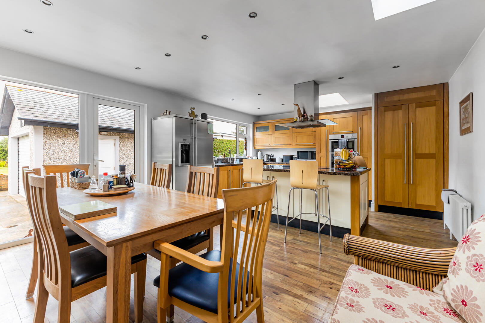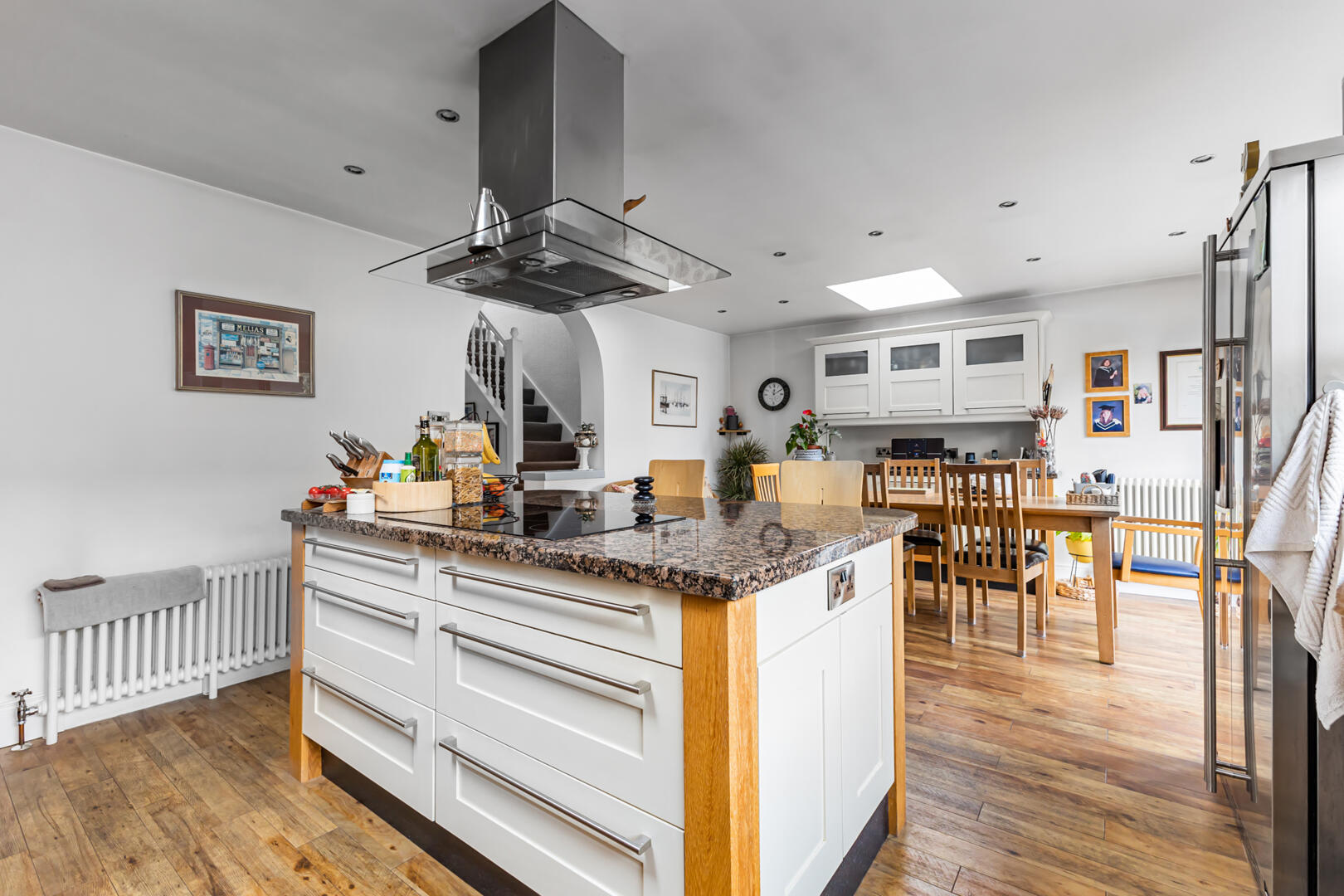 Bright and flexible accommodation includes a spacious living room with attractive fireplace and open fire, an impressive open-plan kitchen with solid oak units, granite worktops, Amtico flooring, and a casual dining area overlooking the rear garden. A cosy family room with cast iron wood-burning stove and French doors to a covered veranda offers the perfect relaxation space and could also serve as a fourth bedroom if desired. The ground floor further includes a bedroom and a bathroom with a three-piece suite featuring a freestanding cast iron roll-top bath.