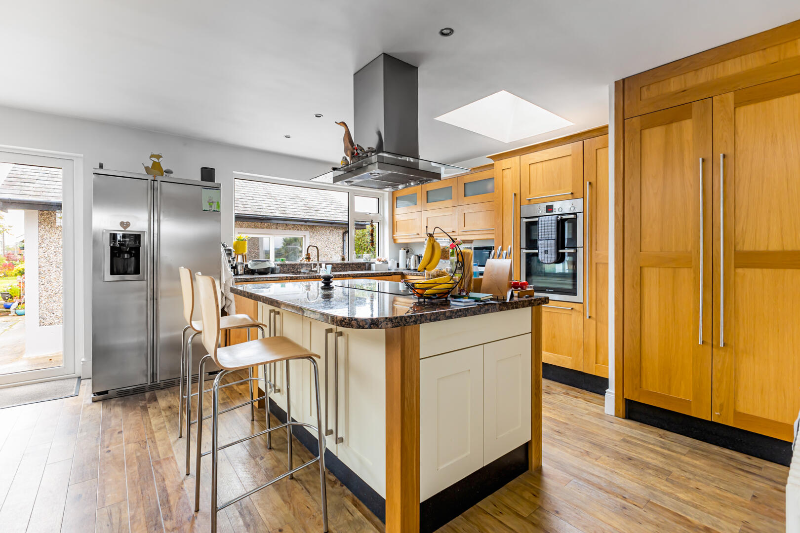 at widest points Extensive range of high and low level solid oak units, granite work surfaces, Franke one and a half bowl stainless steel sink unit with mixer tap, matching granite drainer, integrated double oven, integrated dishwasher, pull-out larder cupboards, glass display cabinets, large island unit with additional storage cupboards and drawers, granite worktop, Bosch four ring induction, Franke extractor fan above, breakfast bar, Amtico floor, outlook to rear garden, integrated wine racks, space for fridge freezer, uPVC double glazed door to rear garden.