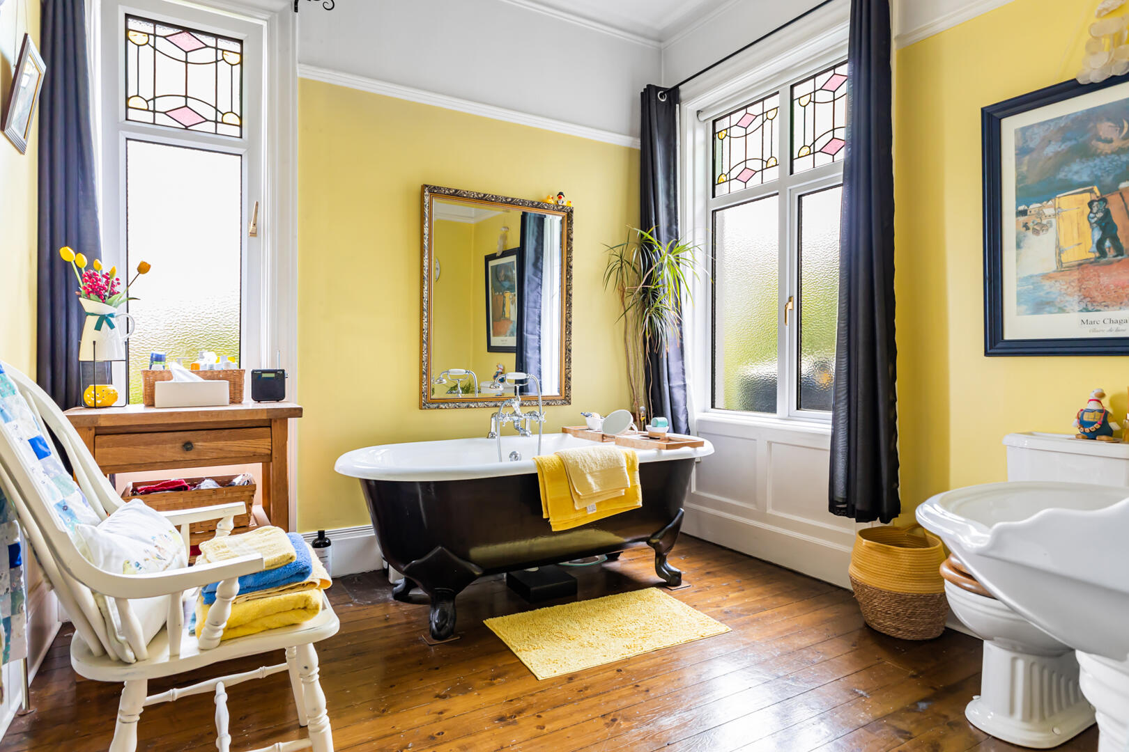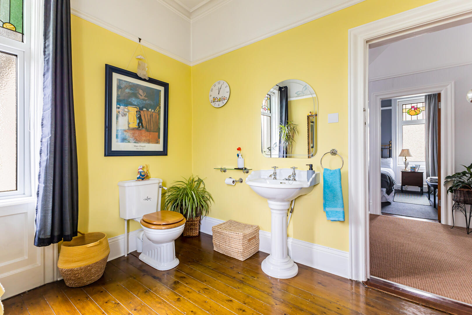 Three piece suite comprising free standing cast iron roll top claw foot bath with mixer tap, telephone hand shower, BC Sanitan pedestal wash hand basin, BC Sanitan low flush WC, solid wooden stained floorboards, cornice ceiling, picture rail, stained glass top lights.