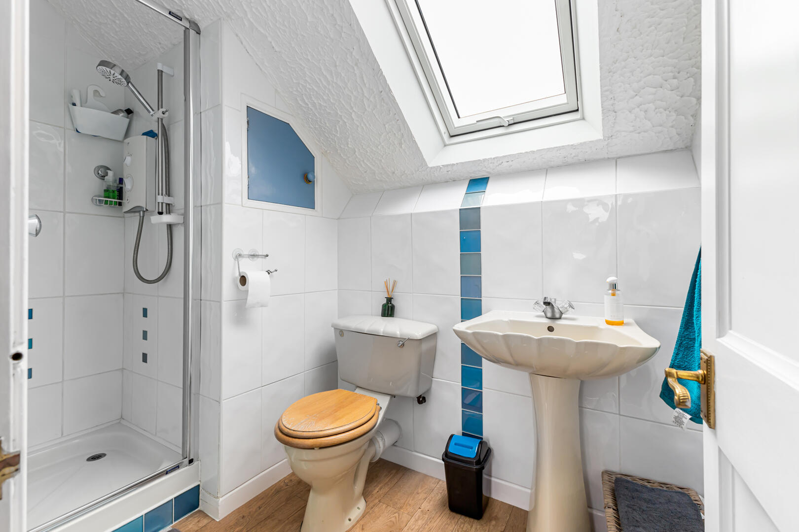 Three piece suite comprising built-in fully tiled shower cubicle, pedestal wash hand basin, mixer tap, low flush WC, fully tiled walls, Velux window.