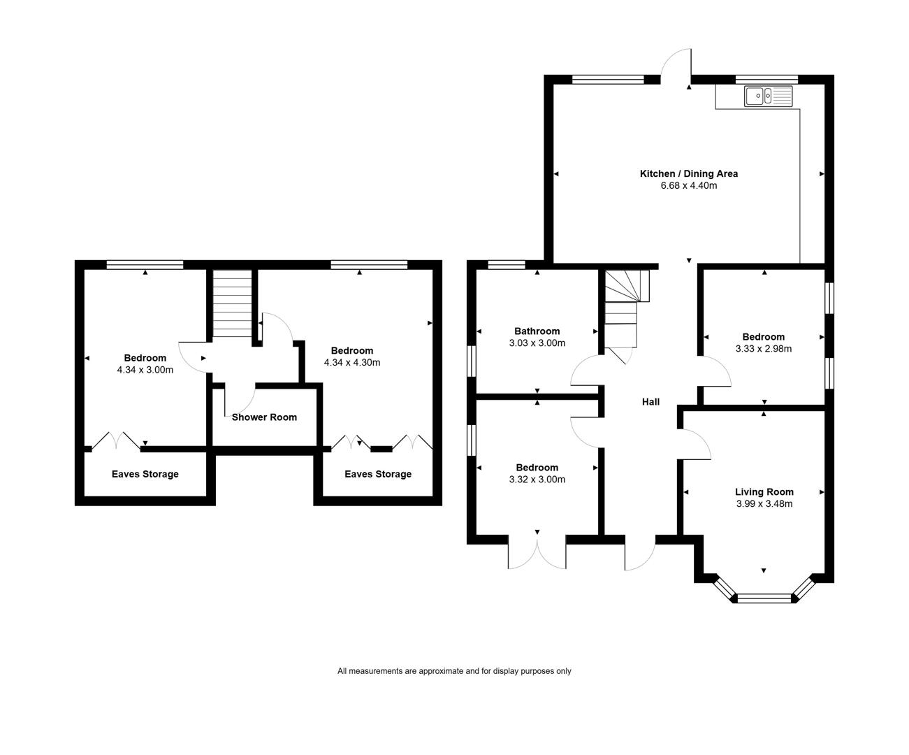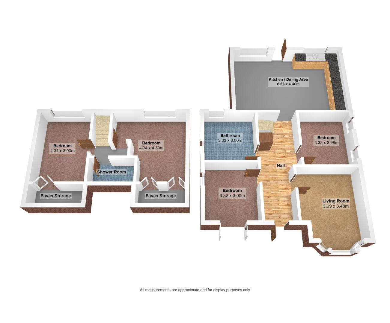 Upstairs are two additional bedrooms with eaves storage and a modern shower room.