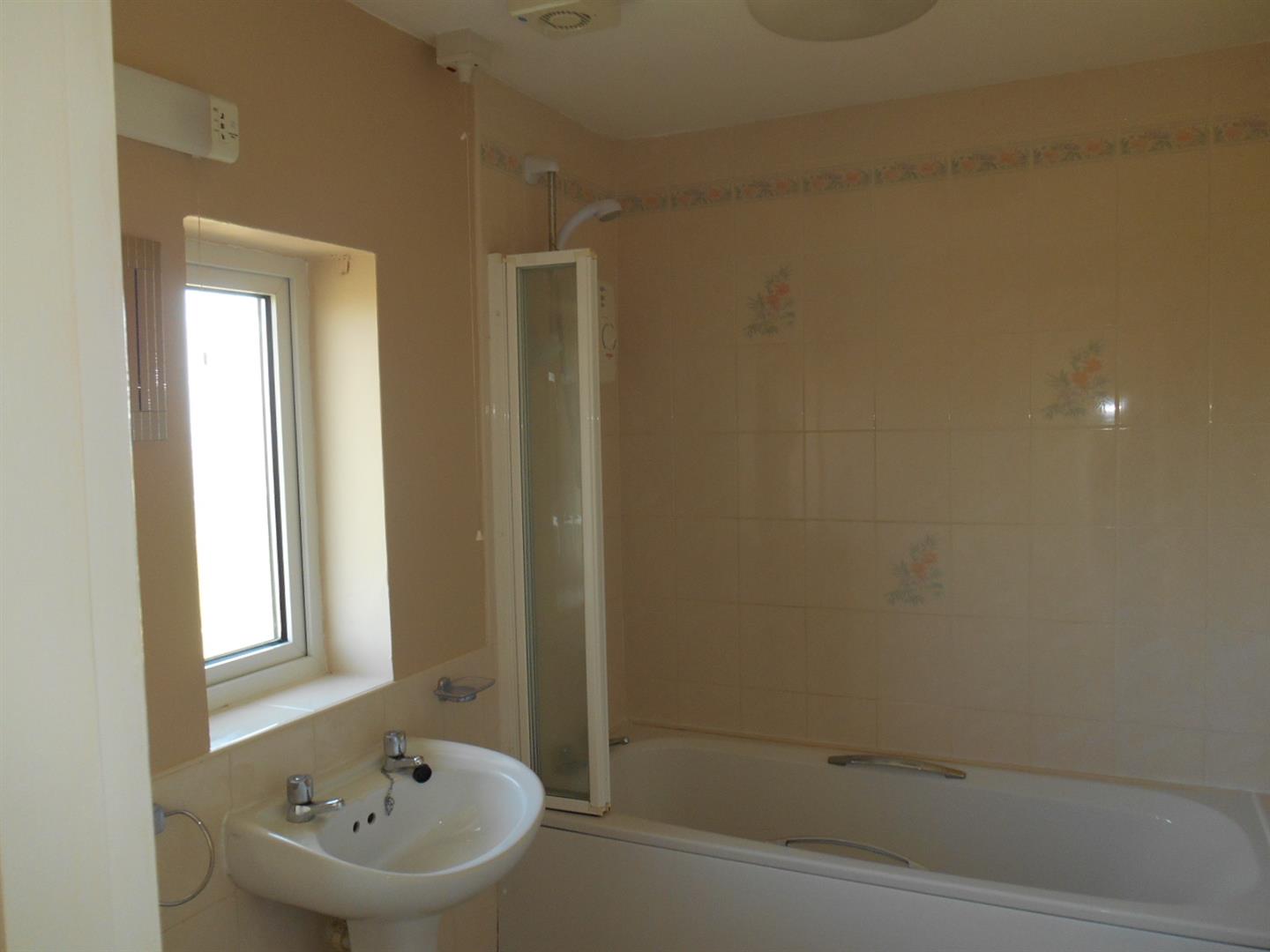 White suite comprising bath, Electric shower attachment over bath, Pedestal wash hand basin, Extractor fan, Low flush WC, Shaver point & Light, Part tiled walls, Cushion flooring.