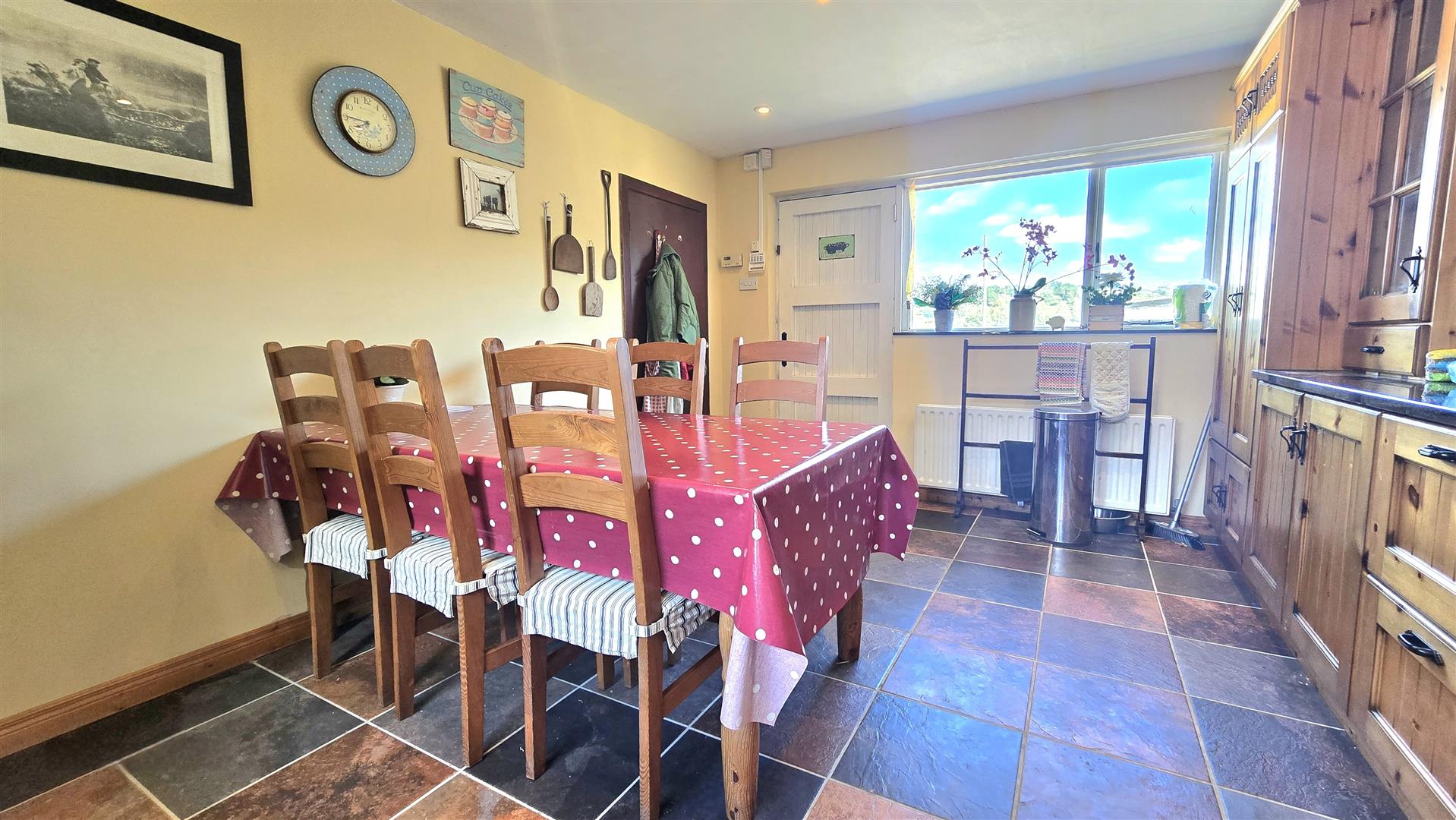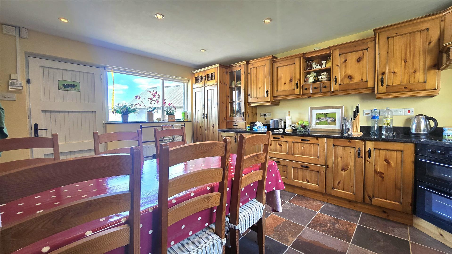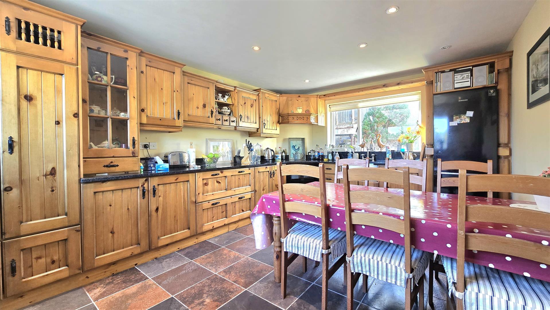 Country pine kitchen fitted with a range of eye and low level units. Granite worksurfaces with matching upstands. Belfast sink. Integrated hob and oven, with integrated extractor fan over. Space for fridge/freezer. Integrated washing machine. Tiled floor. Recessed ceiling lighting. Hardwood back door.