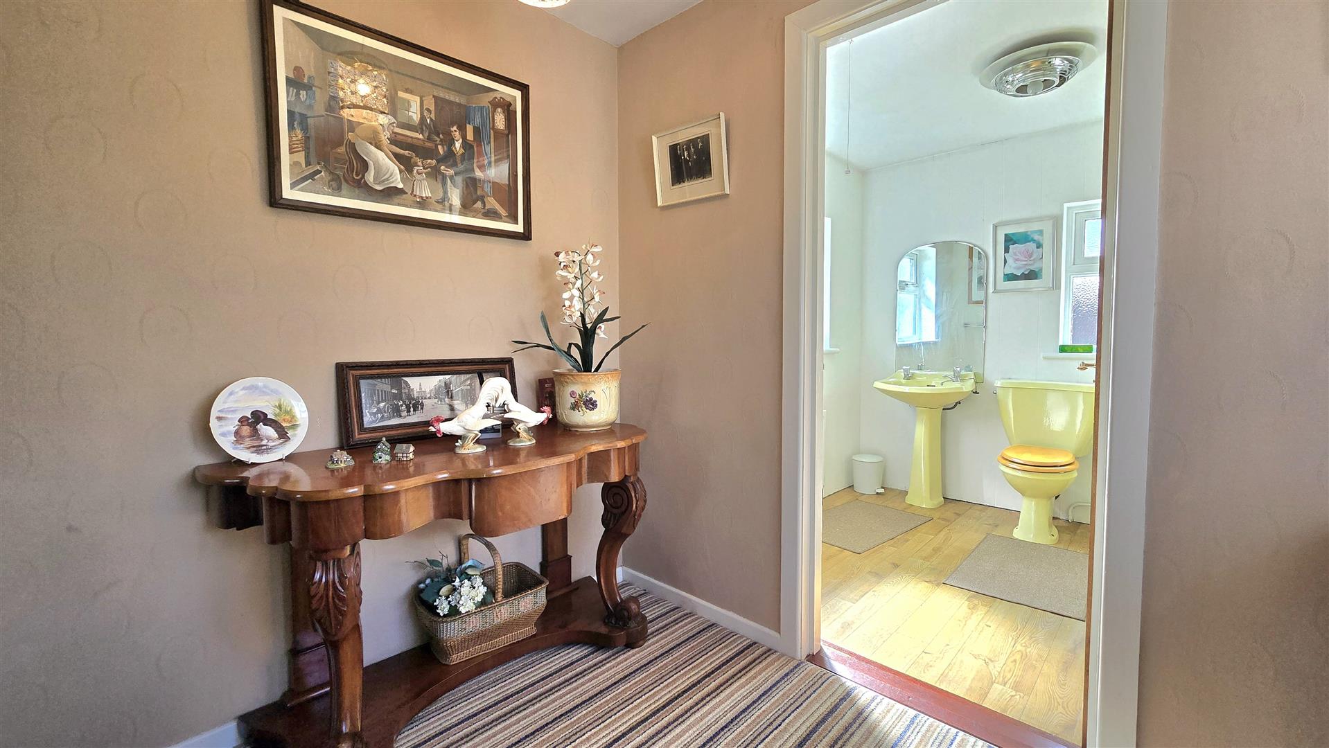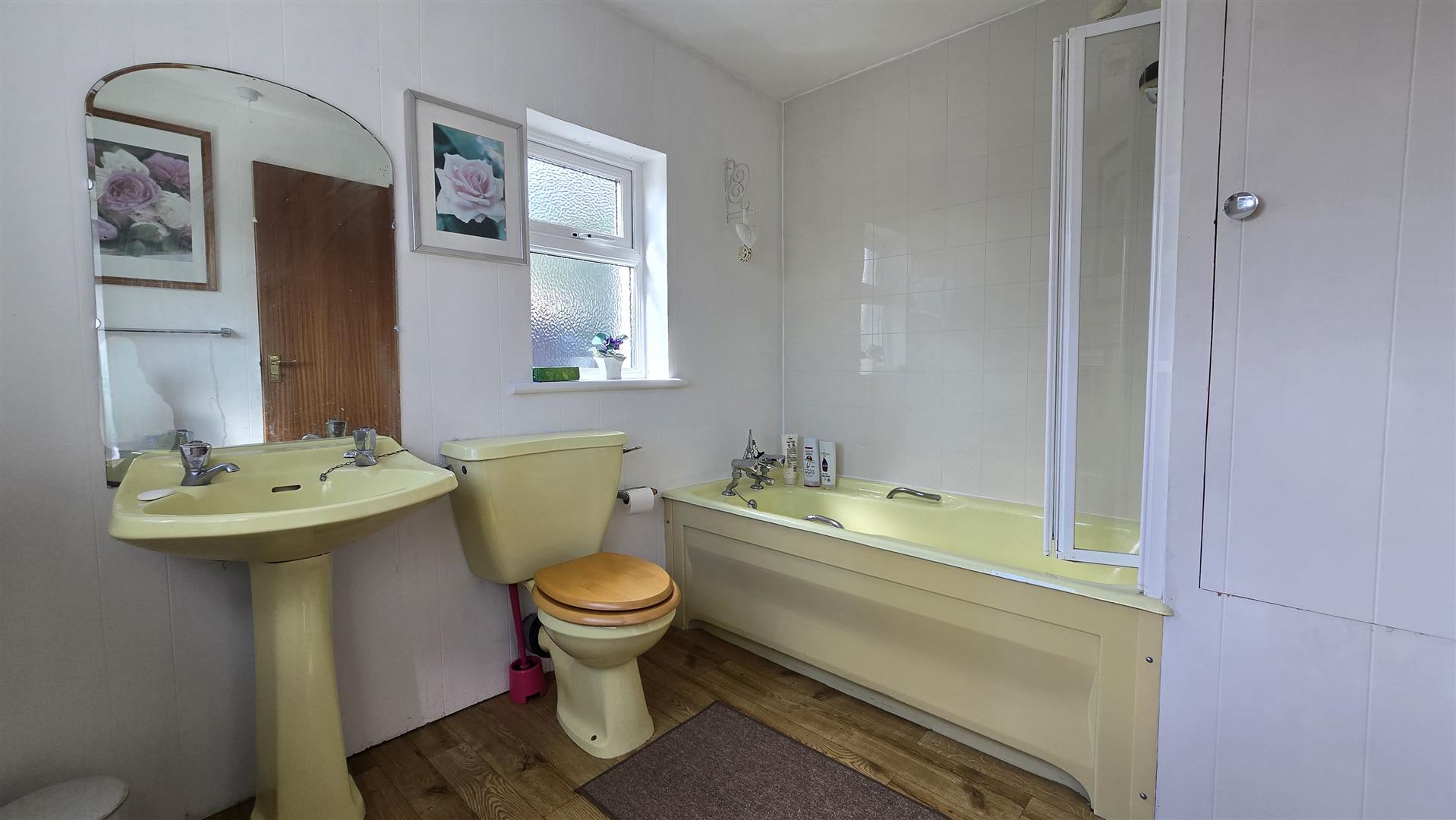 Fitted with a primrose suite, including a bath with electric shower over, W/C and wash hand basin. Panelled splash back areas.
