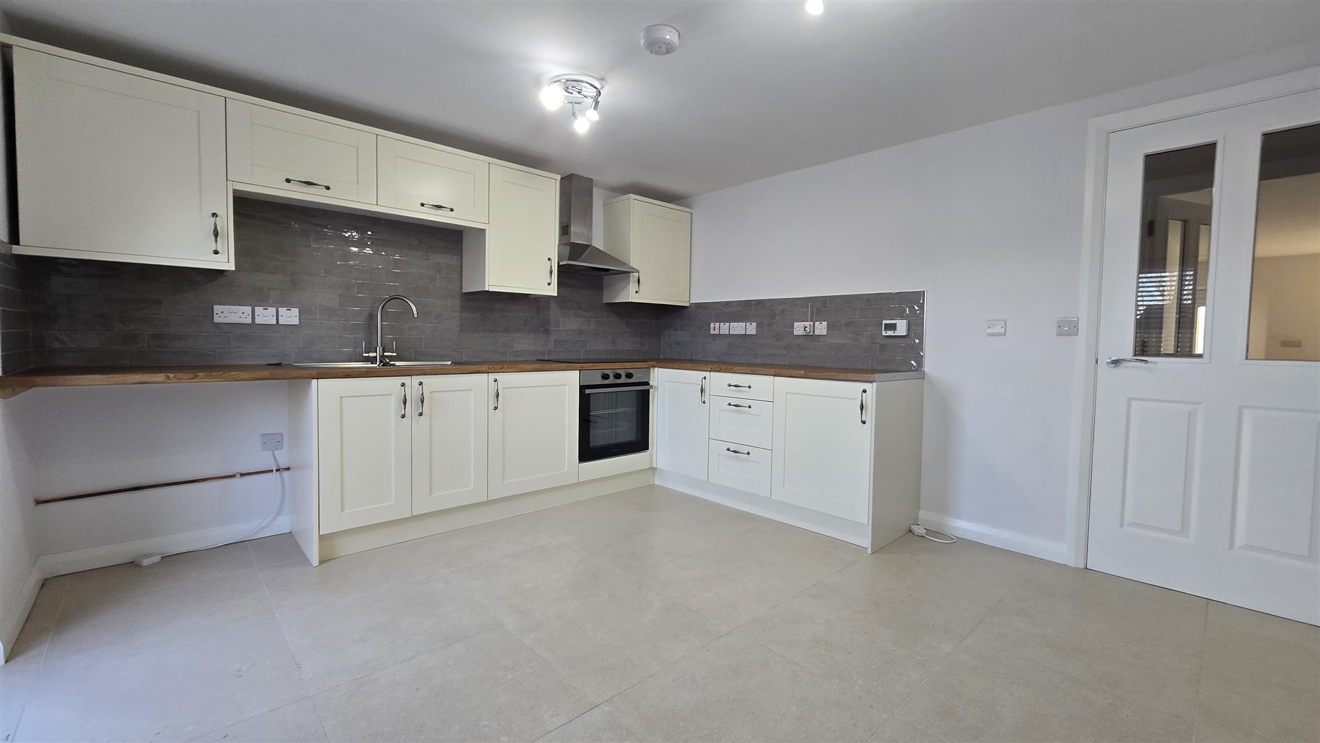Fitted with a contemporary shaker style units. Laminate worktops. Hob & cooker, stainless steel extractor. Tiled floor and splash back areas. PVC back door.