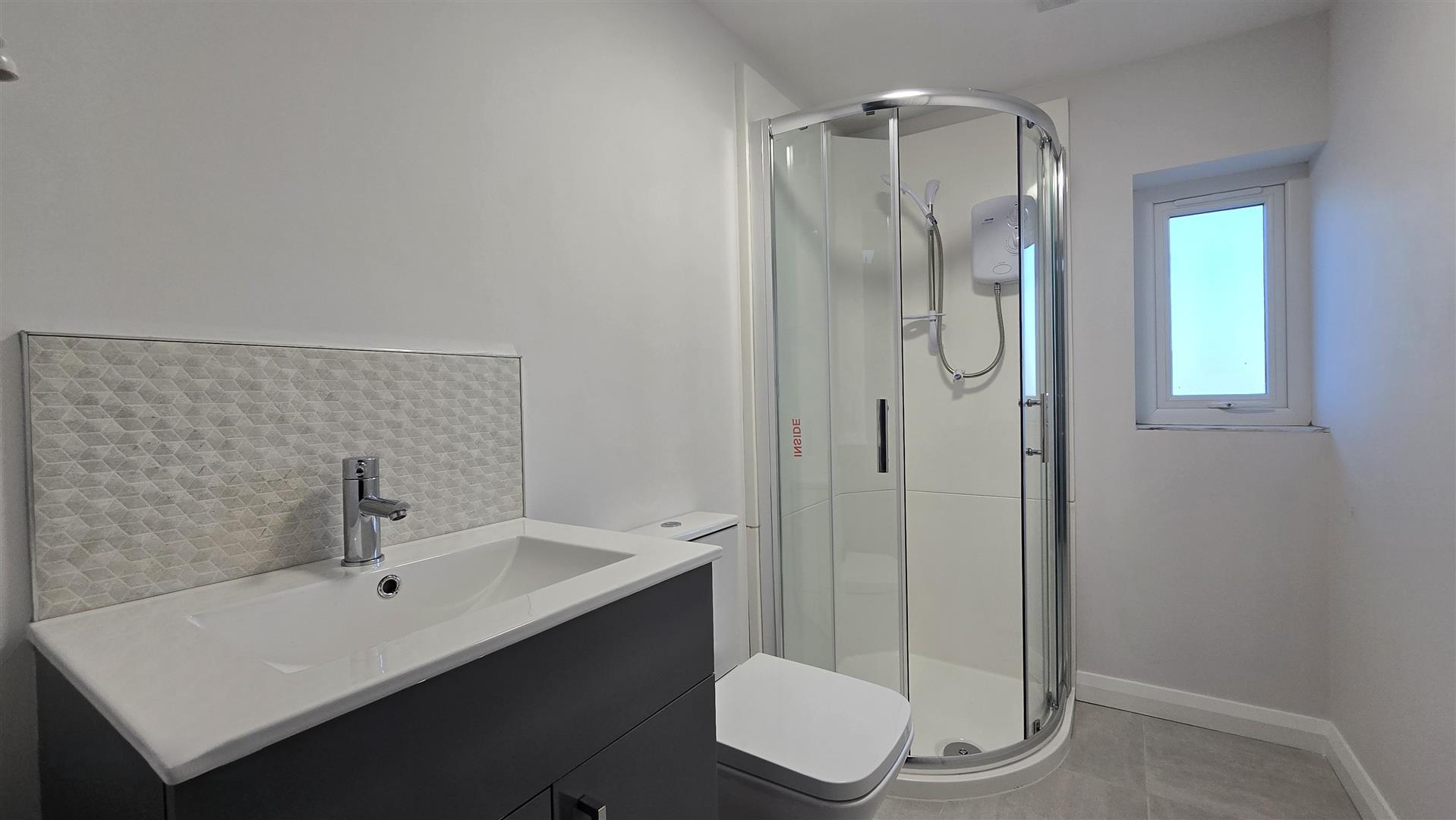 W/C, wash hand basin, electric shower cubicle. Tiled floor and splash back areas.