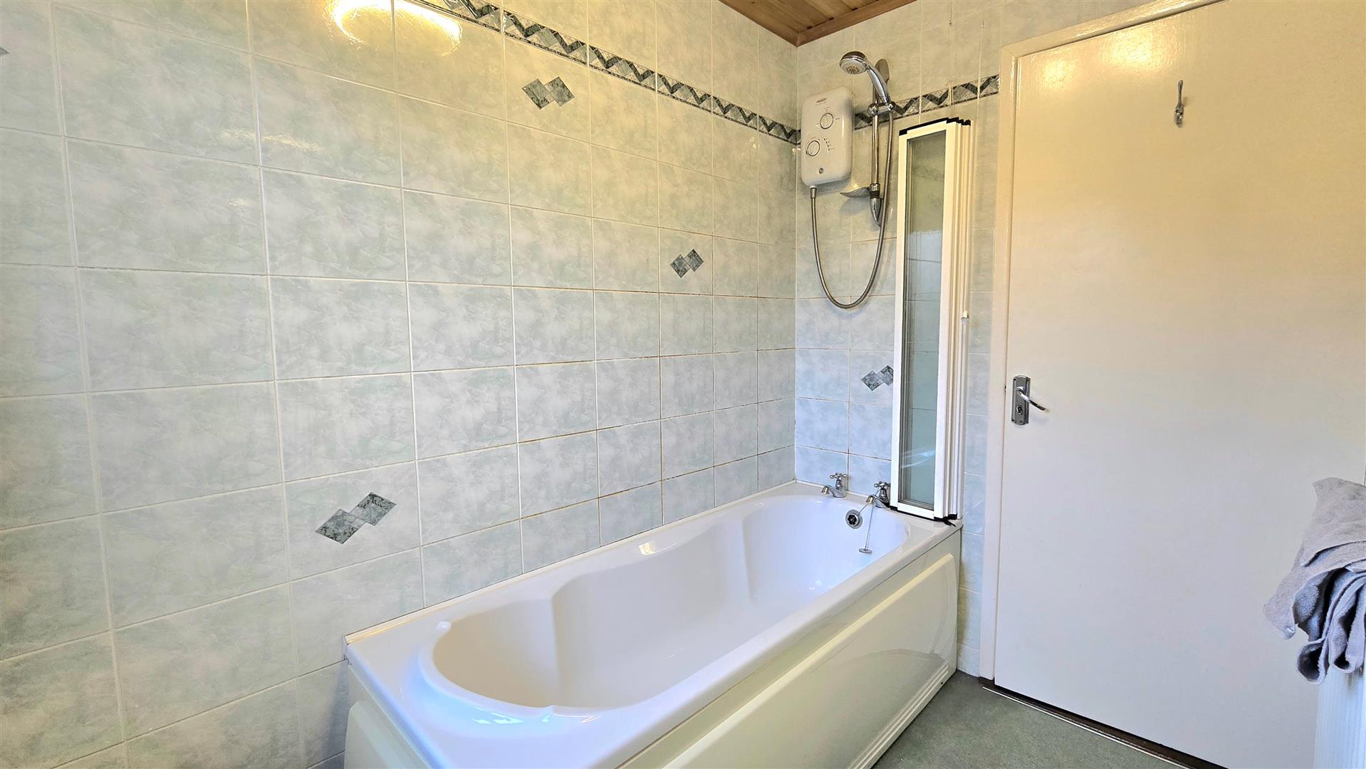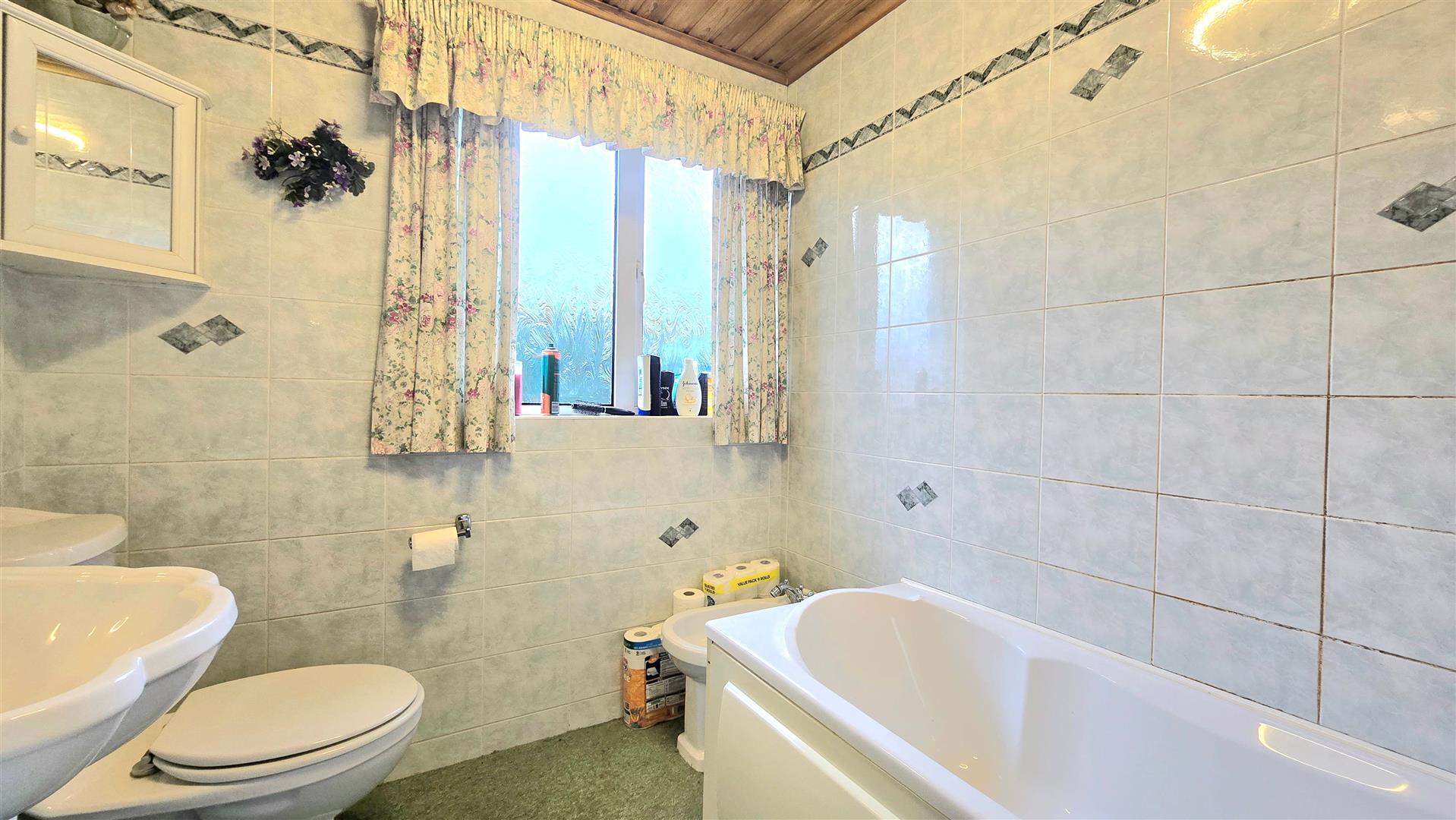 Fitted with a bath (electric shower over), W/C, bidet and wash hand basin. Fully tiled walls. Pine ceiling.