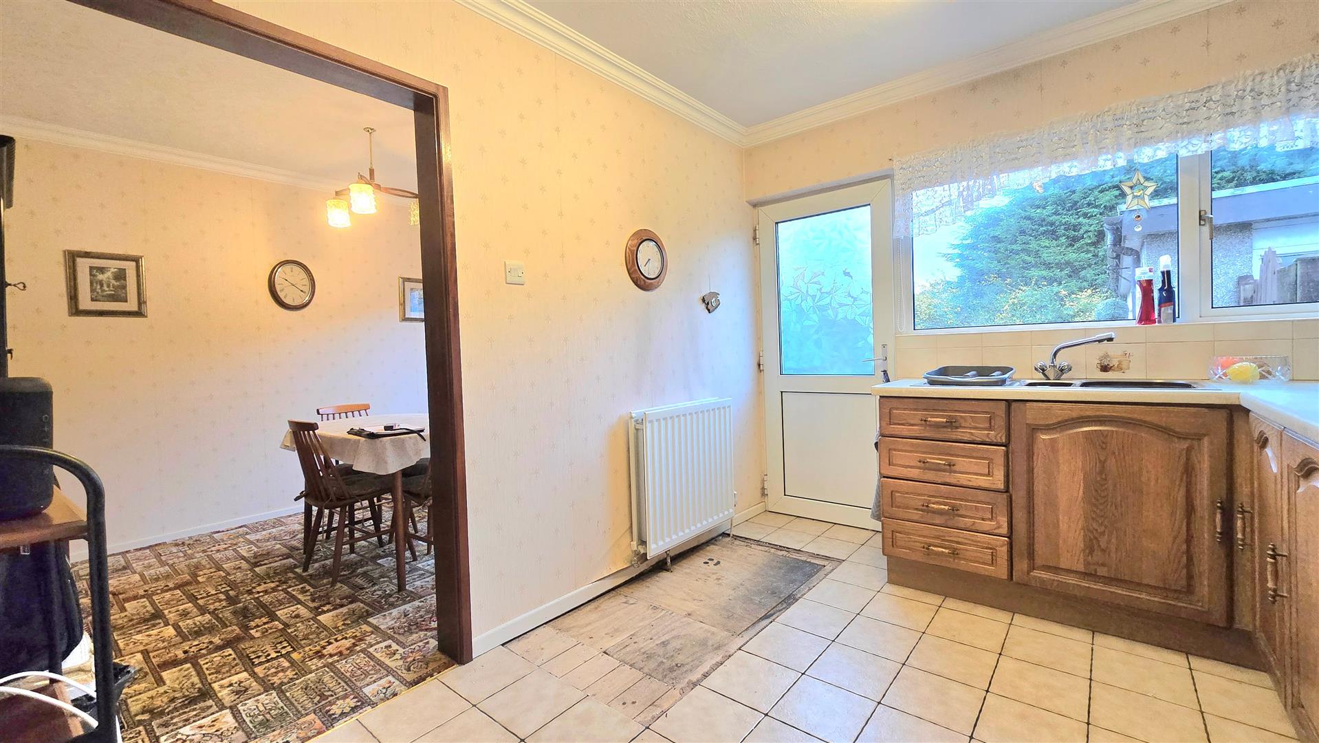 Fitted with a range of eye and low level units and laminate work surfaces. Tiled splash back areas. Integrated fridge, eye level oven/microwave and hob with integrated extractor fan over. Tiled floor. Open archway into Dining Room.