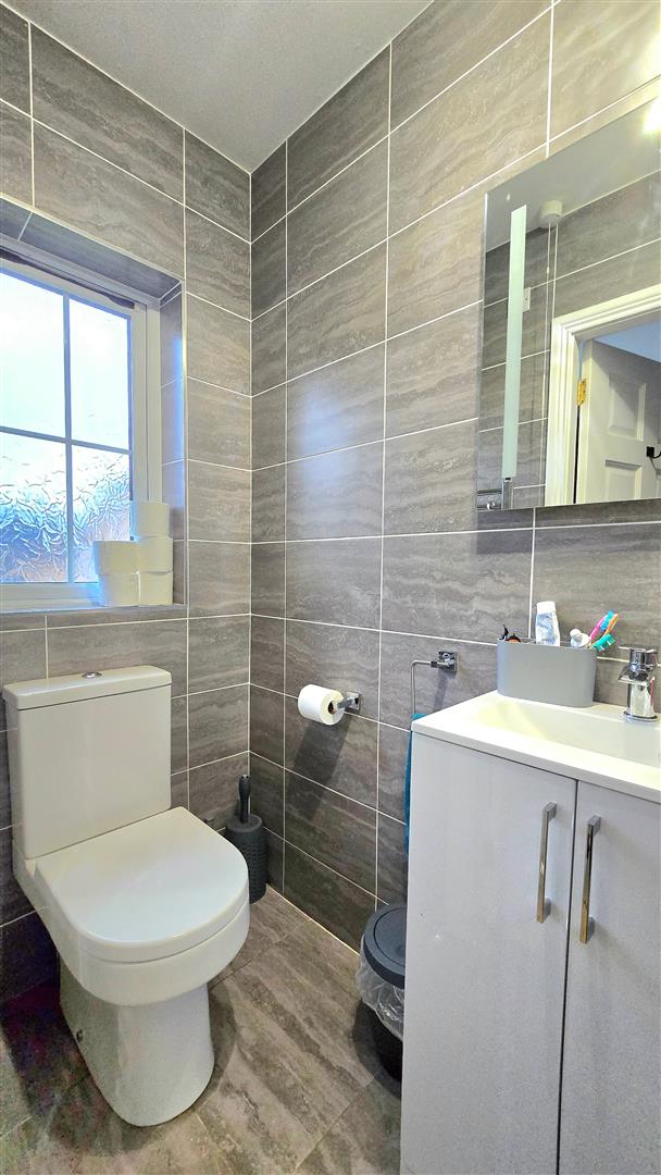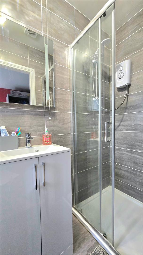 Fitted with a contemporary suite, including a shower cubicle with electric shower, LFWC and wash hand basin with vanity unit. Tiled floor to ceiling.