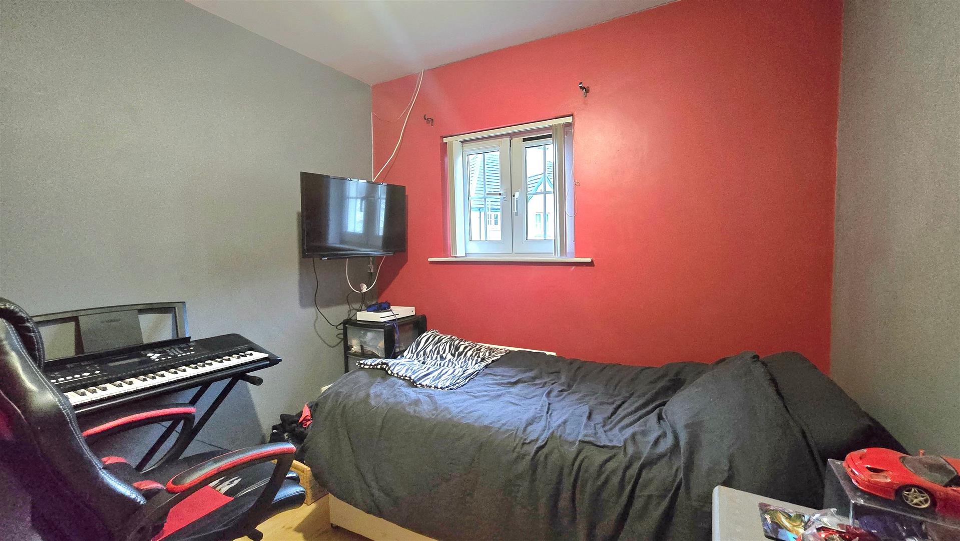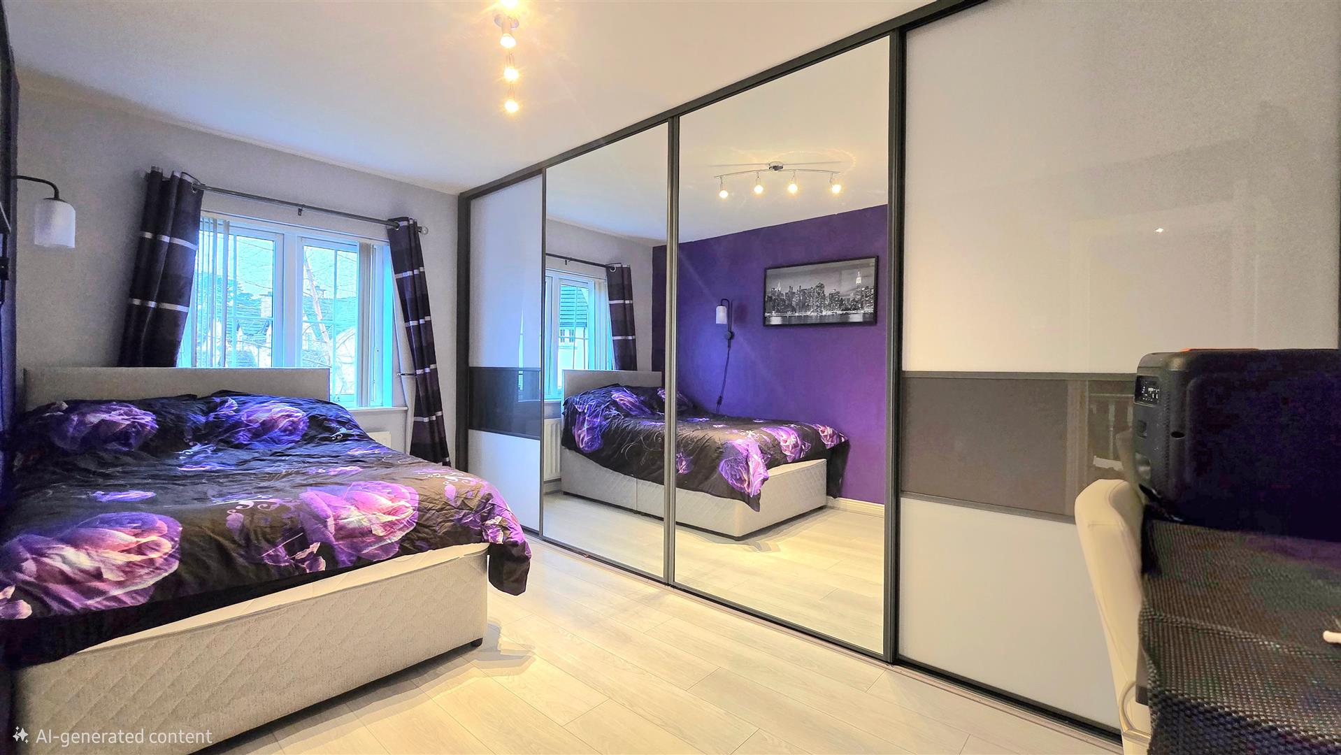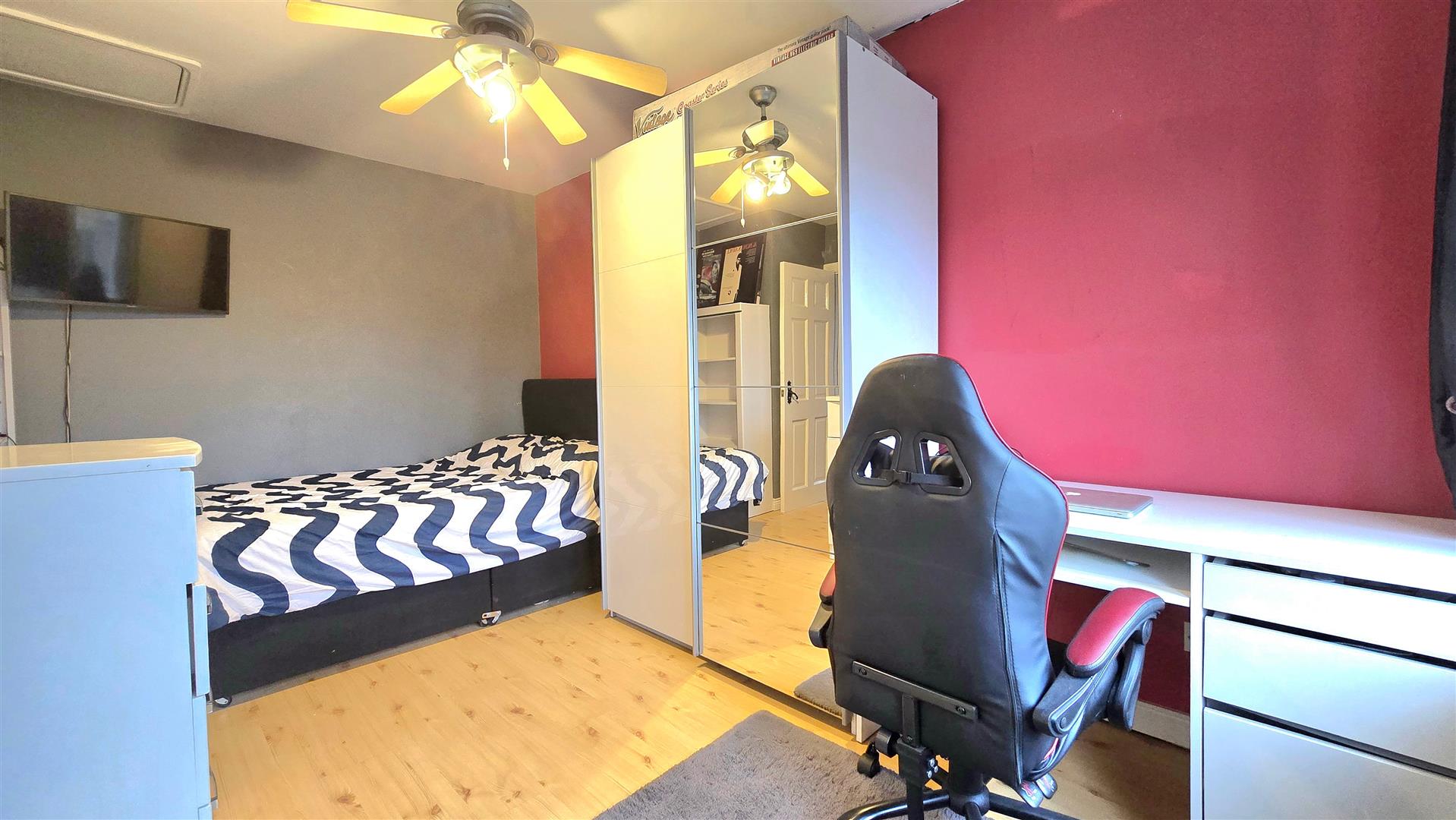 Fitted with wall length mirrored sliding wardrobes. Wood effect laminate flooring.