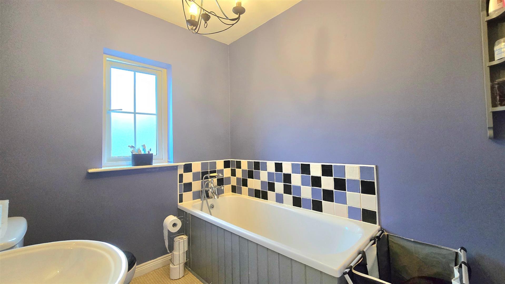 Fitted with a bath, W/C and wash hand basin. Tiled splashback areas.