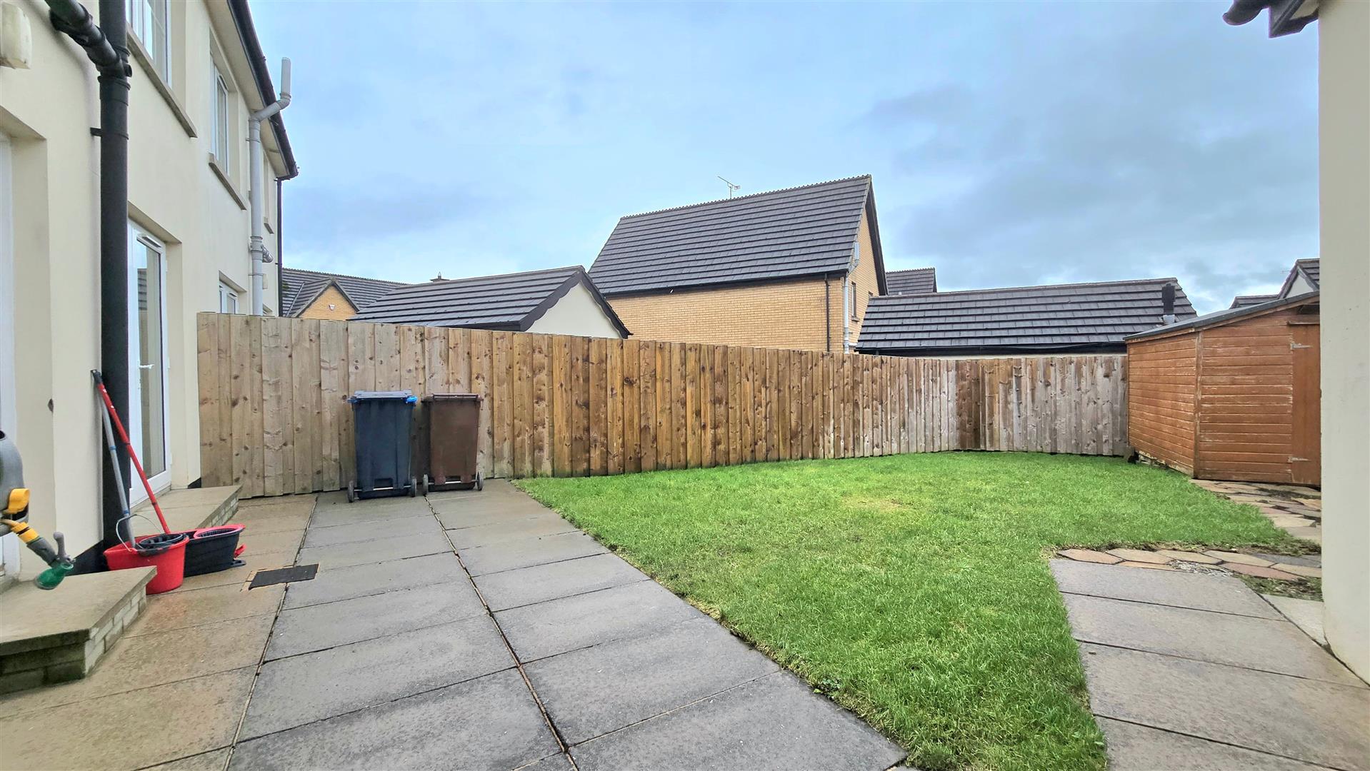 Fully enclosed back garden laid in lawn with paved patio area.