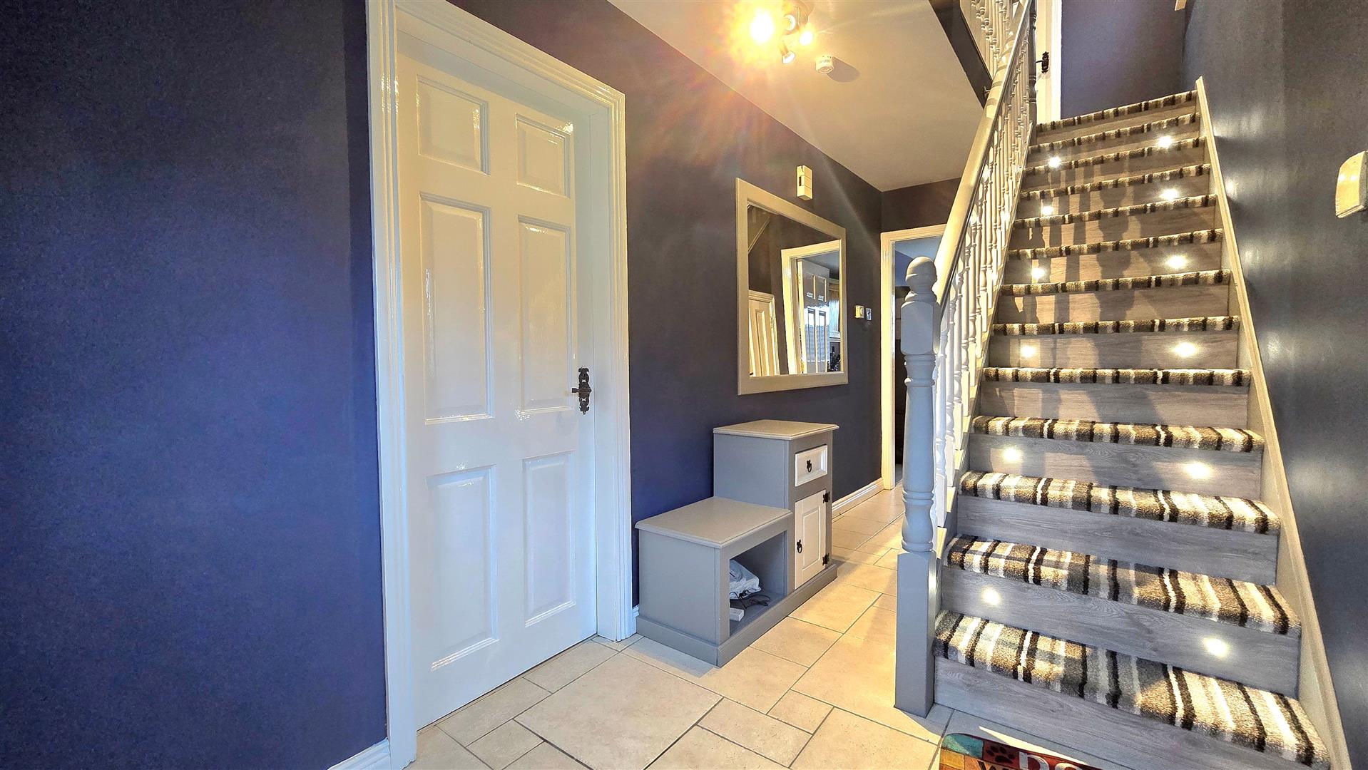 PVC front door. Under stairs storage. Tiled floor. Recessed ceiling lighting.
