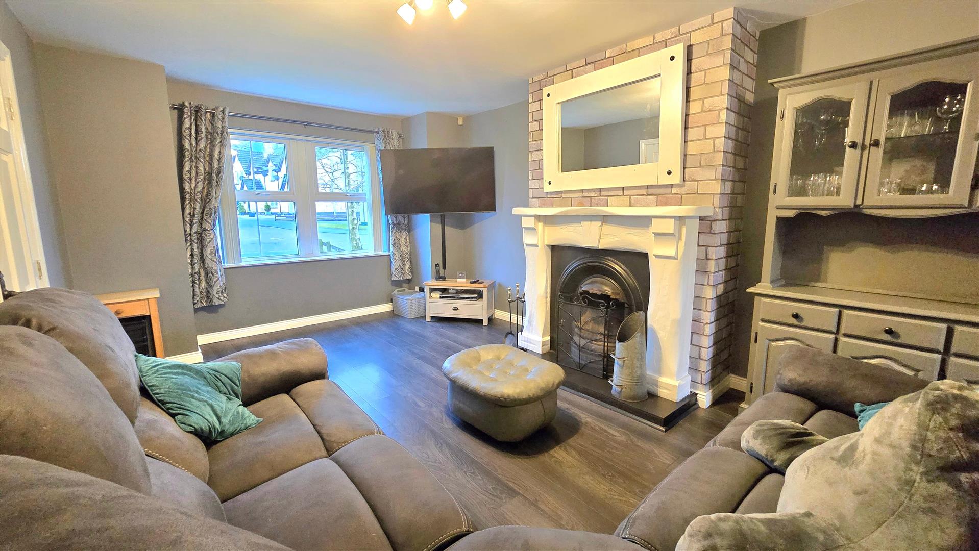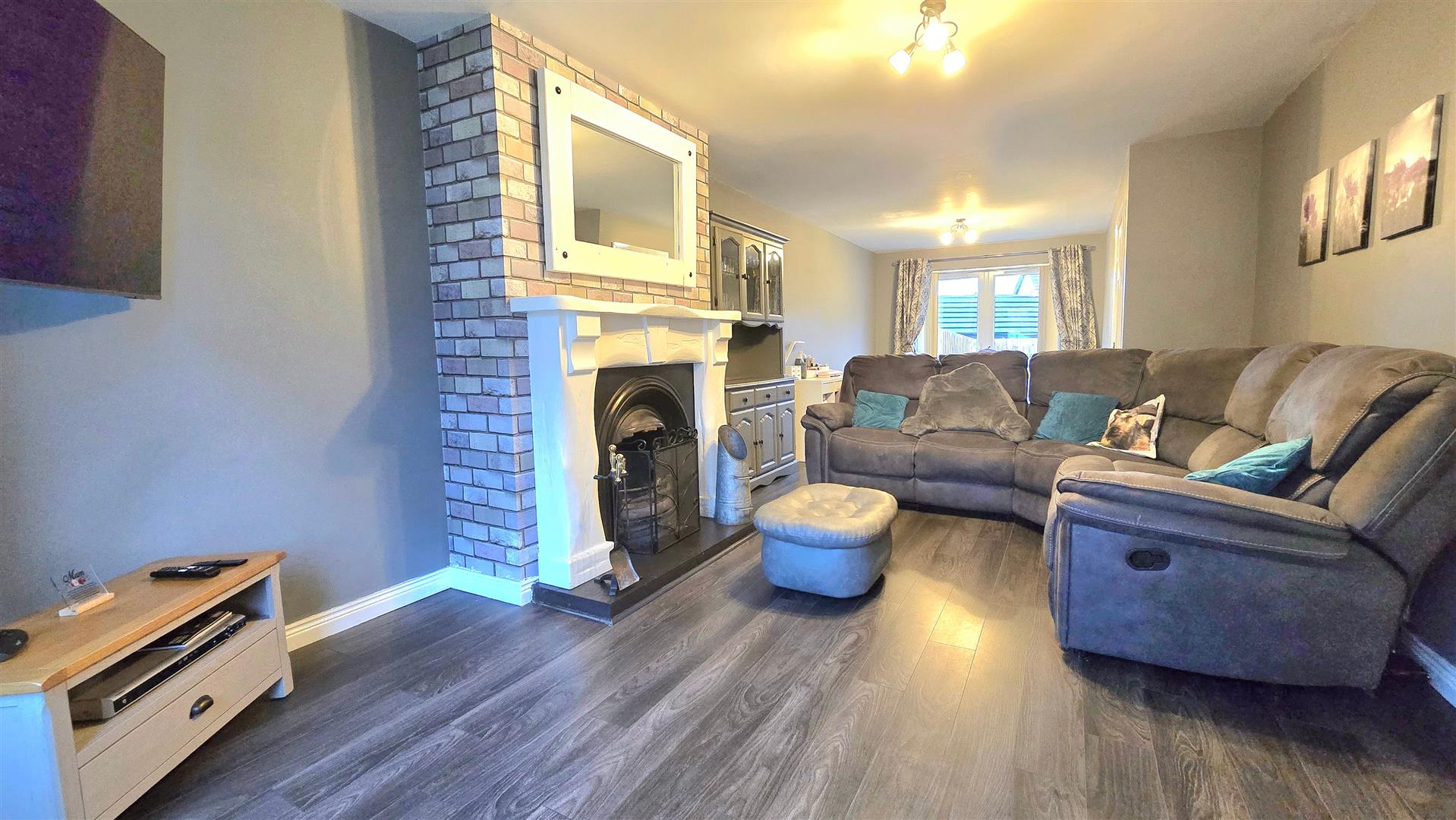 Open fire set in an Adam style fireplace surround with a tiled hearth and cast iron inset. Wood effect laminate flooring. Set in an open plan with the Dining Room.
