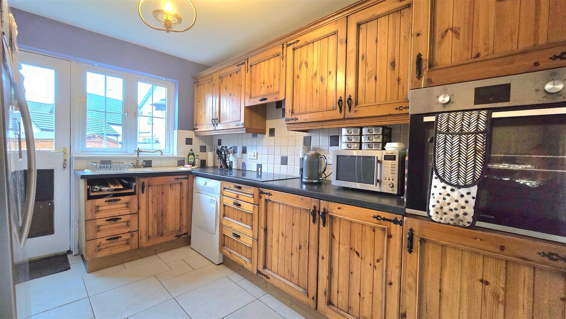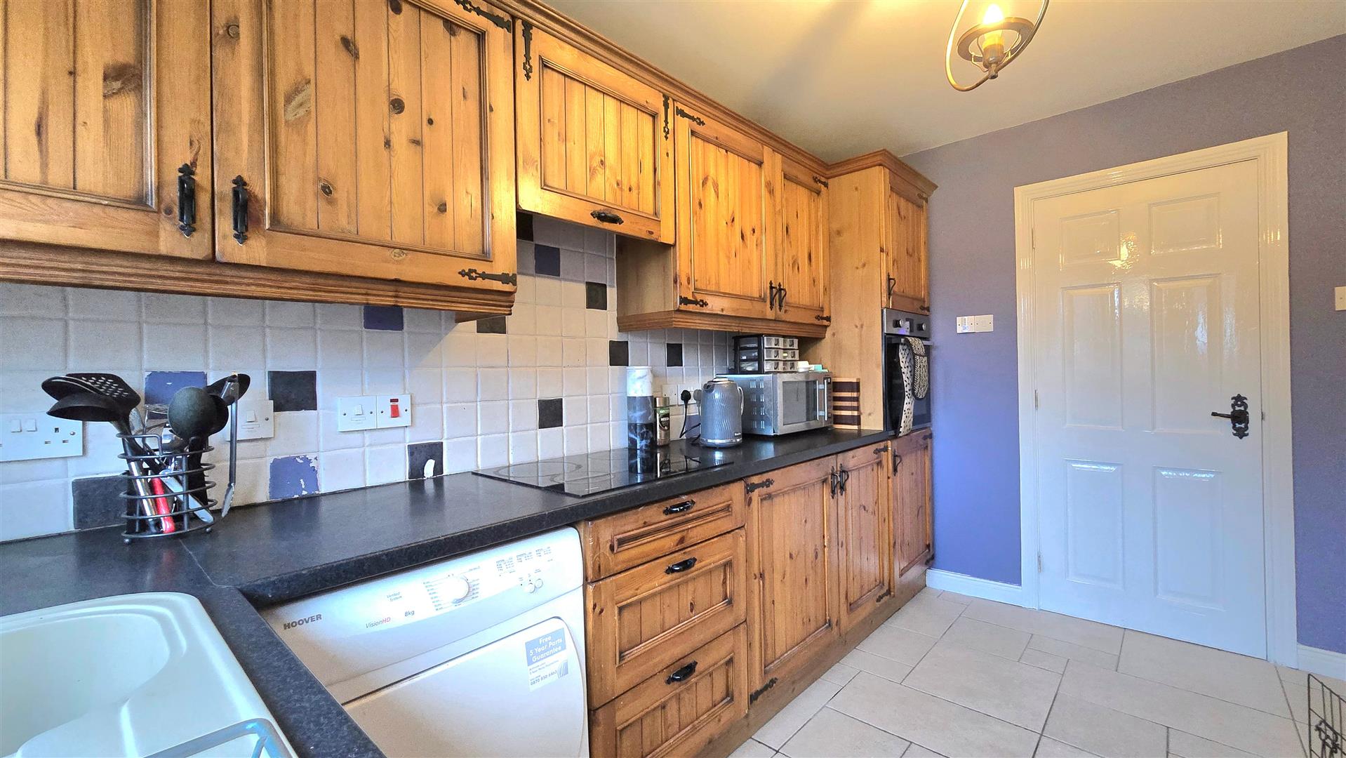 Fitted with a range of pine eye and low level units. Laminate work surfaces with tiled splashback areas over. Electric hob with integrated extractor fan over. Eye level oven. Plumbed for washing machine. Tiled floor. PVC back door.