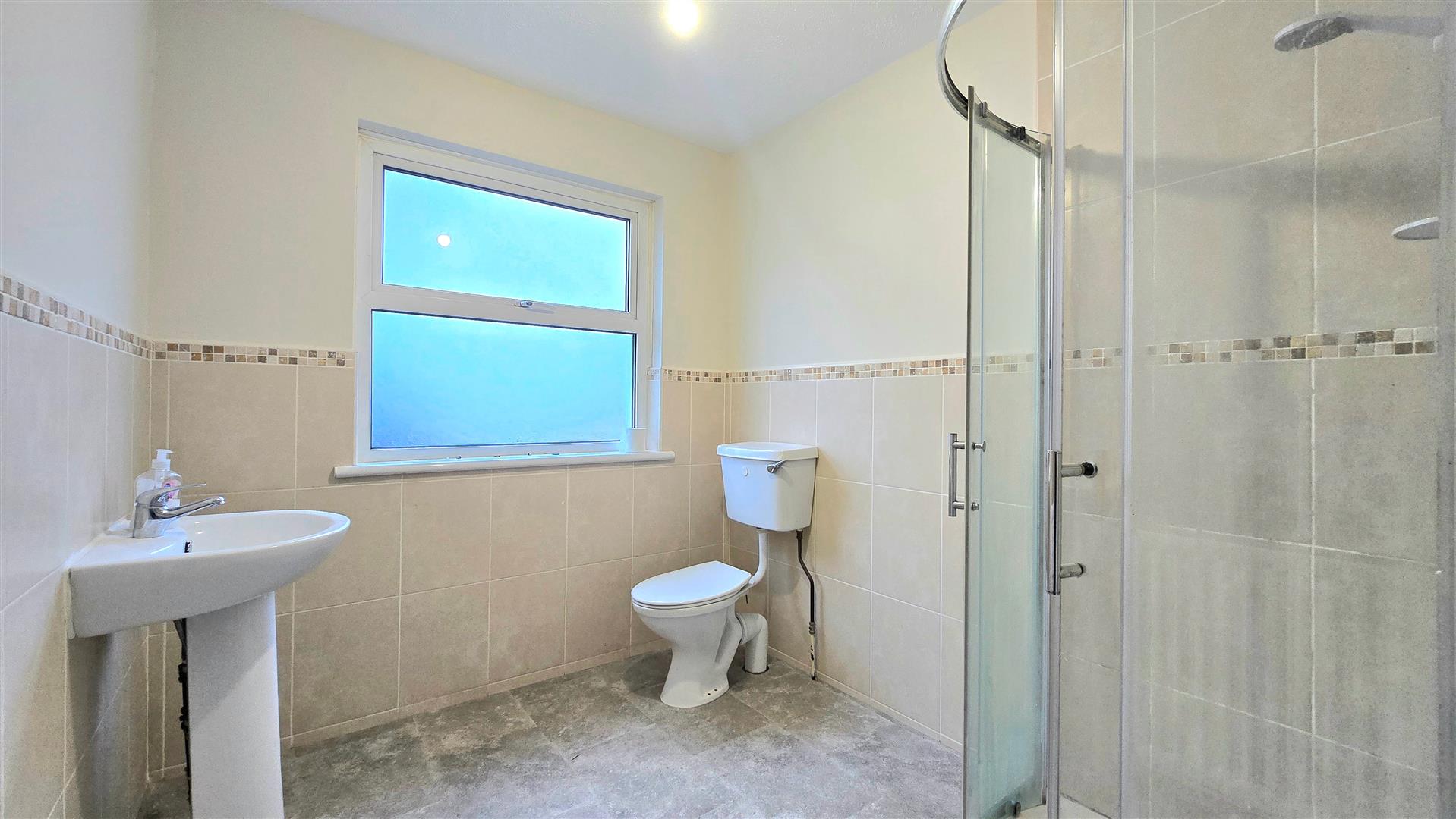 Fitted with a white WHB, WC and shower cubicle with electric shower. Tiled splashback areas.