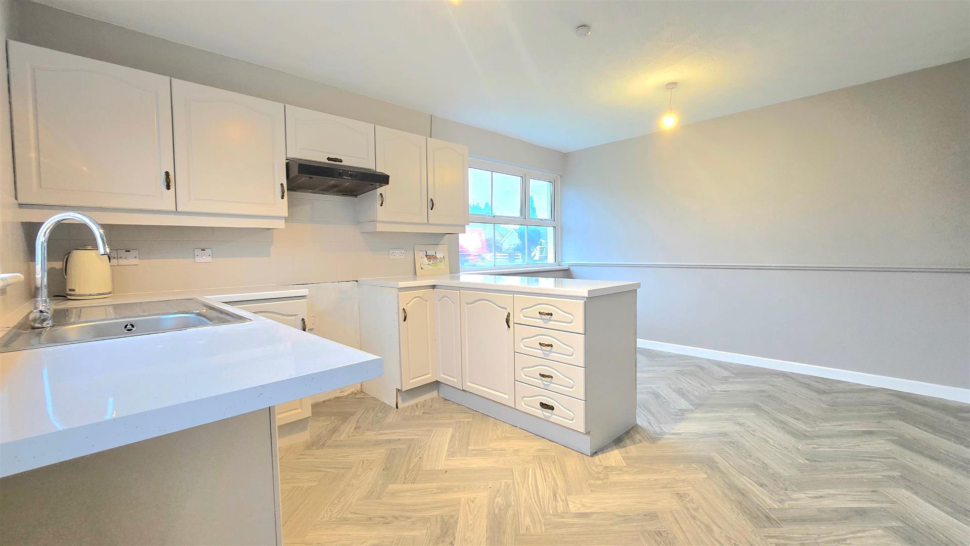 Fitted kitchen with a range of eye and low level units. Formica worktops with tiled splashback areas. Space for cooker with integrated extractor above. Dining area. PVC Back door.