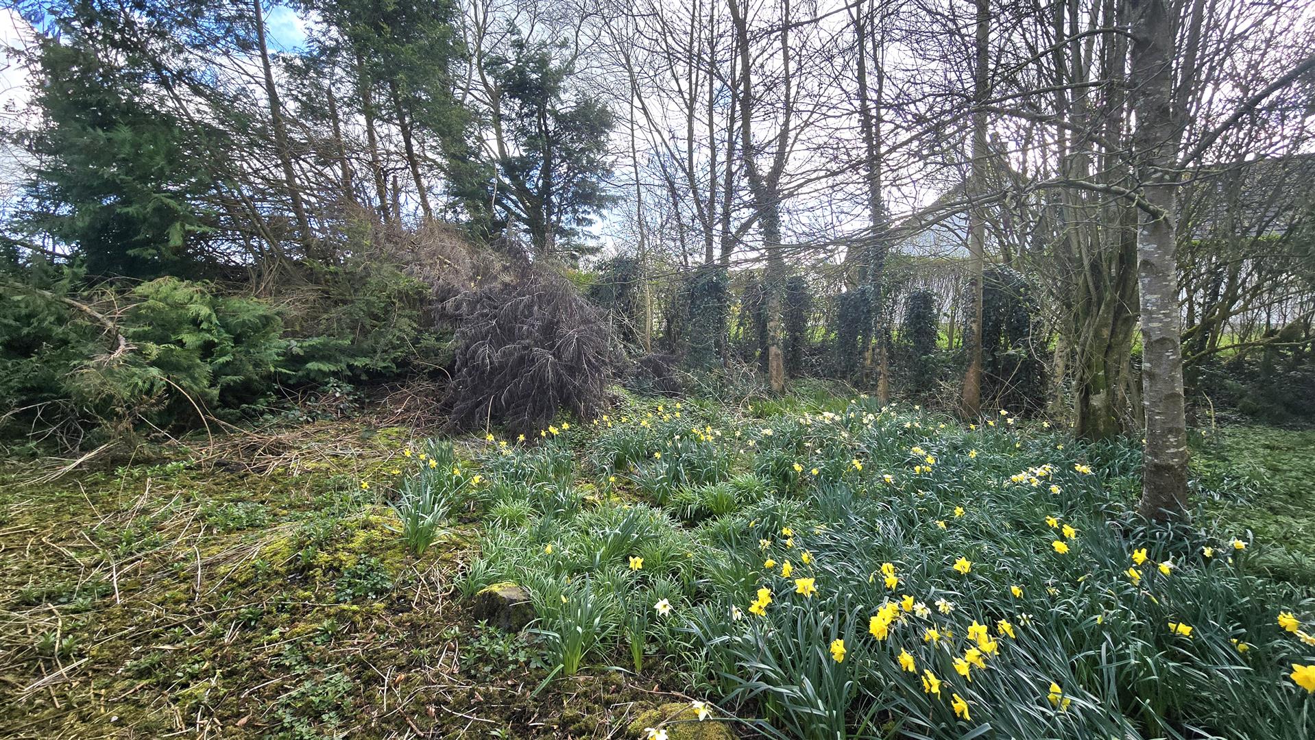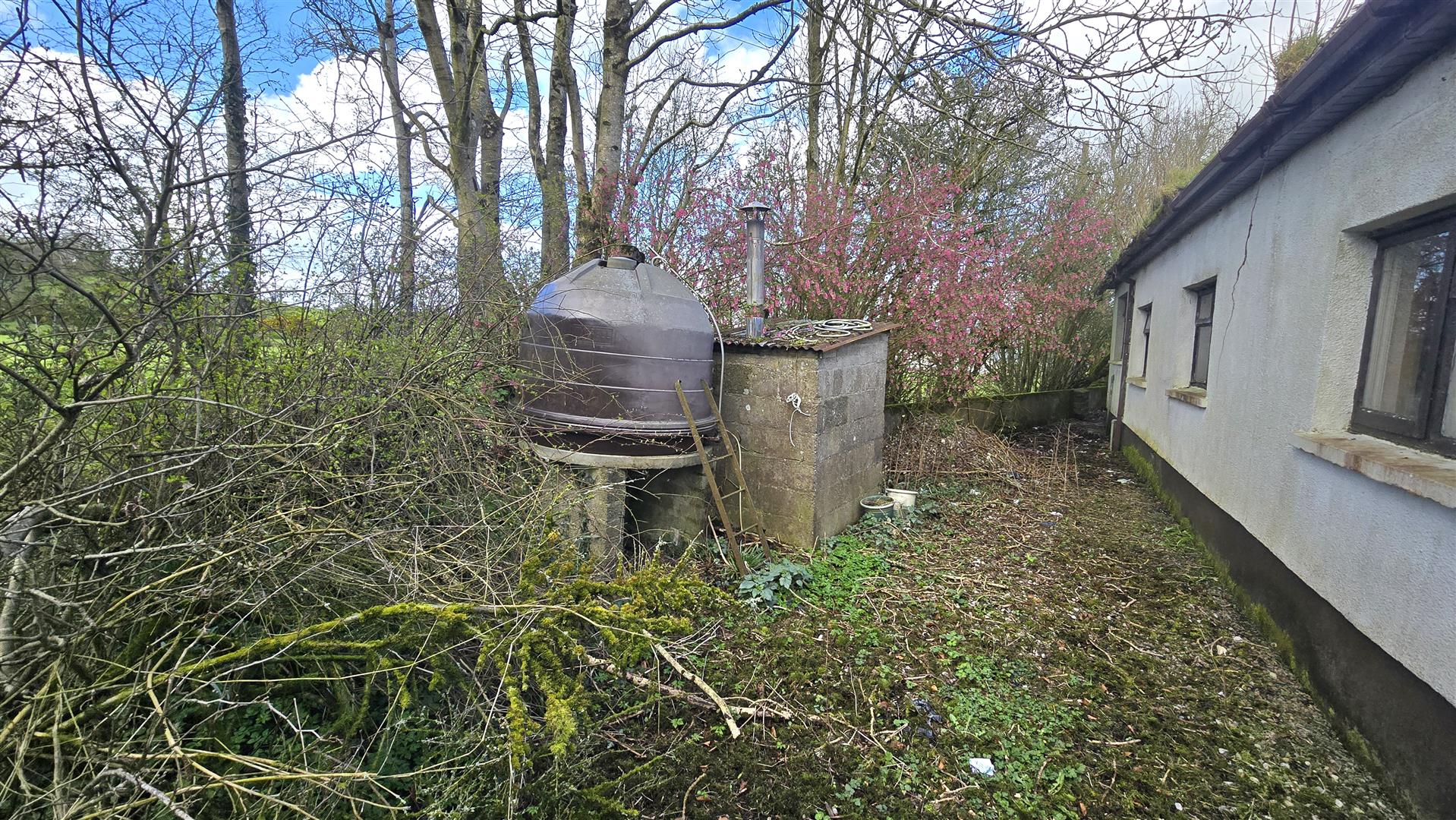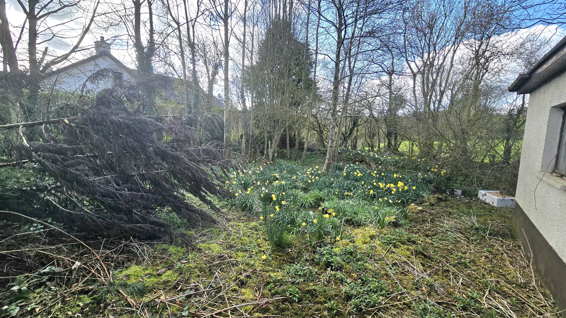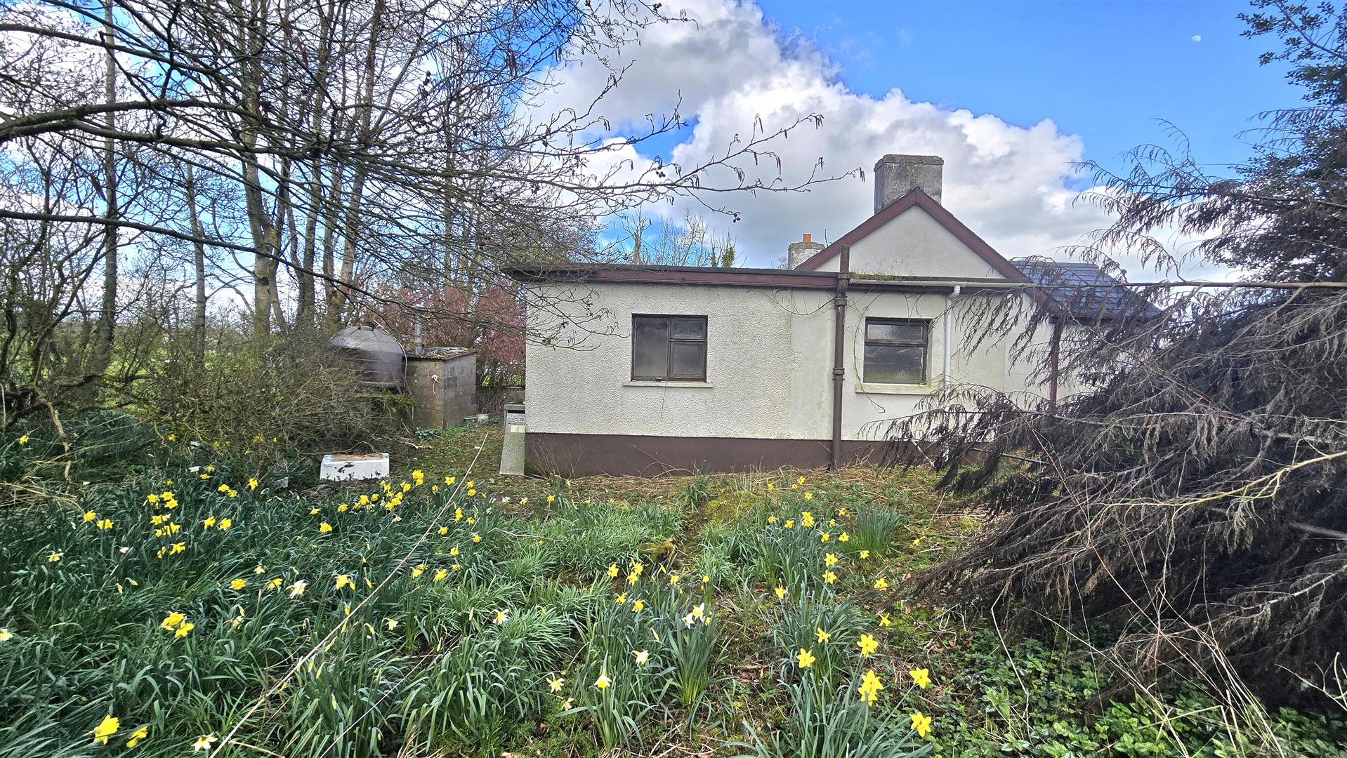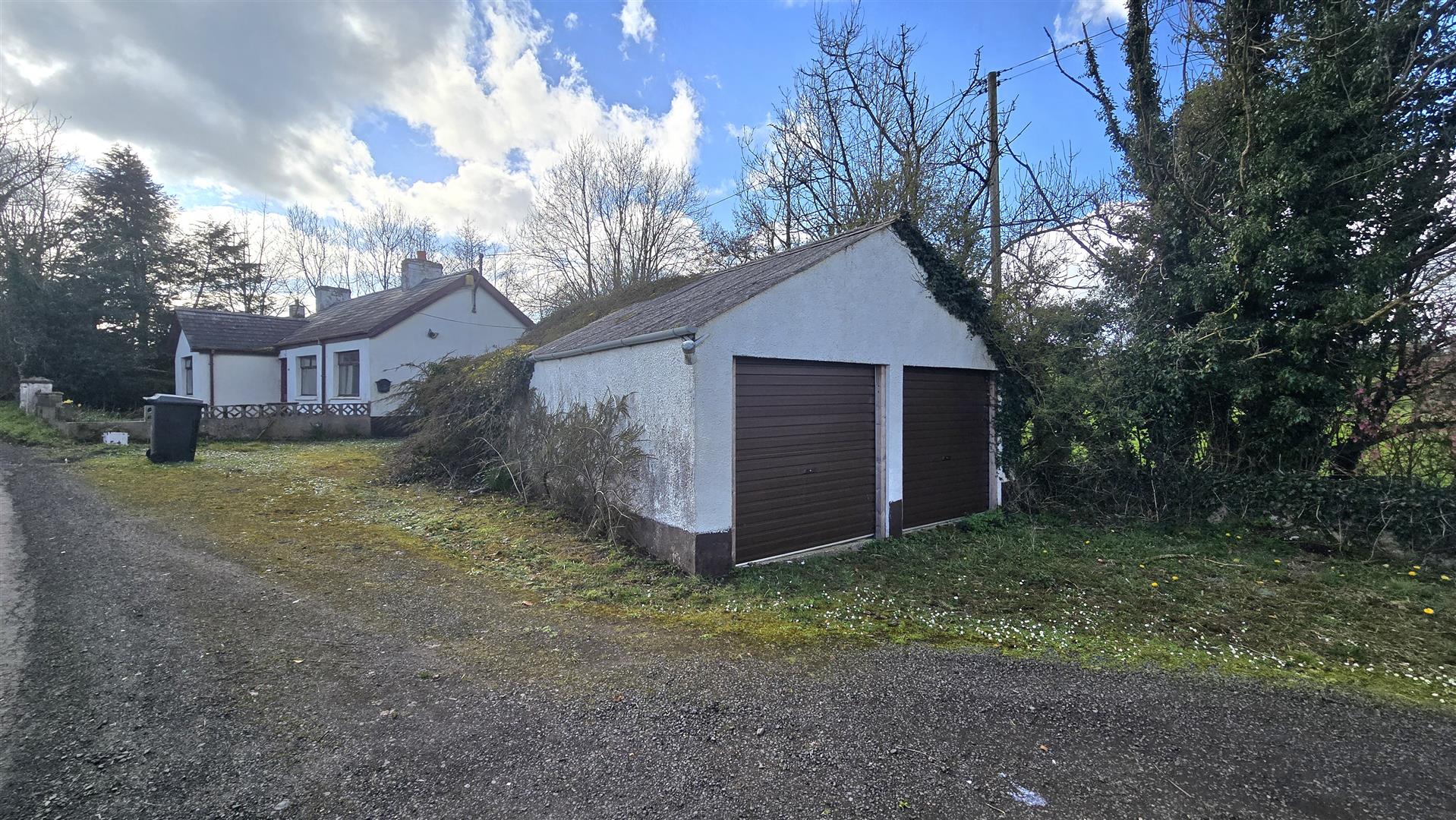 The bungalow is set on a site of approximately 0.25 acres, with garden areas to the front, side and rear. There is a detached double garage to the right of the property, again in need of renovations. The site enjoys ample space for car parking, and a small stream runs to the rear of the property.