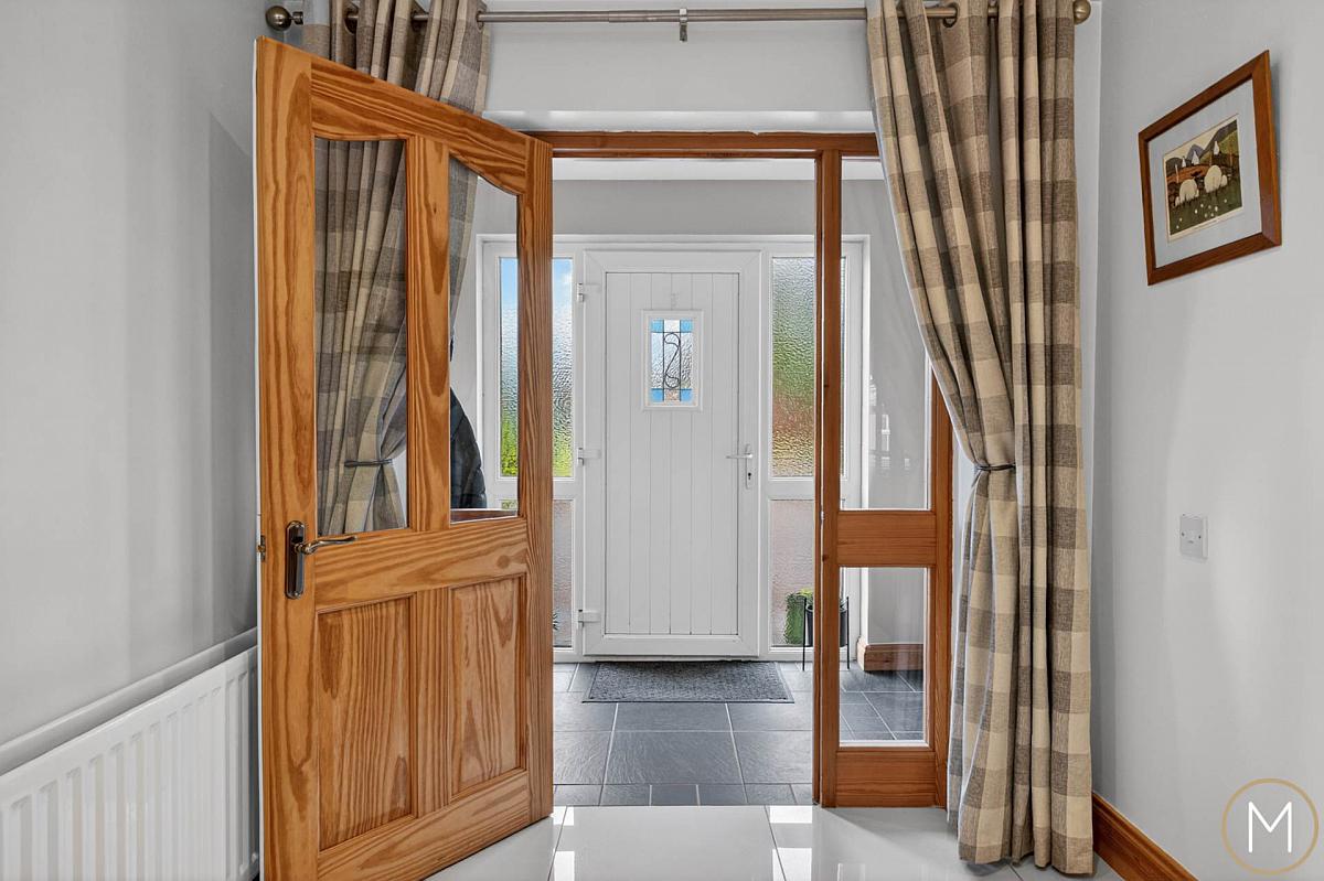 Upon arrival, the property immediately impresses with its presence and well-maintained surroundings. You are welcomed through a tiled porch into a striking entrance hallway, setting the tone for the quality and space that continues throughout the home.