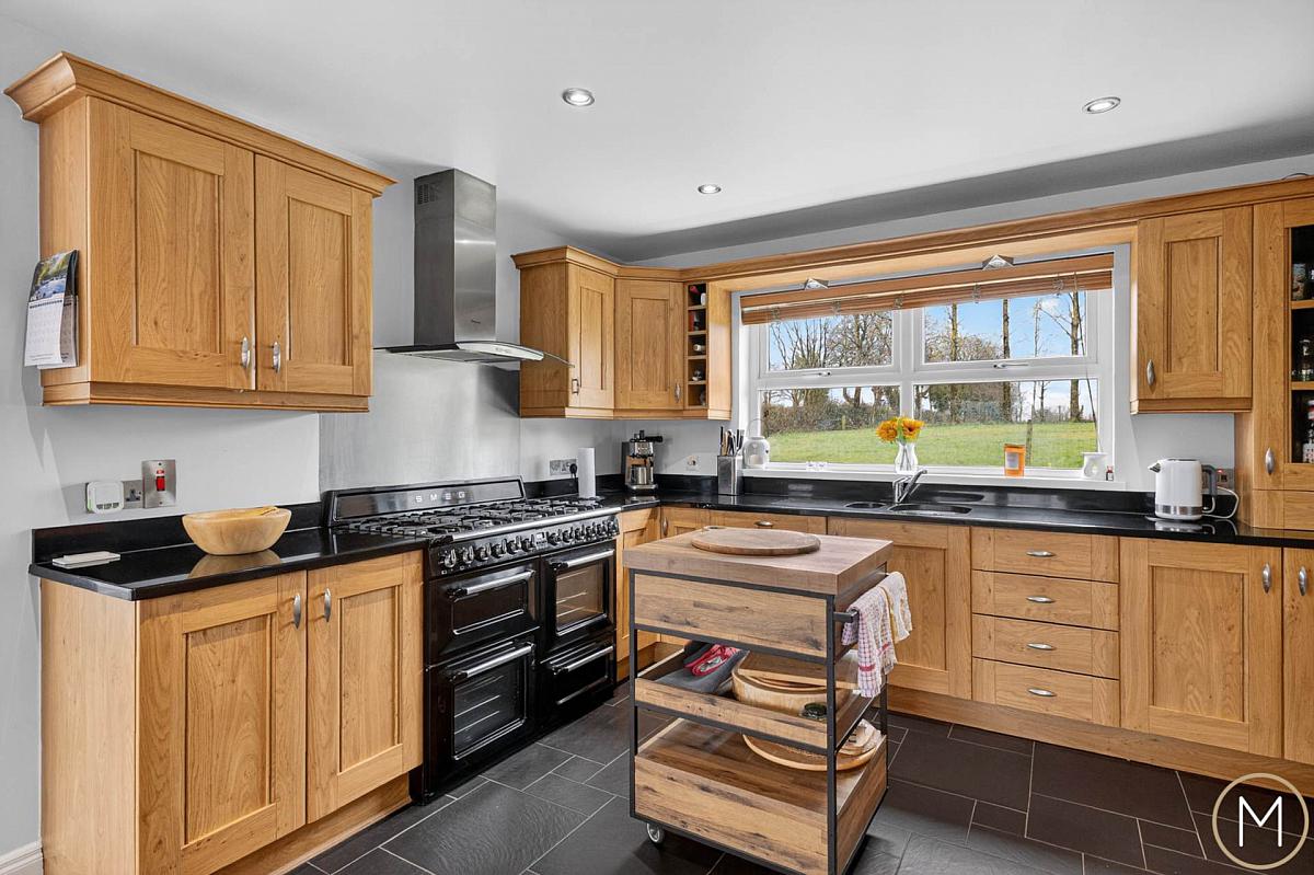 Contemporary fitted kitchen comprising of an excellent range of high and low level units; glazed display units; wine racking; Range style cooker with stainless steel extractor fan with glss canopy; integrated dishwasher; space for Amercian style fridge; 1 ½ bowl undermounted stainless steel sink unit; granite work surfaces; tiled floor; spotlighting