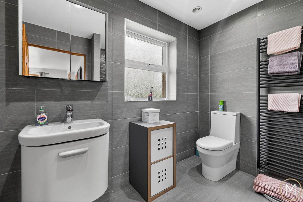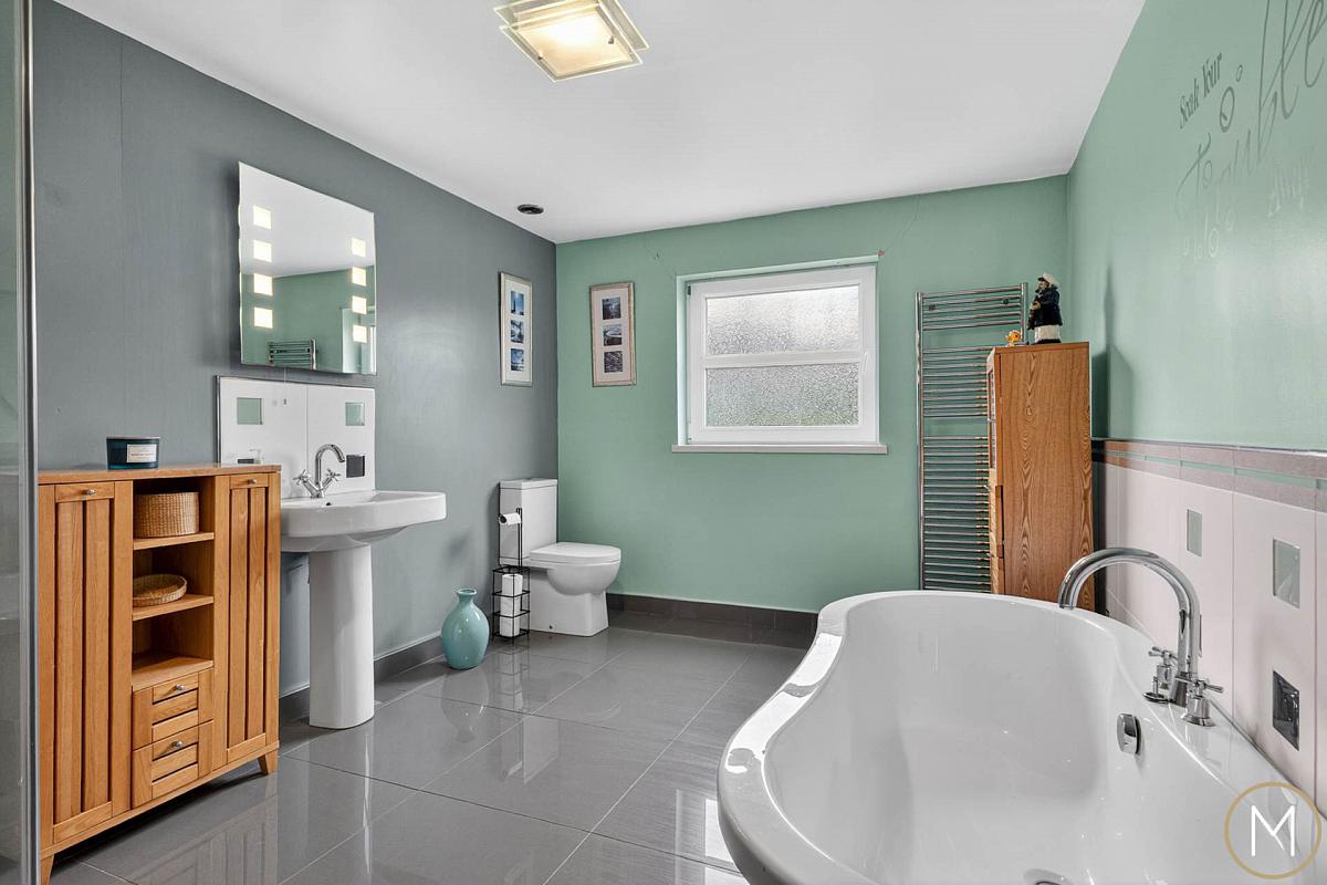 The first floor continues to impress, offering five generously proportioned double bedrooms. The master suite is particularly noteworthy, featuring a walk-in dressing room and a luxurious ensuite shower room, creating a private retreat within the home. The main family bathroom is finished to a high standard with a contemporary white suite, including a freestanding bath and separate shower cubicle perfectly combining style and comfort.