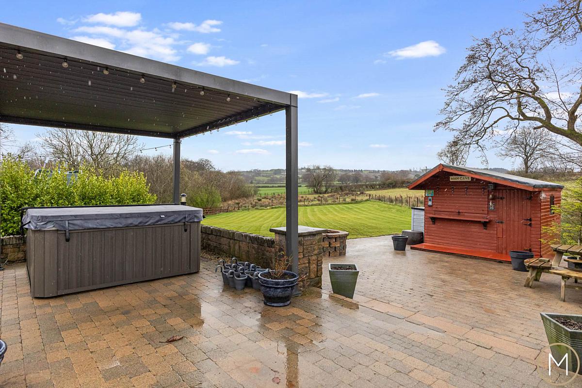 Large brick pavior patio to rear with Jacuzzi and pergola