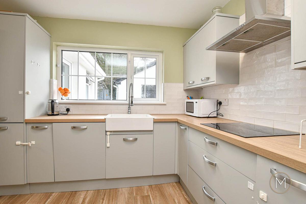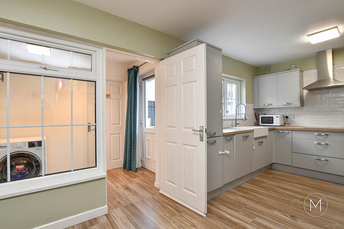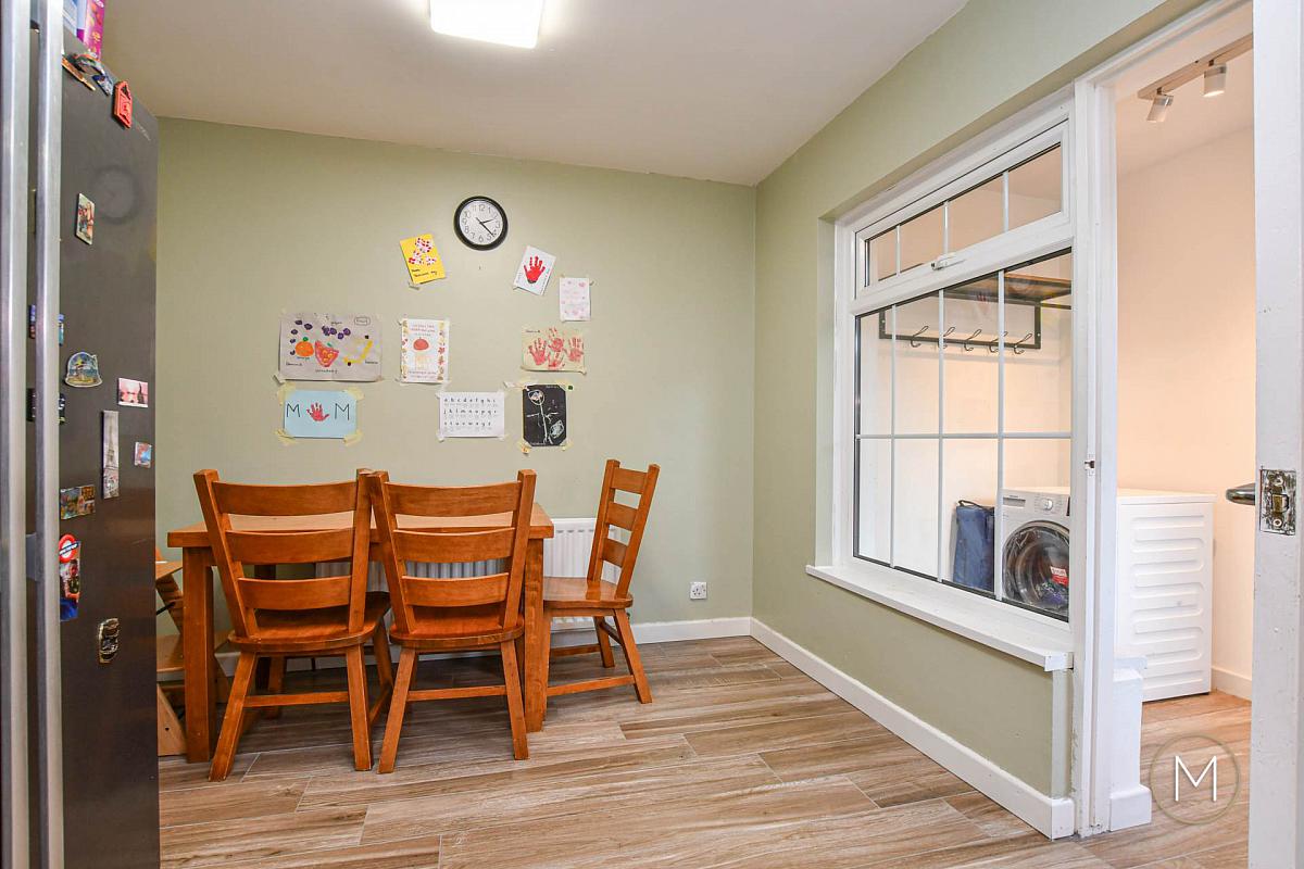 The heart of the home is the contemporary fitted kitchen, complete with a charming Belfast sink, sleek cabinetry, and an open-aspect dining area perfect for entertaining or casual family meals. A larder-style cupboard provides handy extra storage, while the adjoining utility space adds everyday convenience.