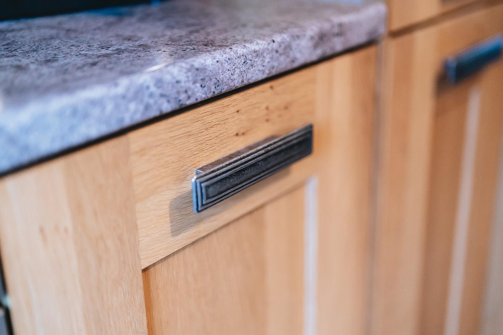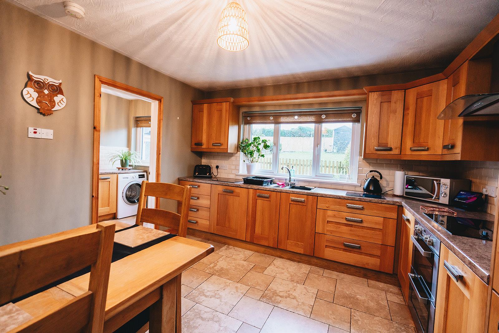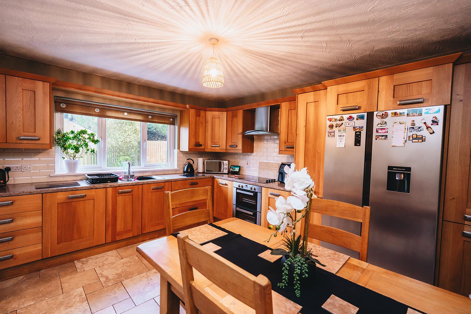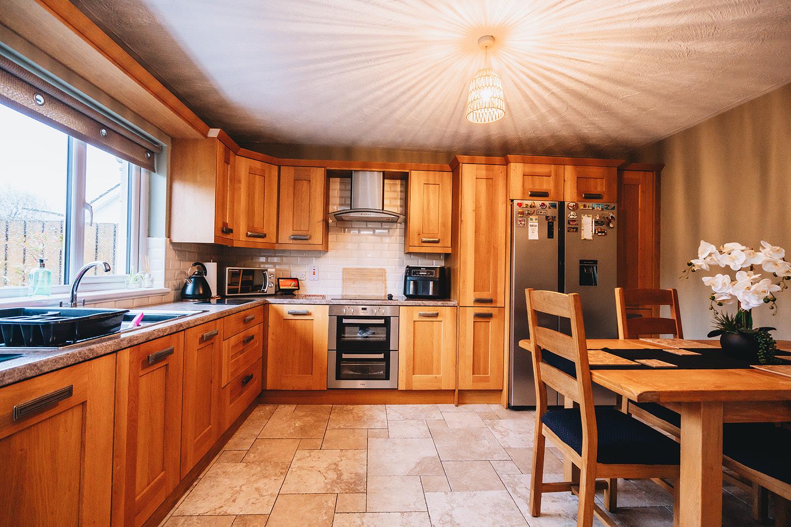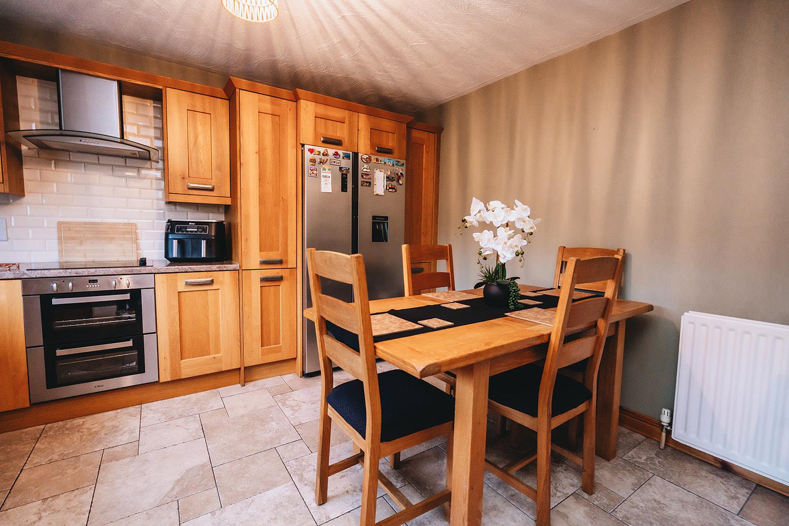 A range of high and low level oak finish units comprising window pelmet, housing for fridge freezer, double under oven, electric hob, extractor fan, laminate worksurface incorporating 1 1/2 bowl stainless steel sink inset, tiled between units, tiled floor and dining space.