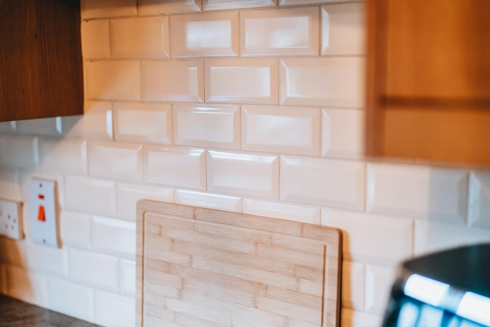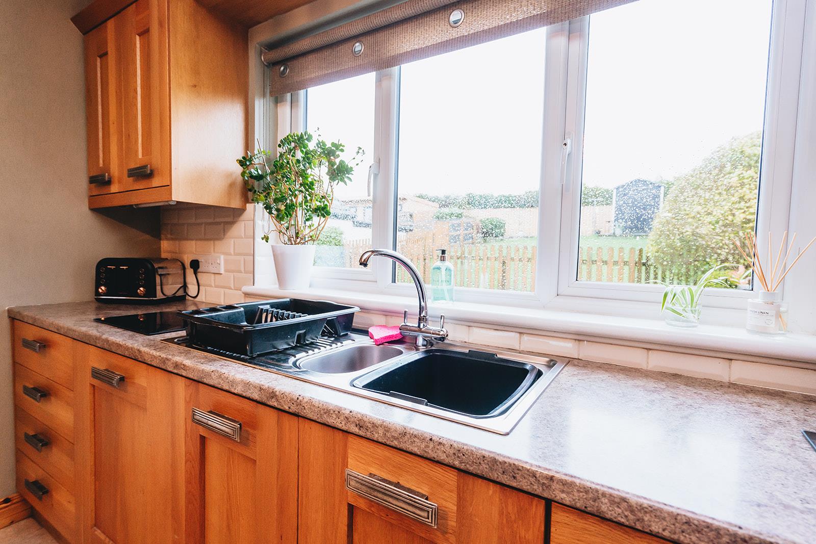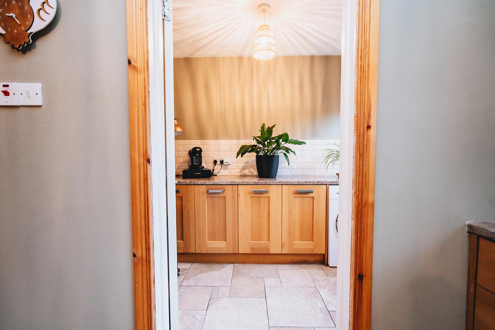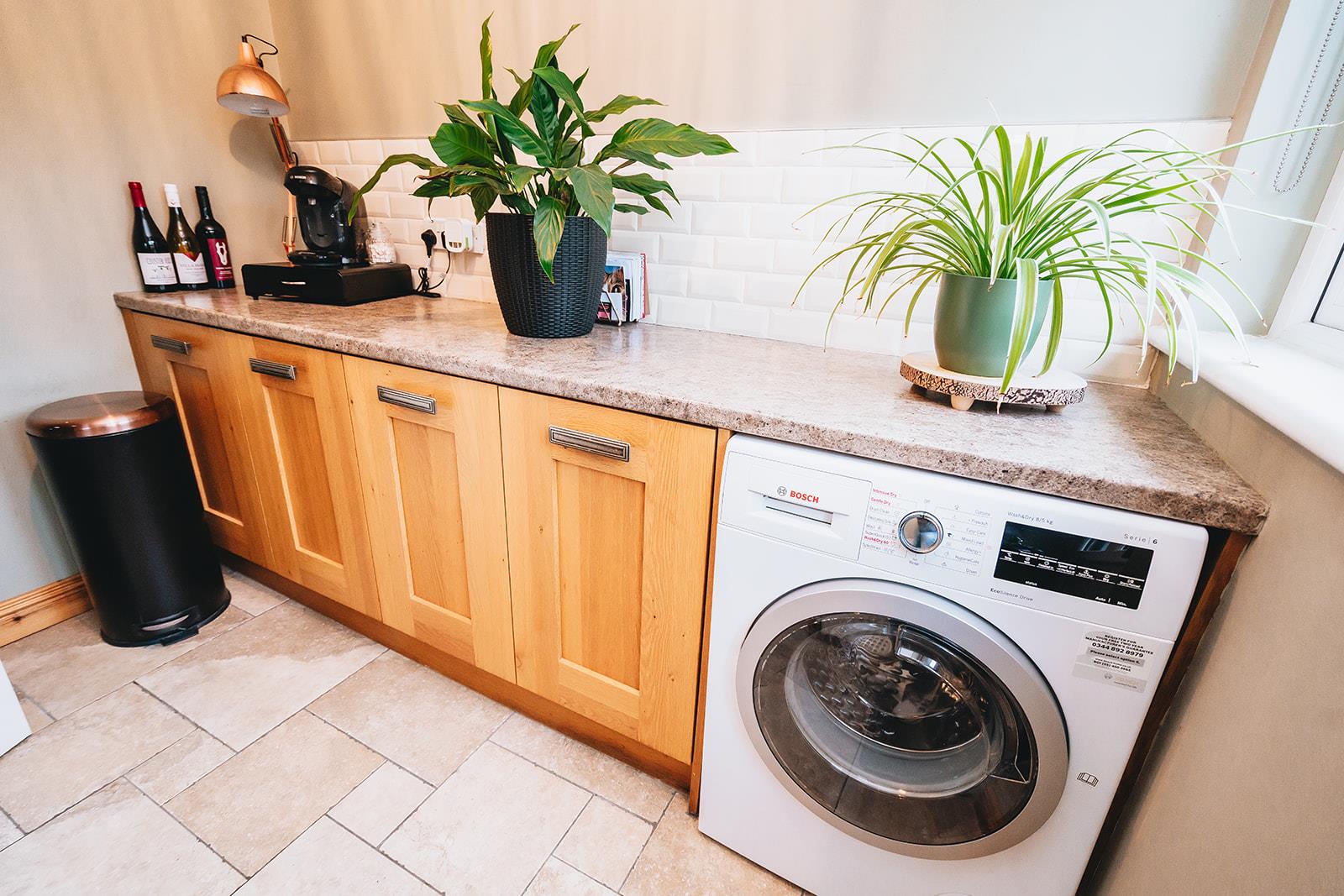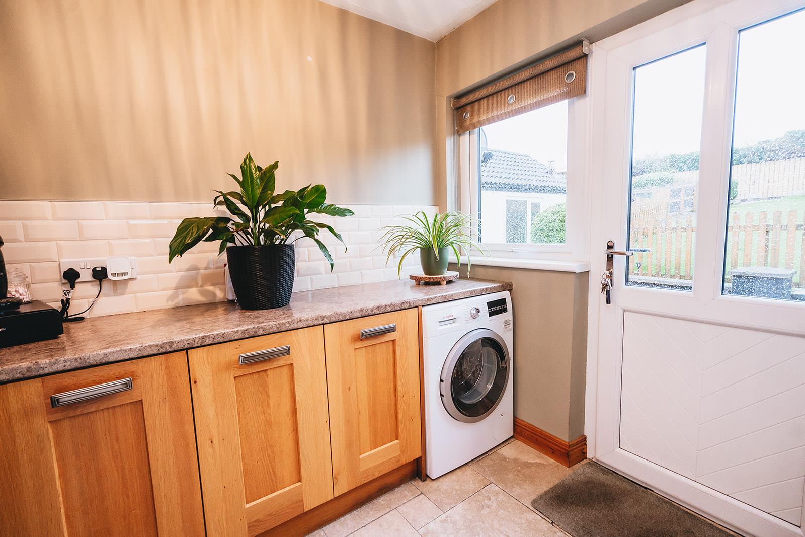 Laminated worksurface with under cupboard, tiled above worktop, plumbed for washing machine, tiled floor and uPVC double glazed door to rear garden.
