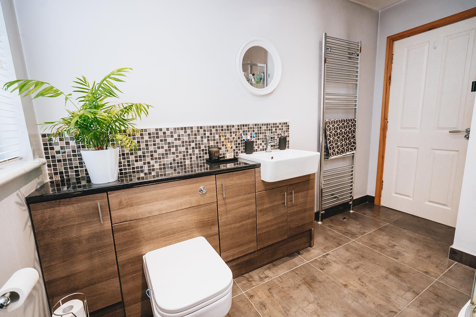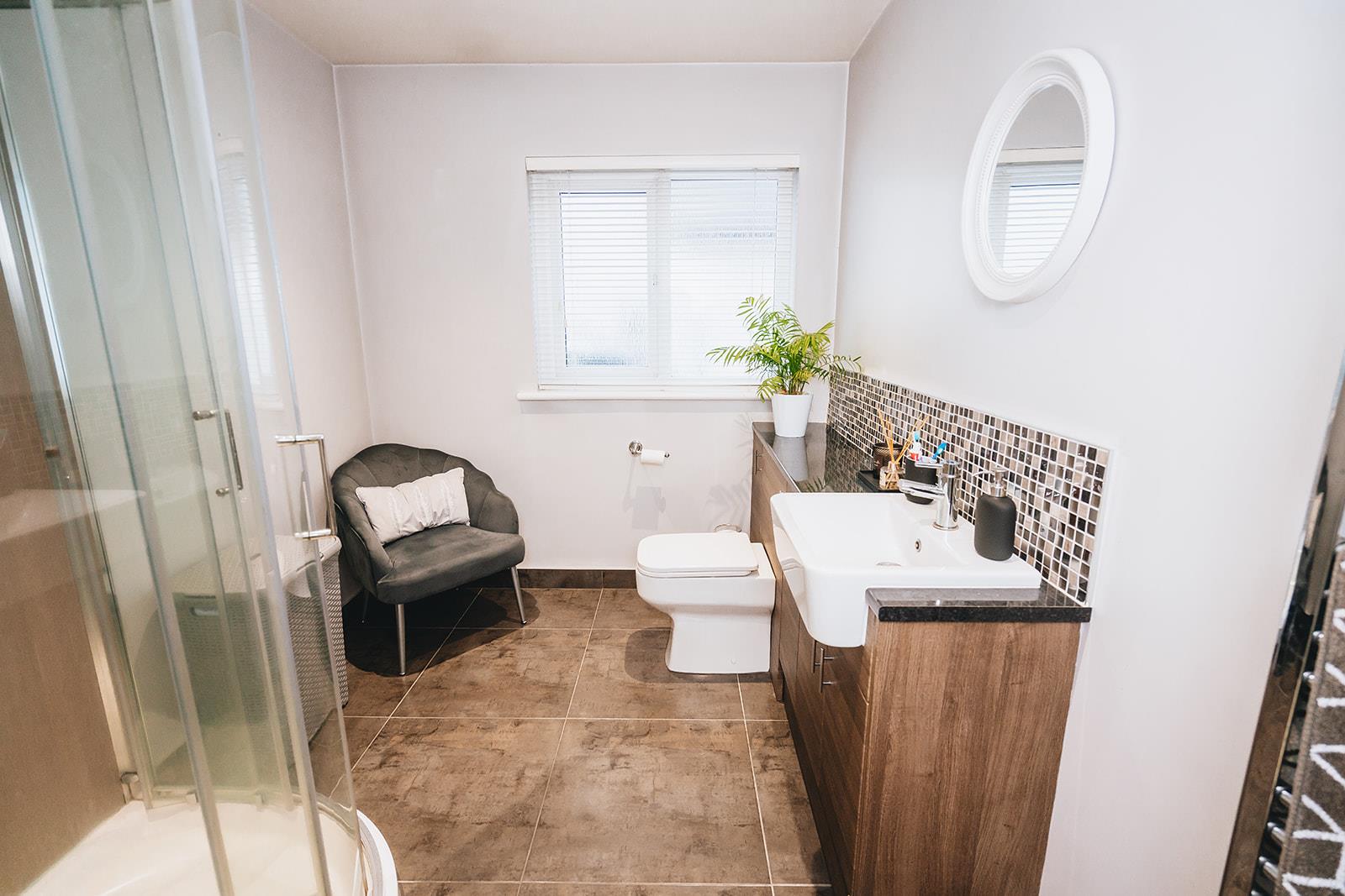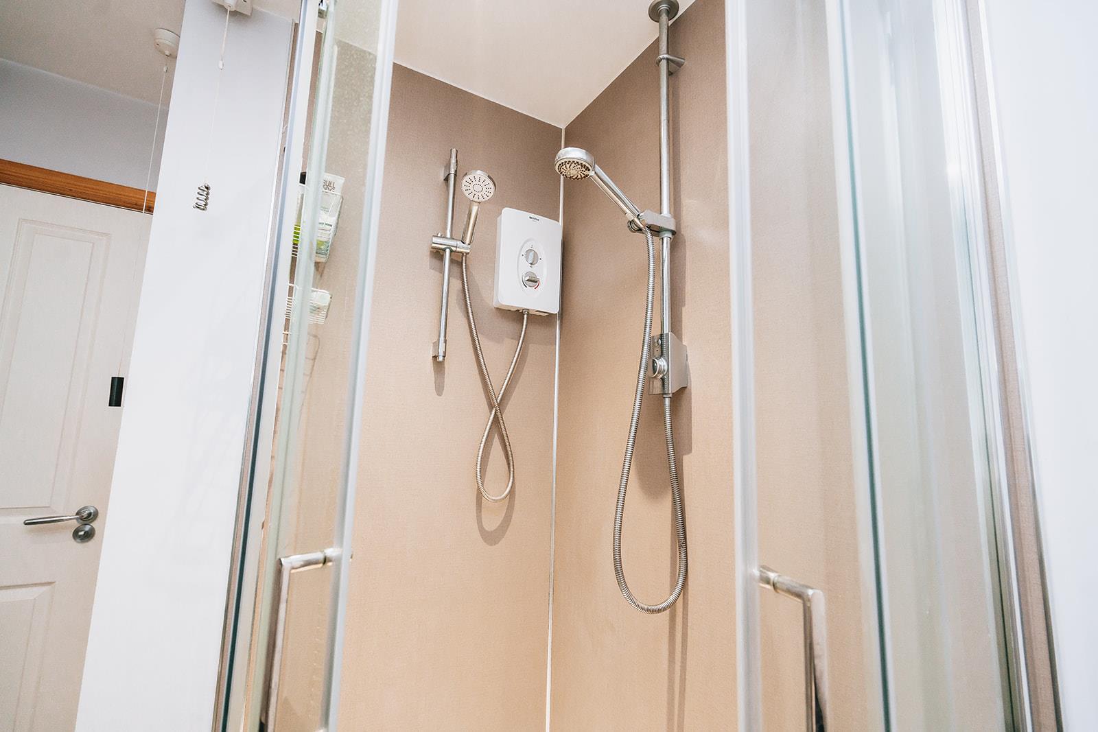 Acrylic panelled corner shower with thermostatic shower and Bristan Smile electric shower. Vanity unit with tiled splashback, combination storage, wash hand basin with mixer tap and low flush wc. Heated towel rail and tiled floor.