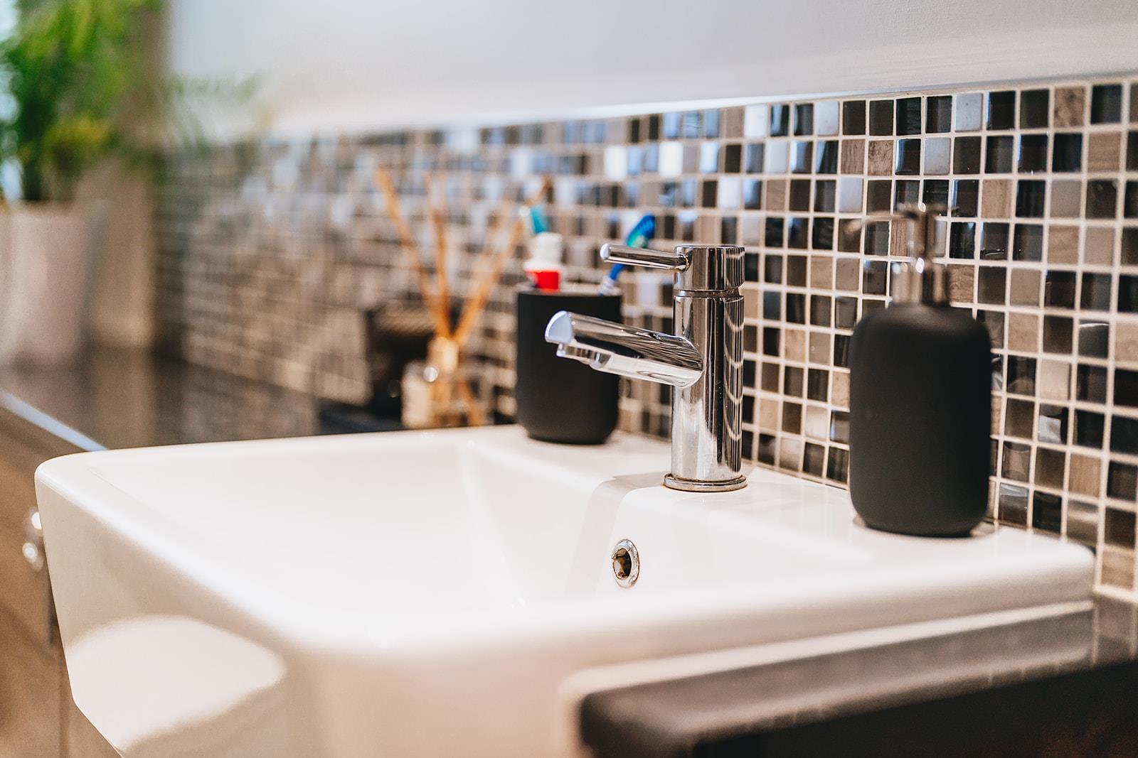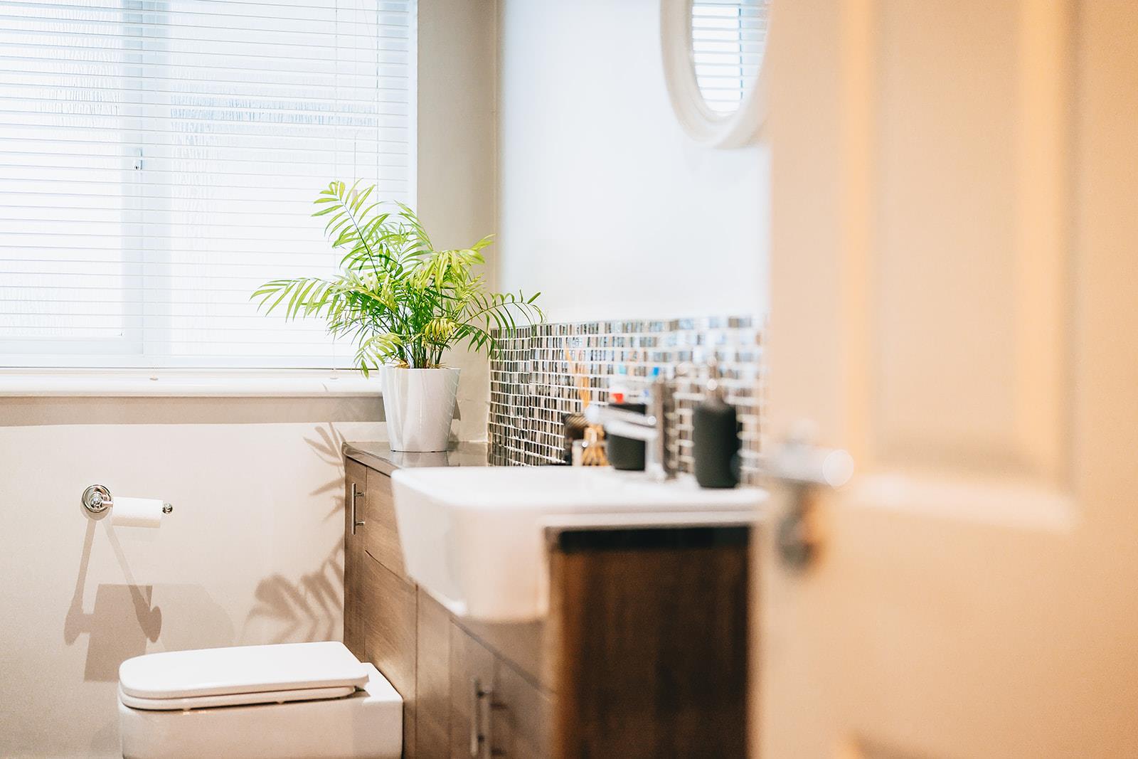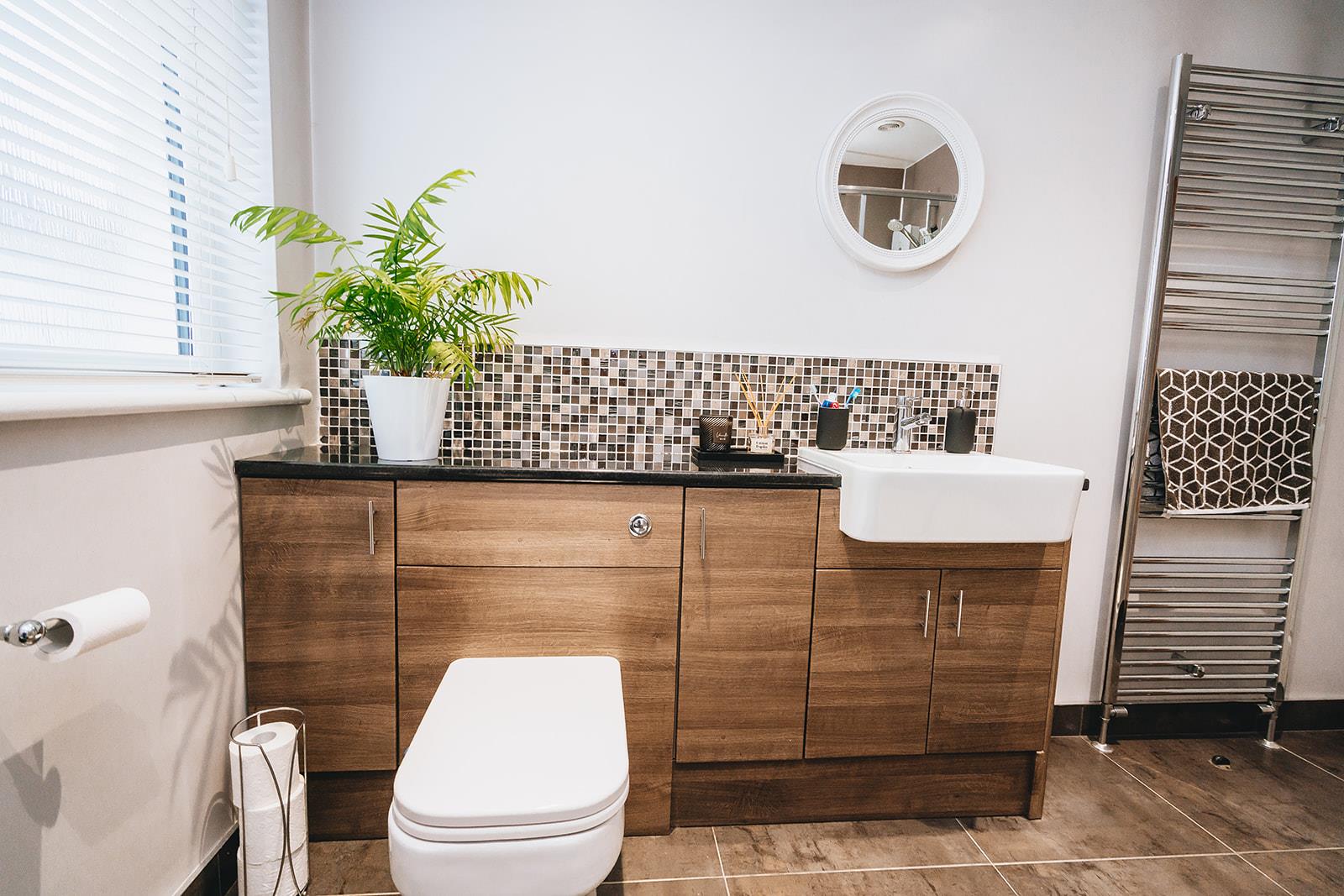 Acrylic panelled corner shower with thermostatic shower and Bristan Smile electric shower. Vanity unit with tiled splashback, combination storage, wash hand basin with mixer tap and low flush wc. Heated towel rail and tiled floor.