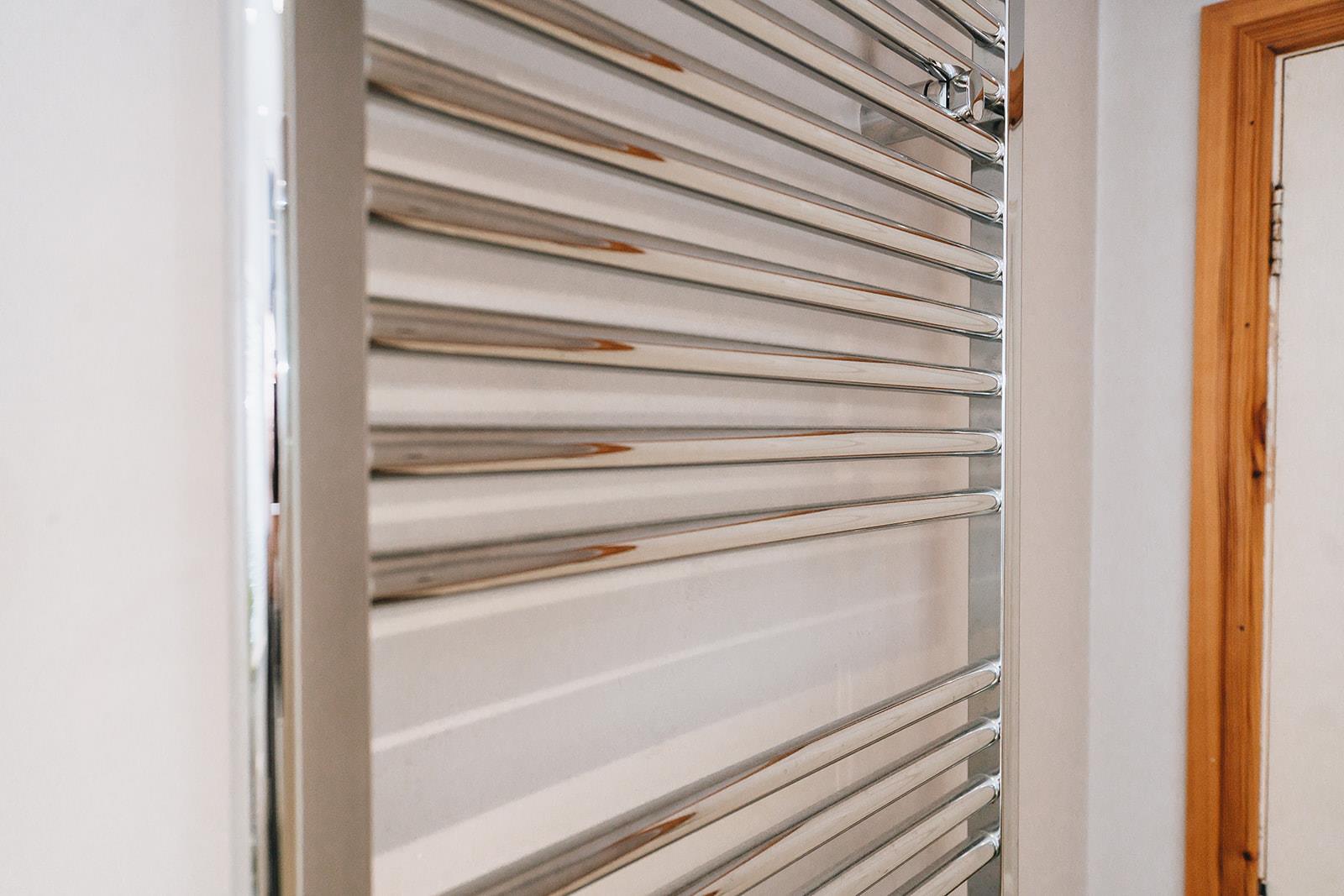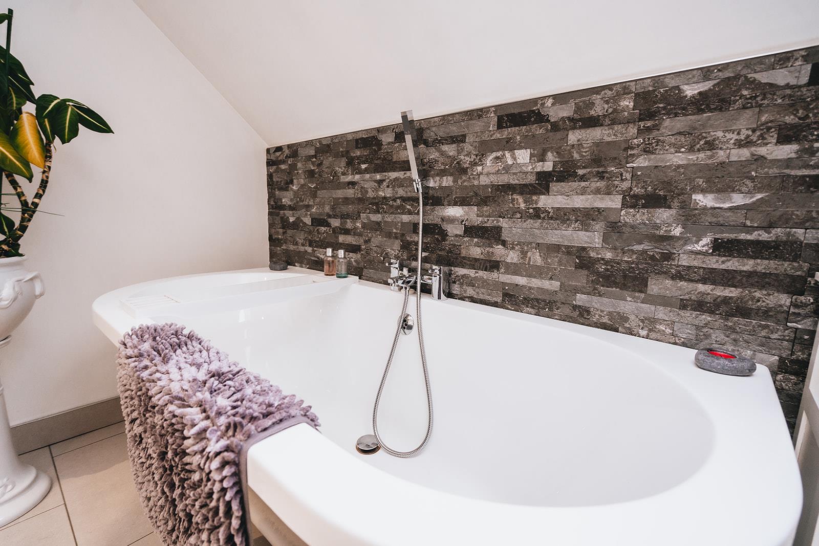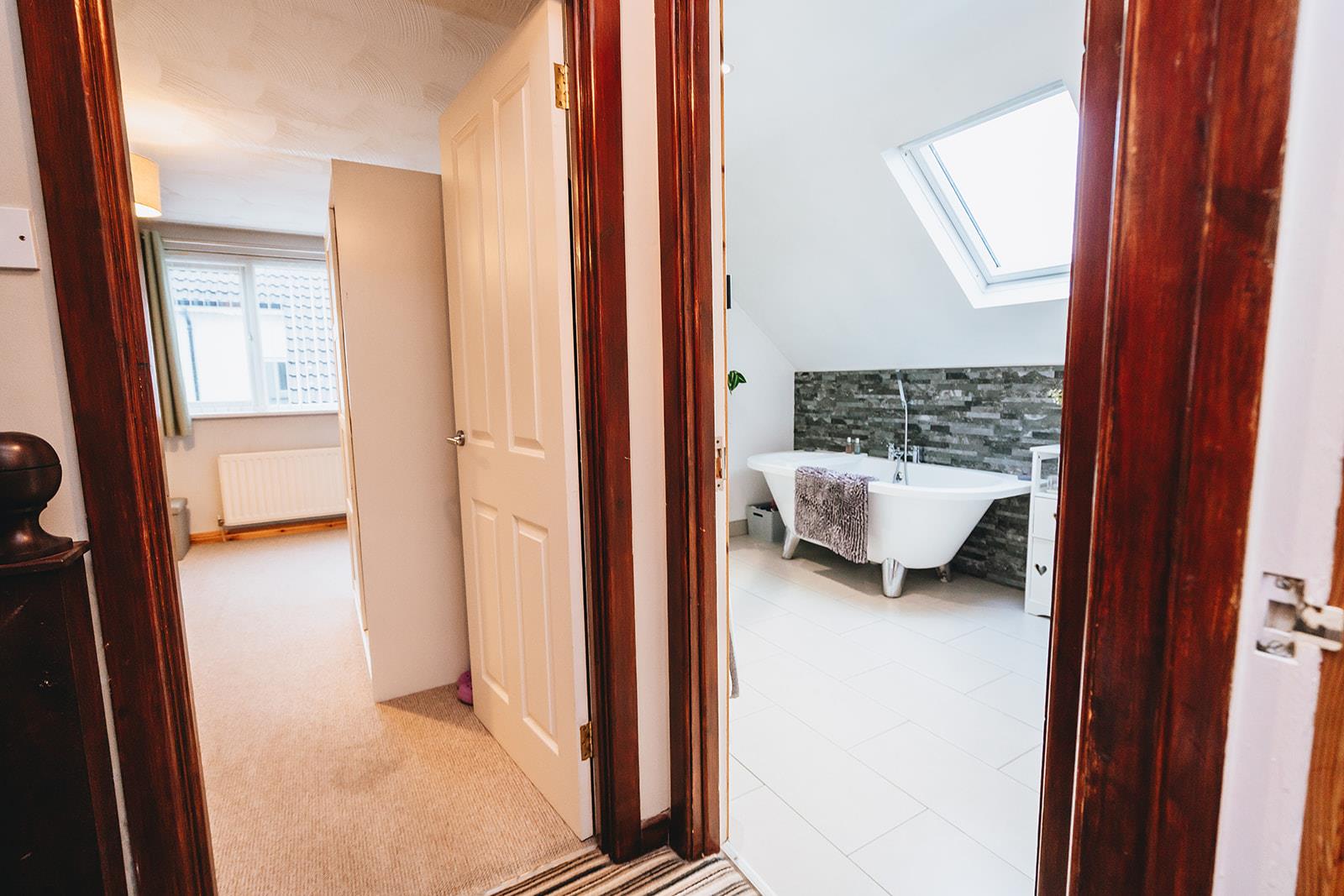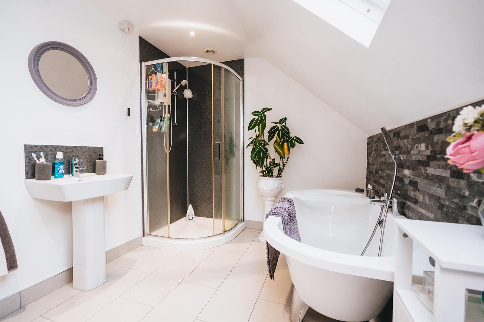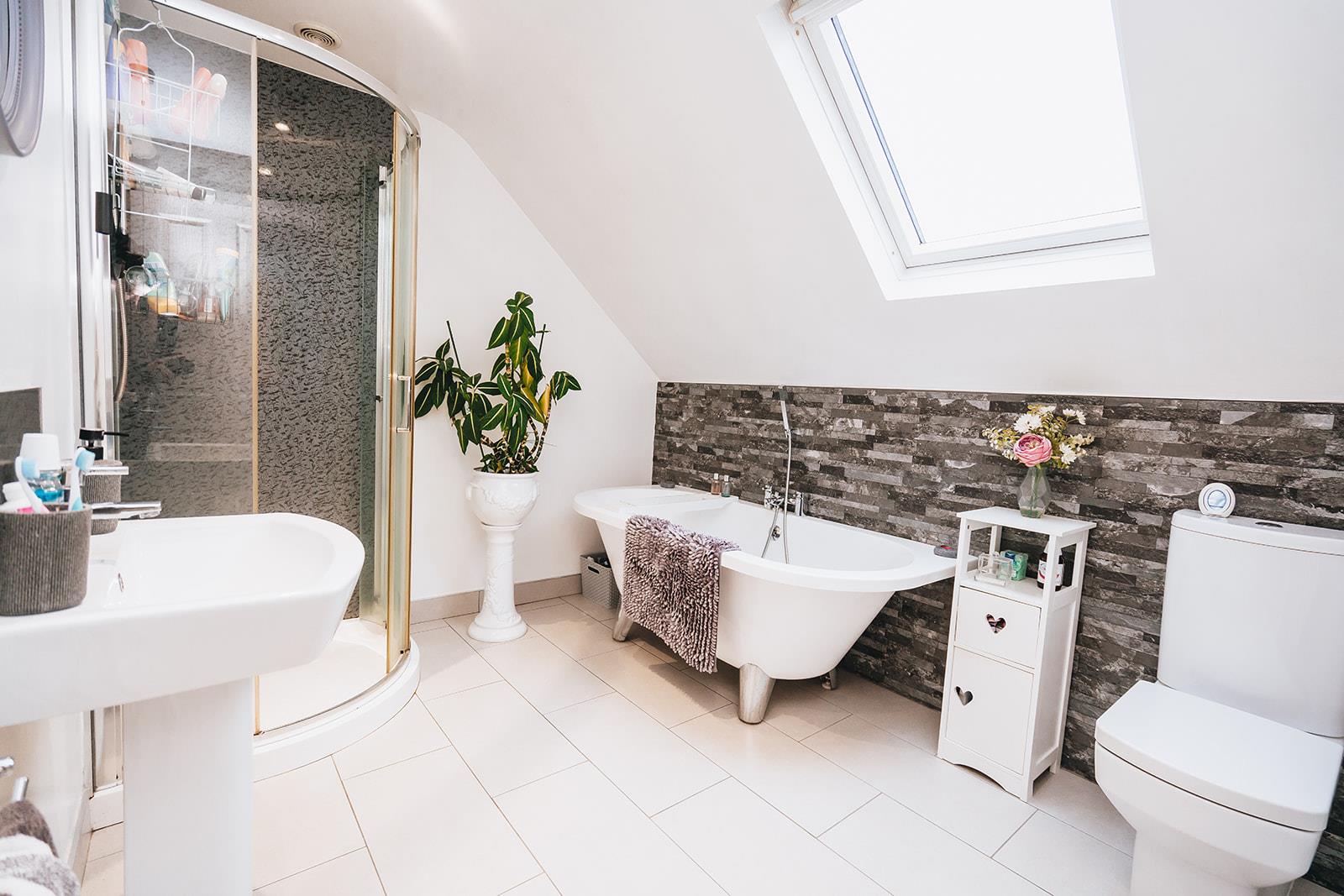 Modern bathroom comprising freestanding bath with mixer tap and telephone hand shower, pedestal wash hand basin with mixer tap and tiled splashback, low flush wc, part tiled walls, tiled floor, heated towel rail, Velux window and corner shower cubicle with Bristan Smile electric shower.