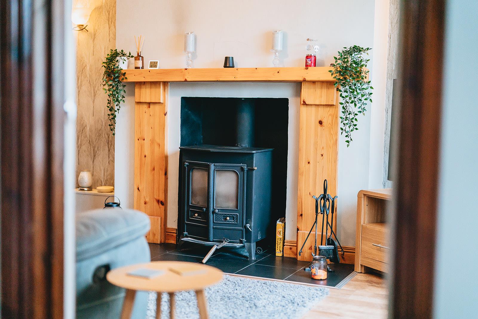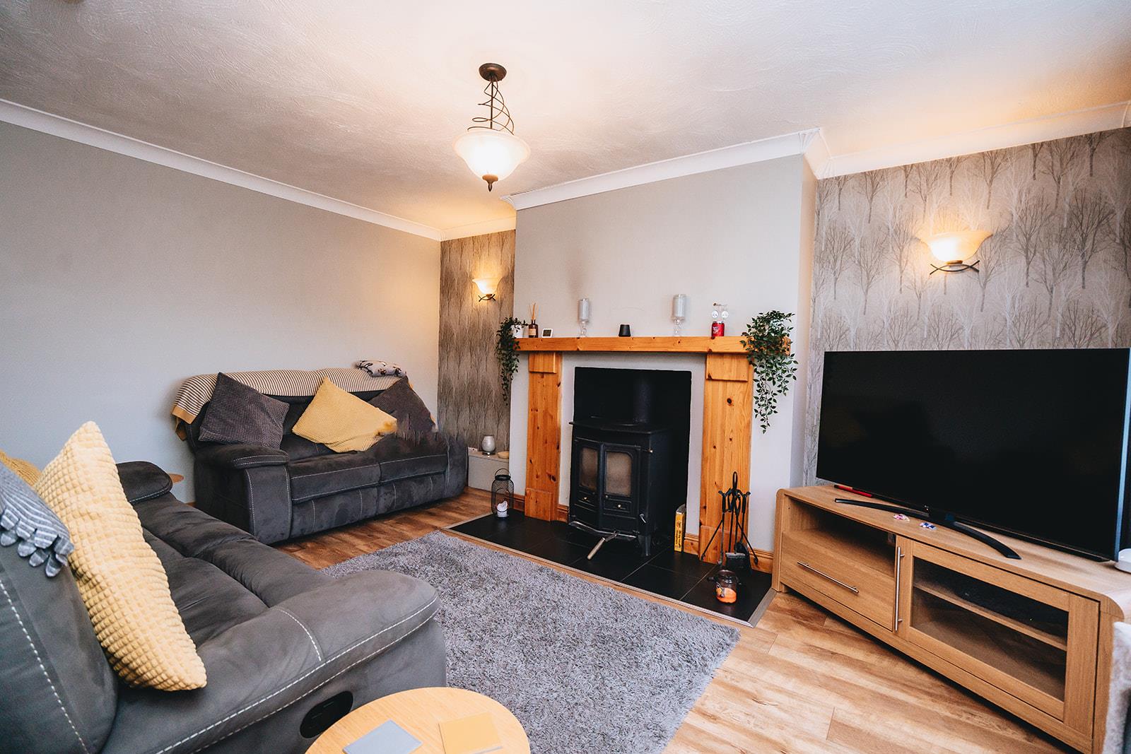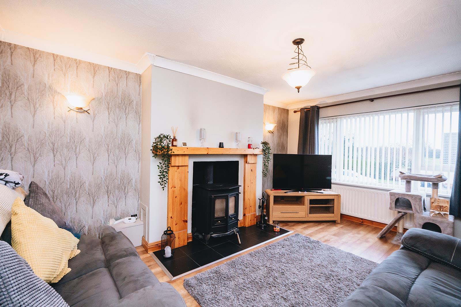 The highlight of this living space is the stove with backboiler which heats the water and radiators. Wood laminate flooring, wall lights and coving.