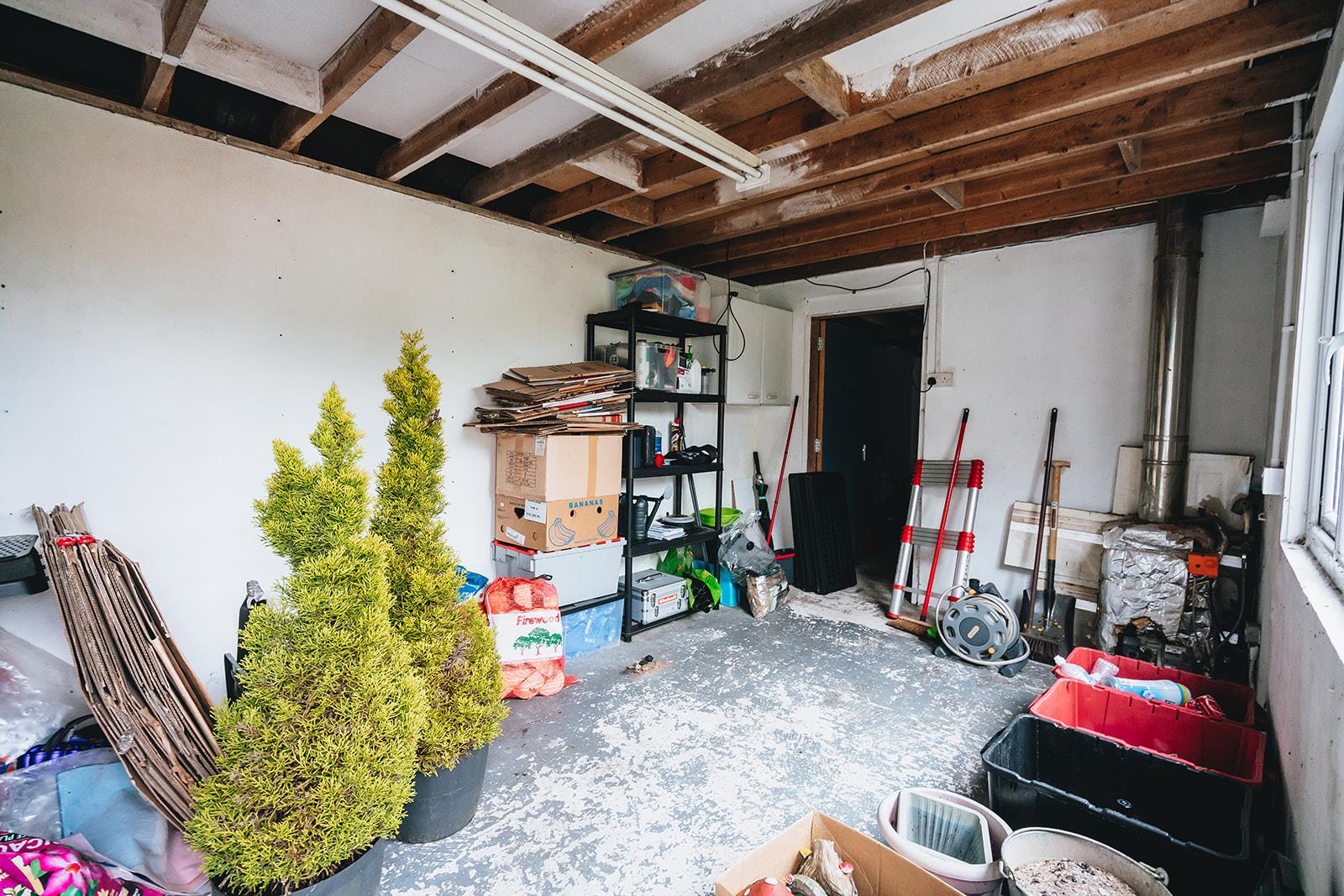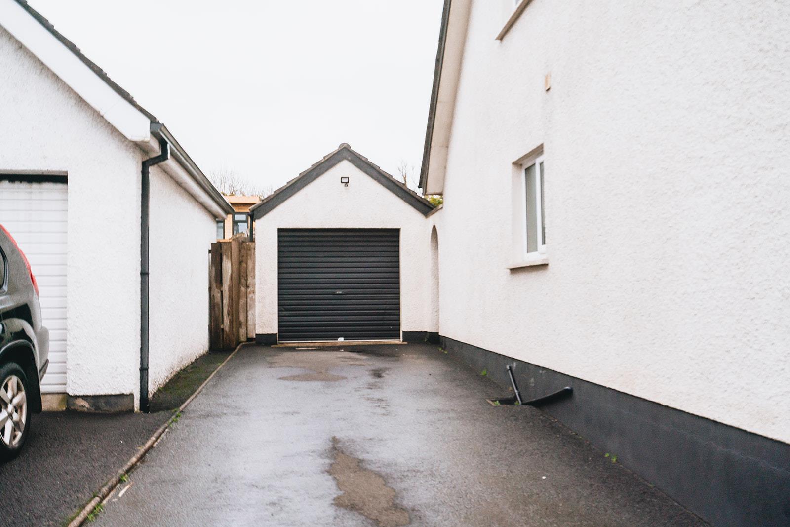 Detached garage with roller door, uPVC pedestrian door, uPVC window, strip lighting, power and oil fired burner. Door to rear storage 3.1m x 2.9m comprising a range of high and low level units and light.