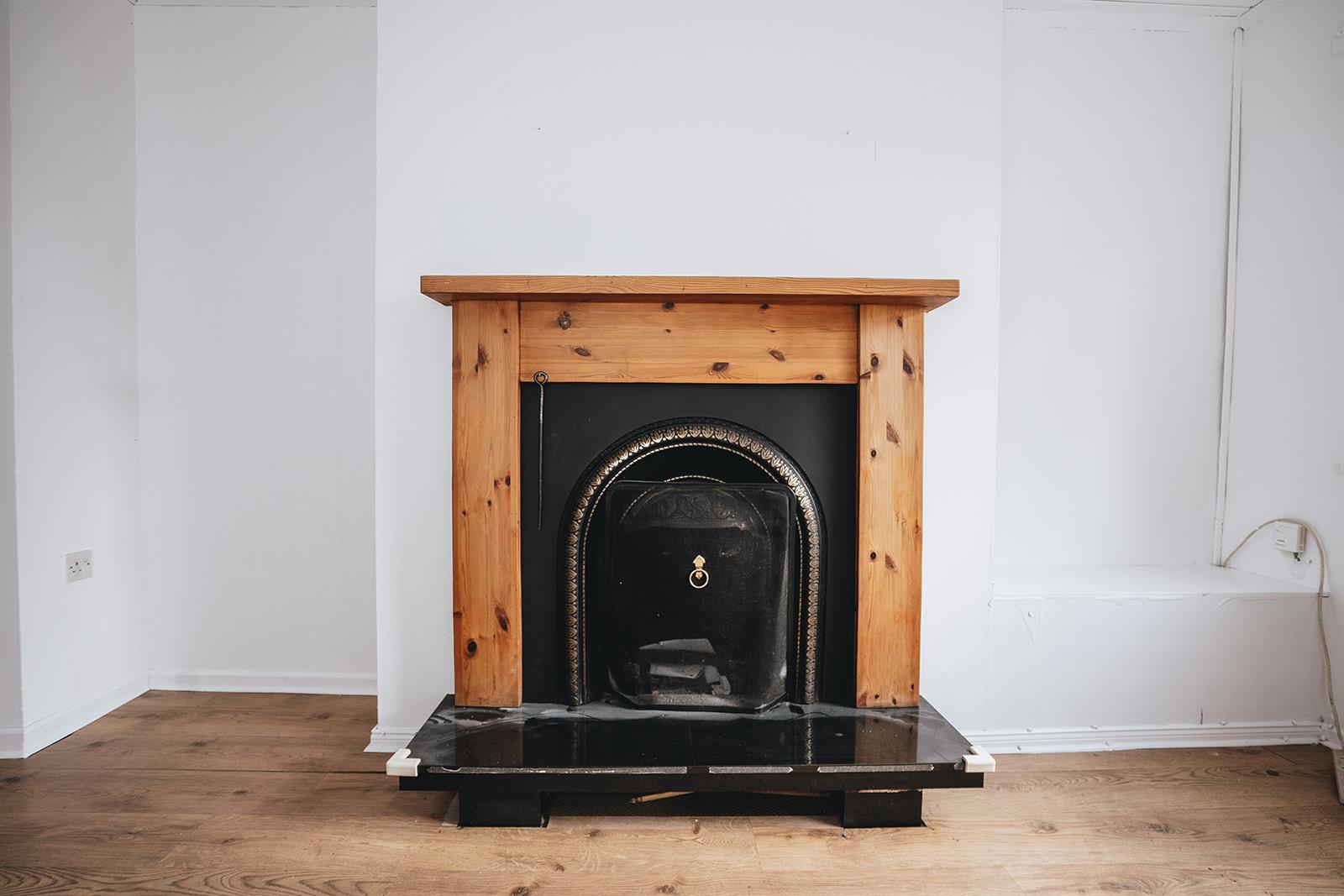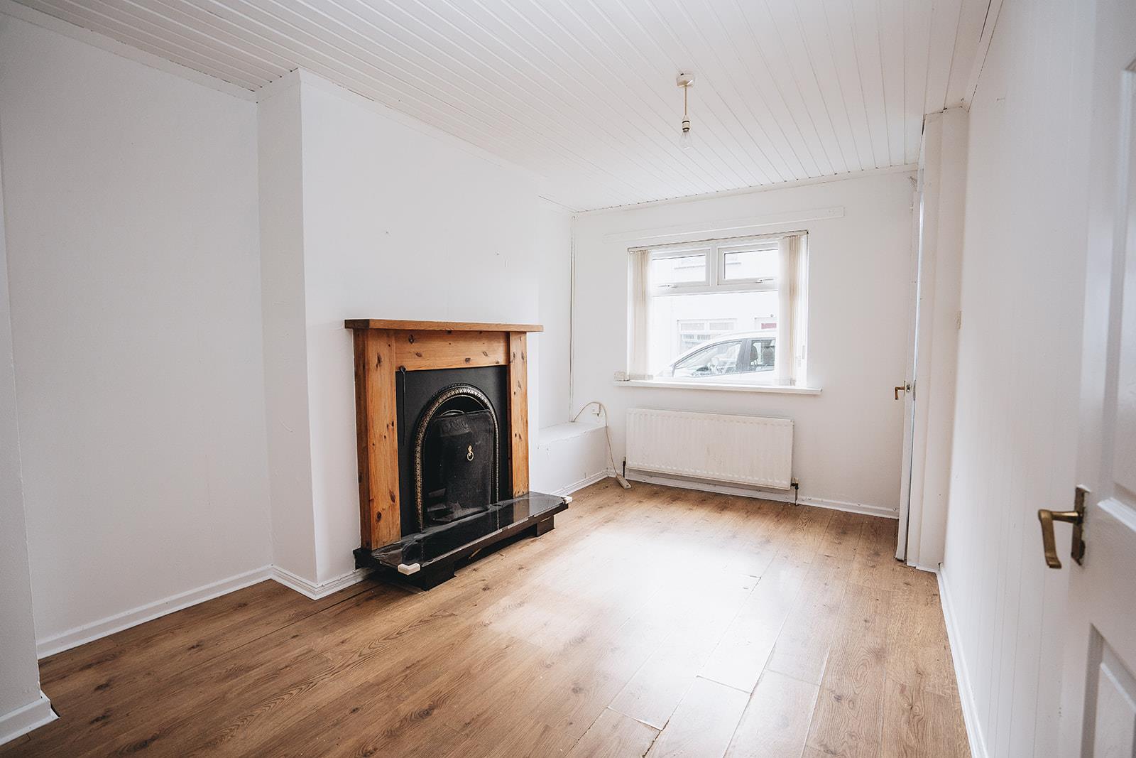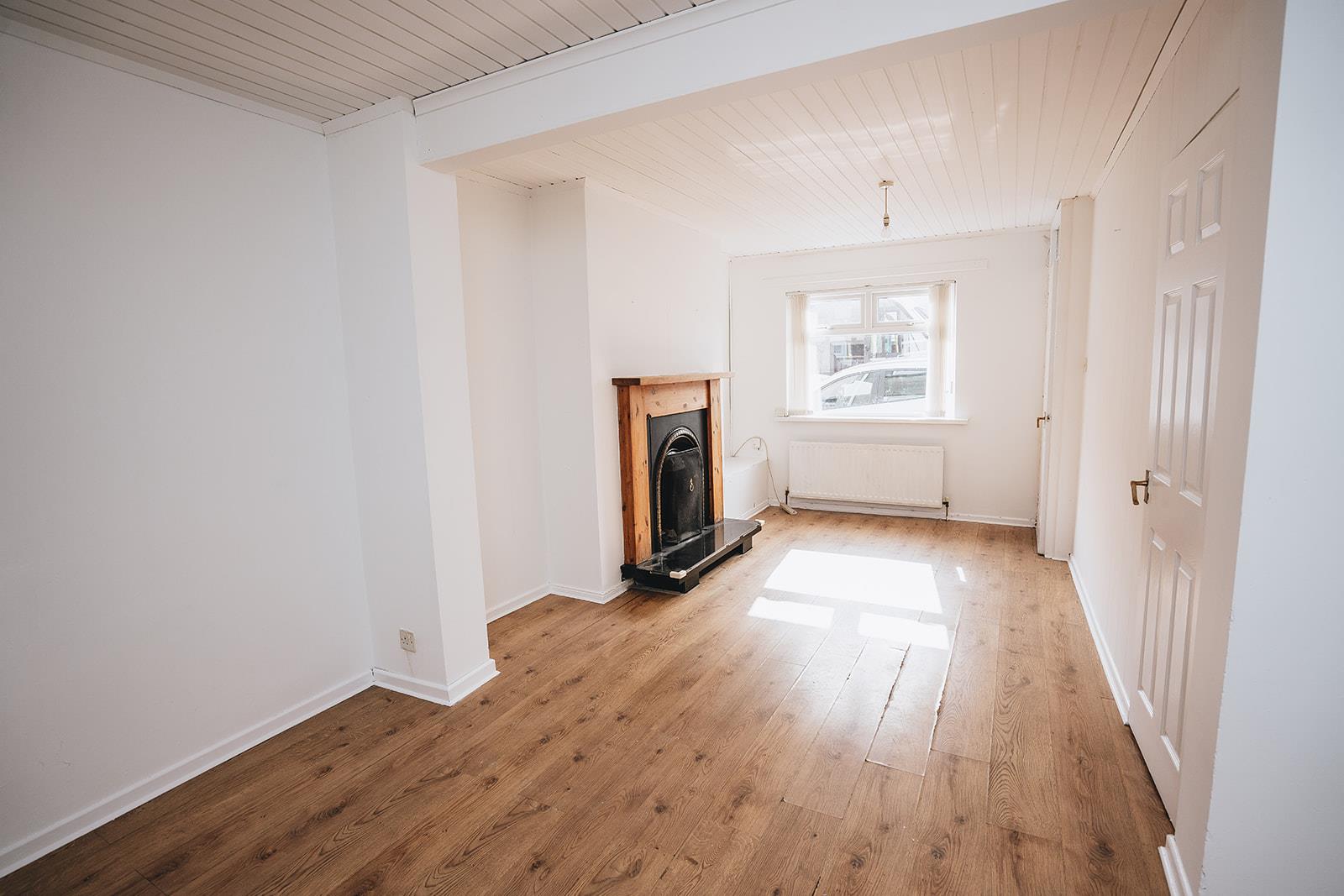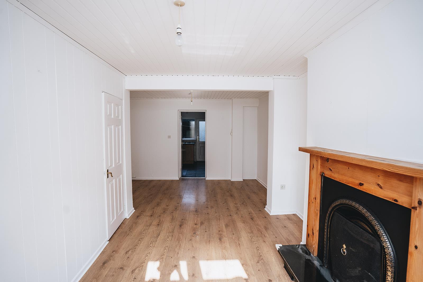 A spacious living space with an open fireplace in wood surround, cast iron inset and granite hearth. Storage understairs, wood strip ceiling and wood laminate flooring runs into the dining area.