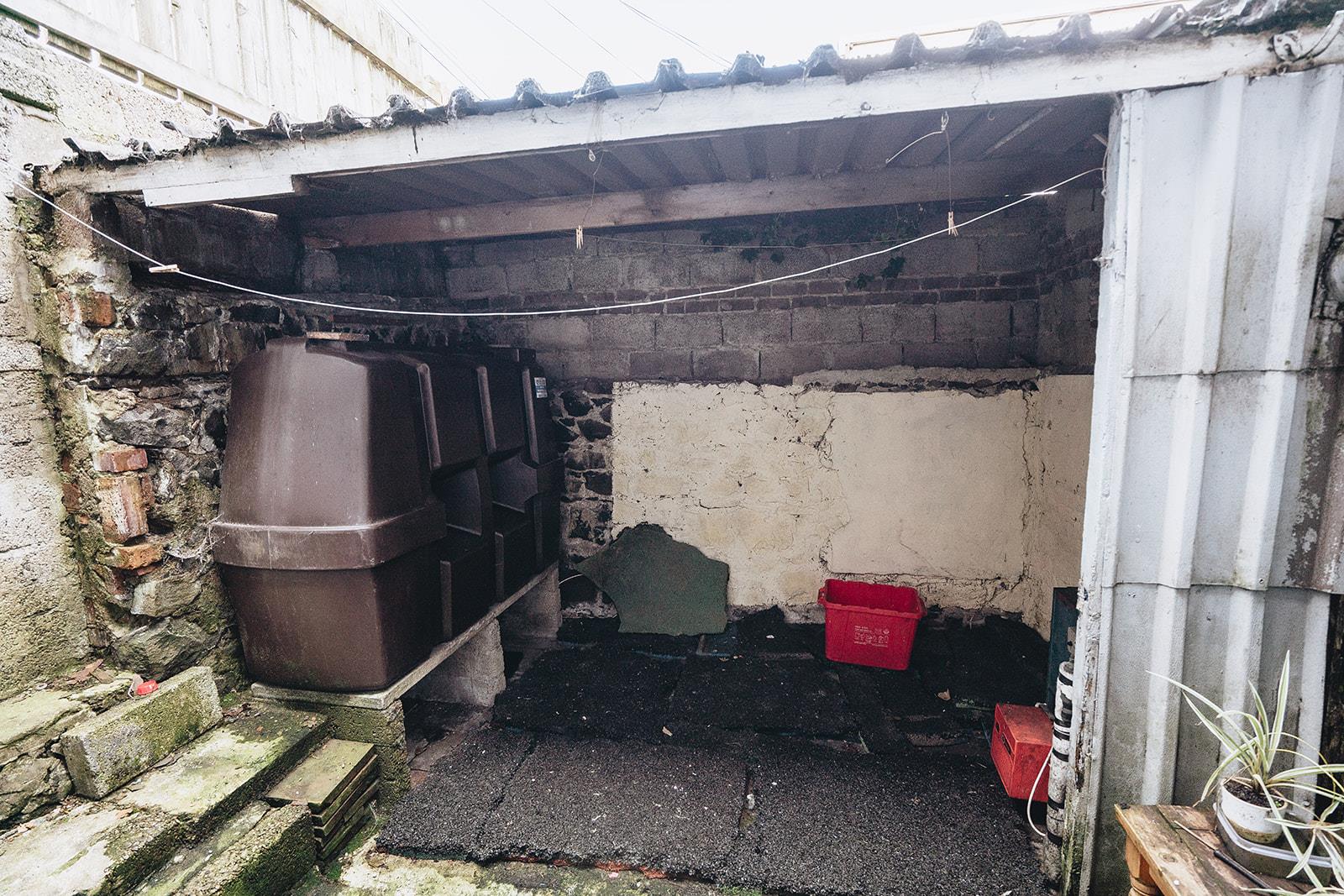 Enclosed rear concrete yard incorporating covered area with PVC oil storage tank and oil fired burner. Pedestrian door to the side laneway.