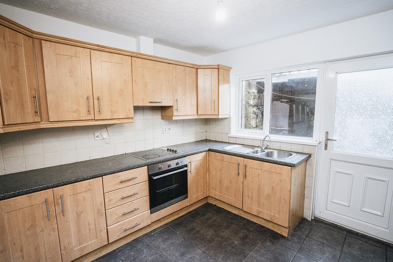 Comprising a range of high and low level units incorporating electric hob and under oven, extractor canopy, laminated worksurface with stainless steel sink inset. Tiled floor, plumbed for washing machine and space for tumble dryer.