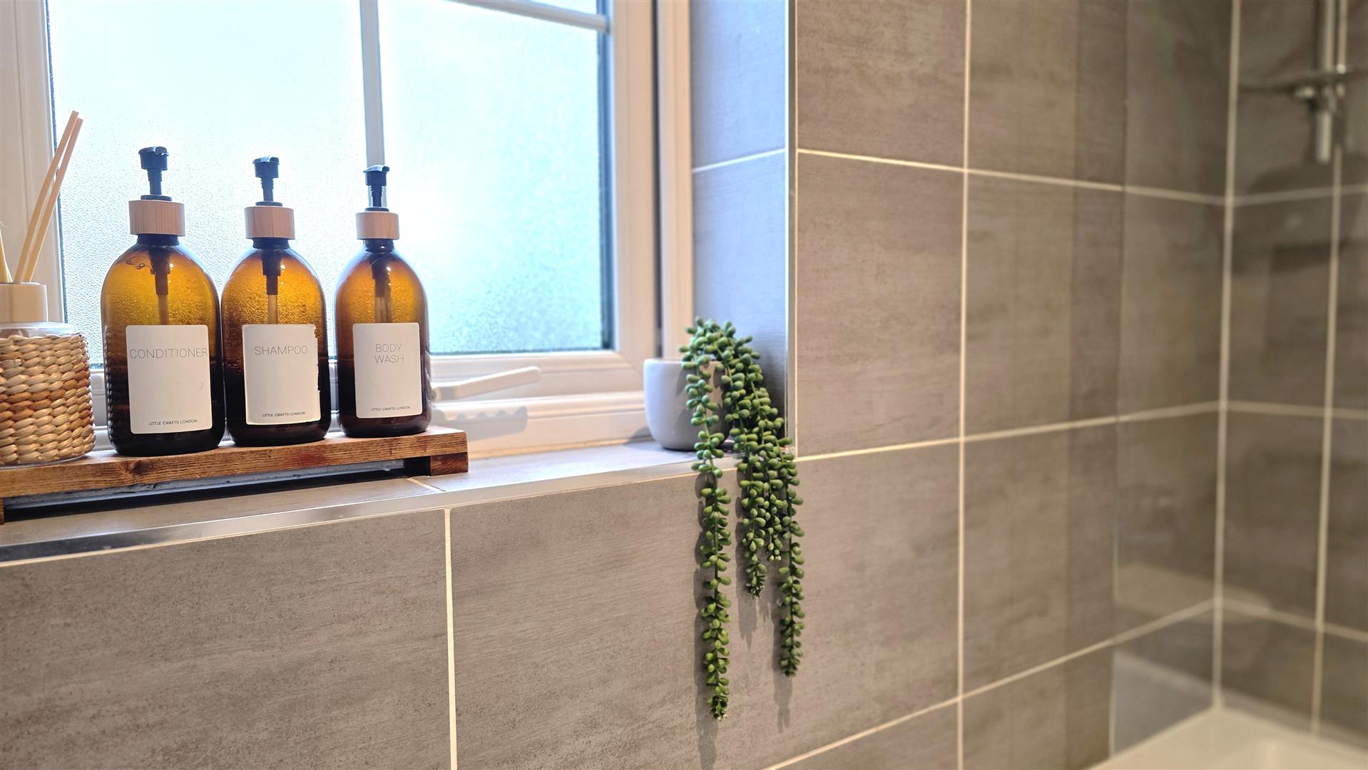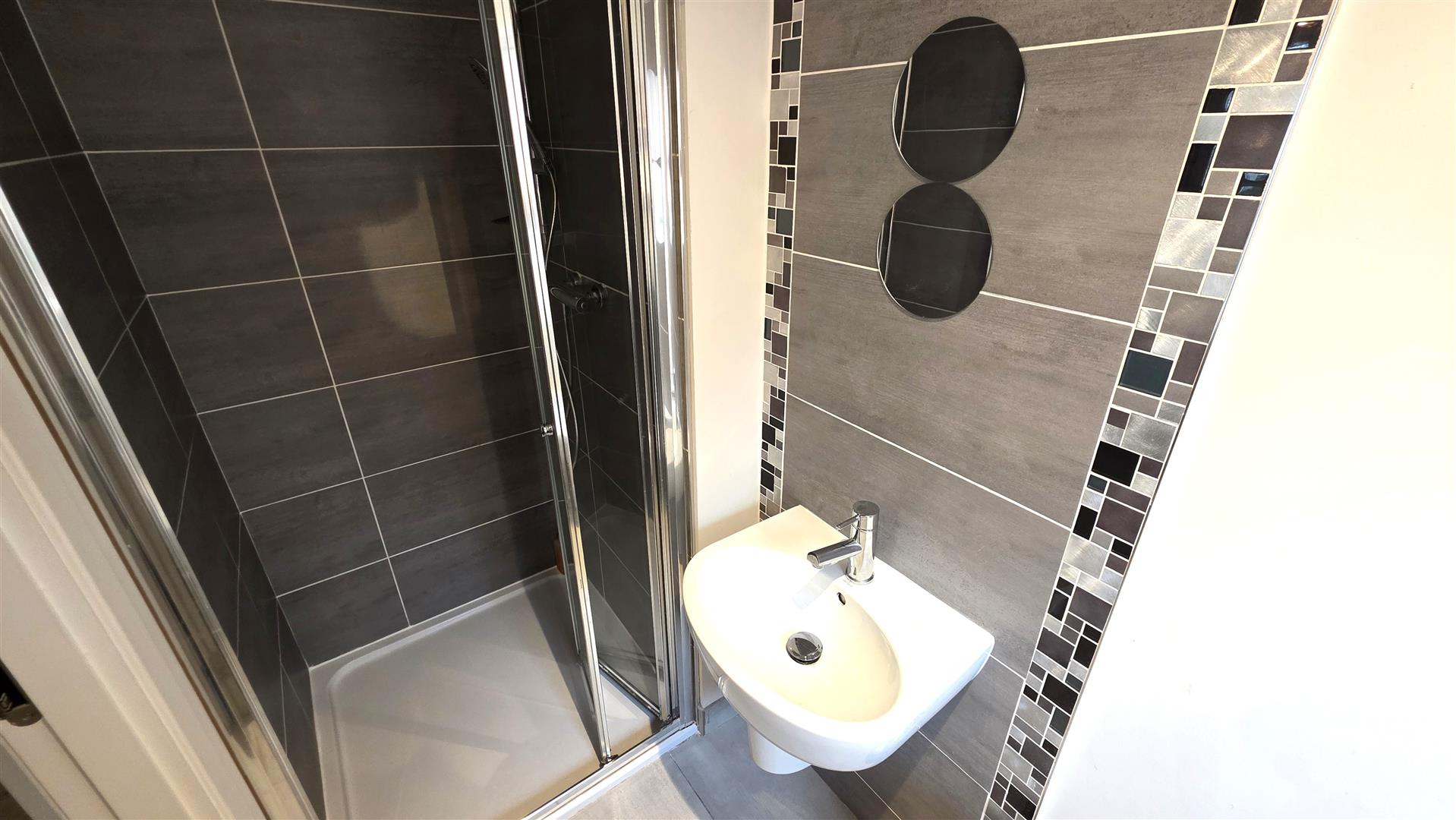 Modern white suite comprising a wall to wall enclosed shower with fully tiled splashback and partially glazed folding door. Half pedestal wash hand basin with 'Monobloc' chrome mixer tap and floor to ceiling tiled splashback. Low flush push button WC. Low voltage downlights. Fully tiled floor and tiled skirting. Extractor fan. Chrome towel radiator.