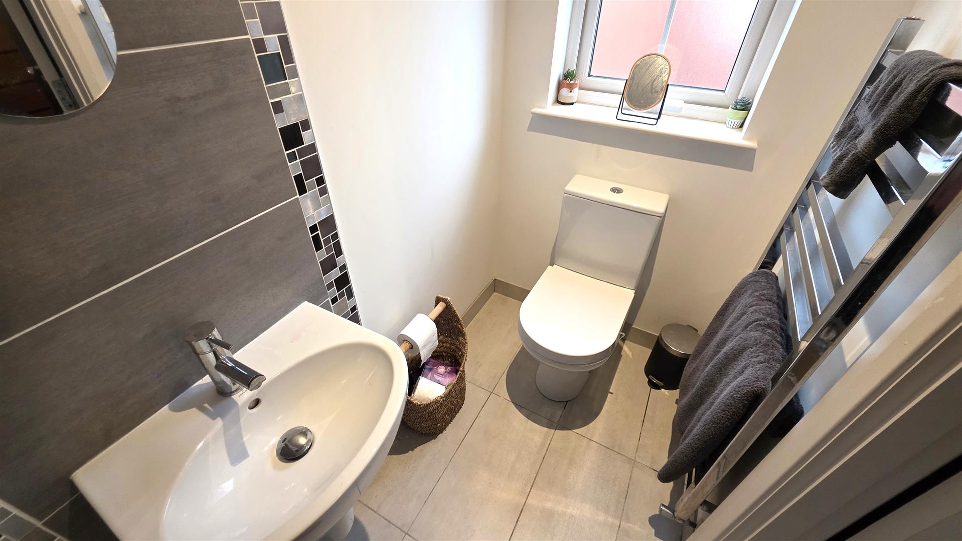 Modern white suite comprising a half pedestal wash hand basin with 'Monobloc' chrome mixer tap and tiled splashback. Low flush push button WC. Fully tiled floor and tiled skirting. Extractor fan. Single radiator.