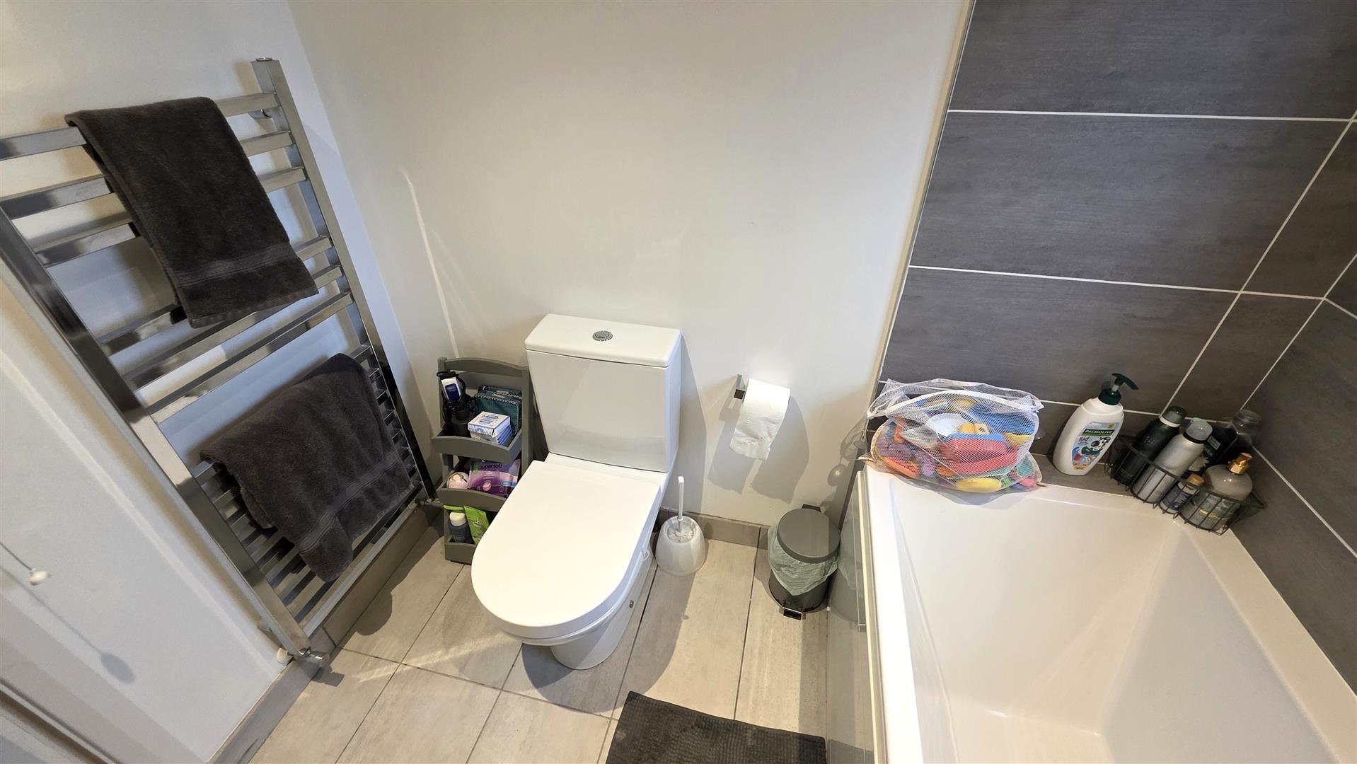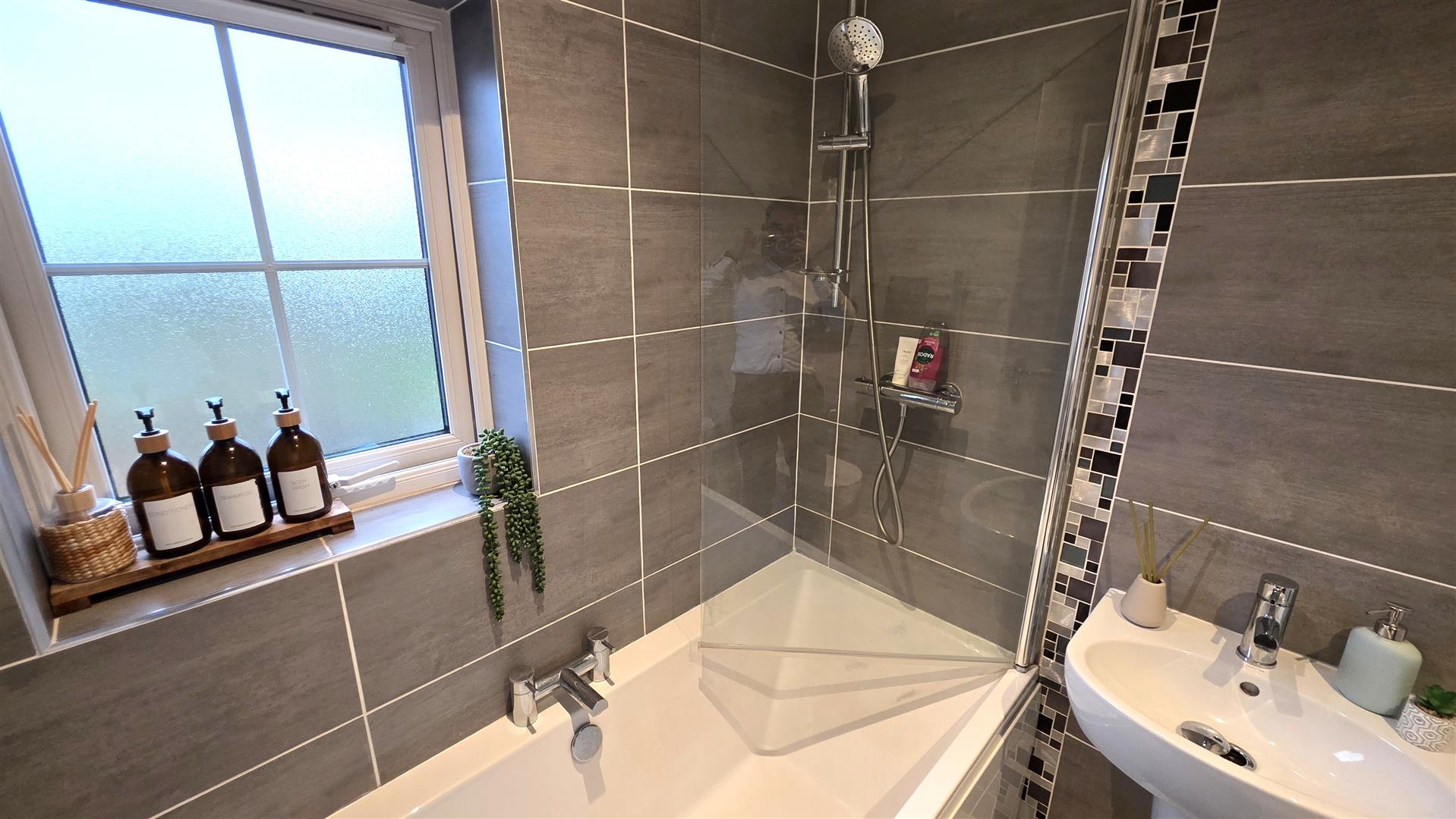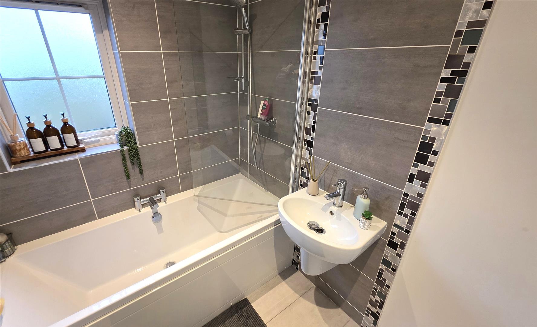 Modern white suite comprising a double ended panel bath with fully tiled splashback, shower over and a glazed screen. Half pedestal wash hand basin with 'Monobloc' chrome mixer tap. Fully tiled floor and tiled skirting. Extractor fan. Chrome towel radiator.