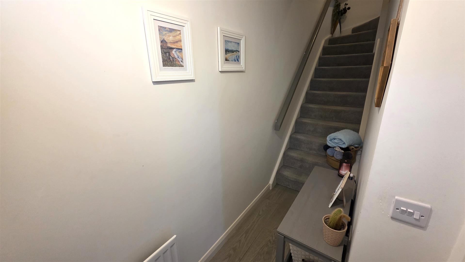 Composite door to entrance hall with fully tiled floor. Staircase to first floor with moulded handrail. Single radiator.