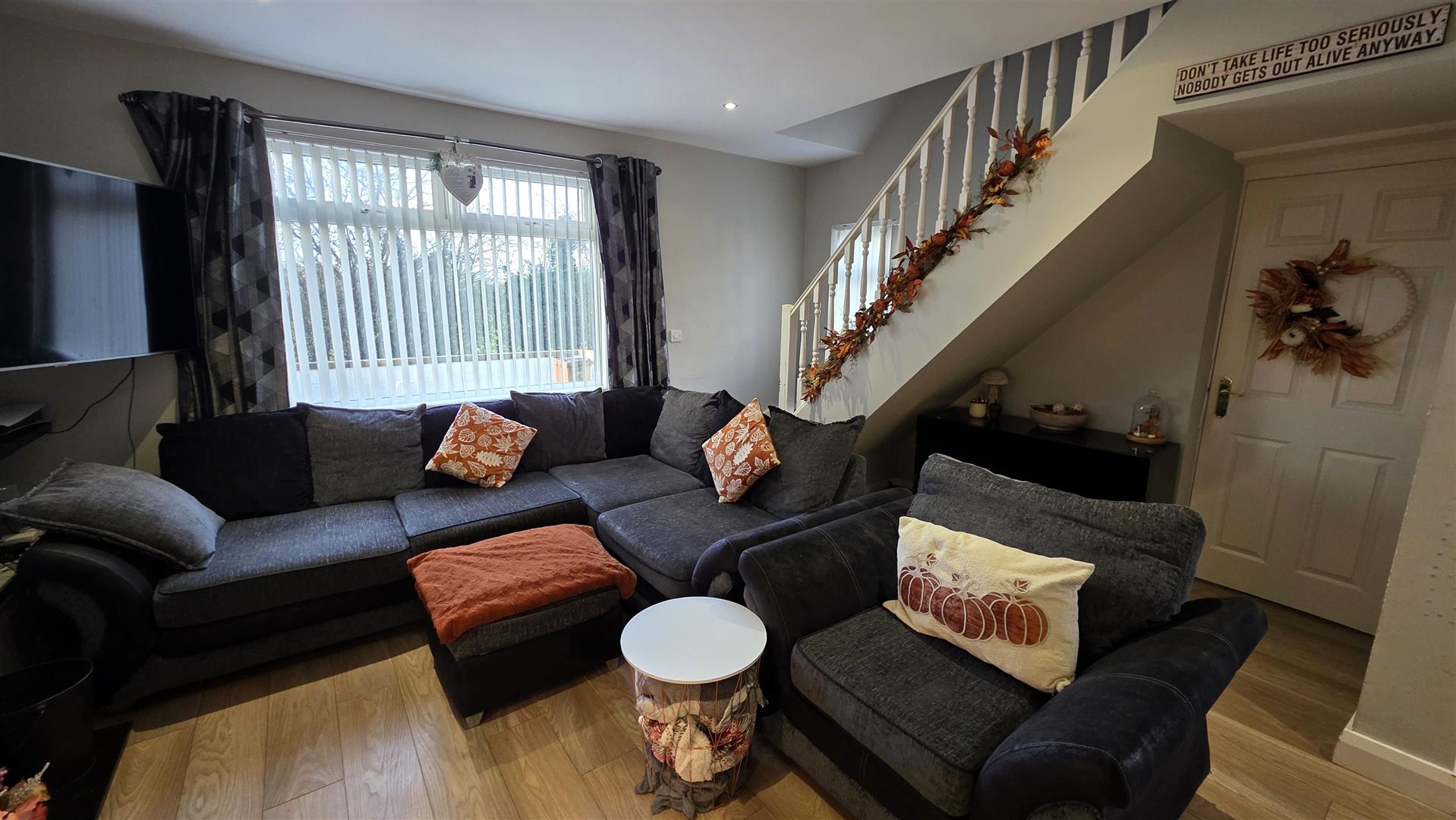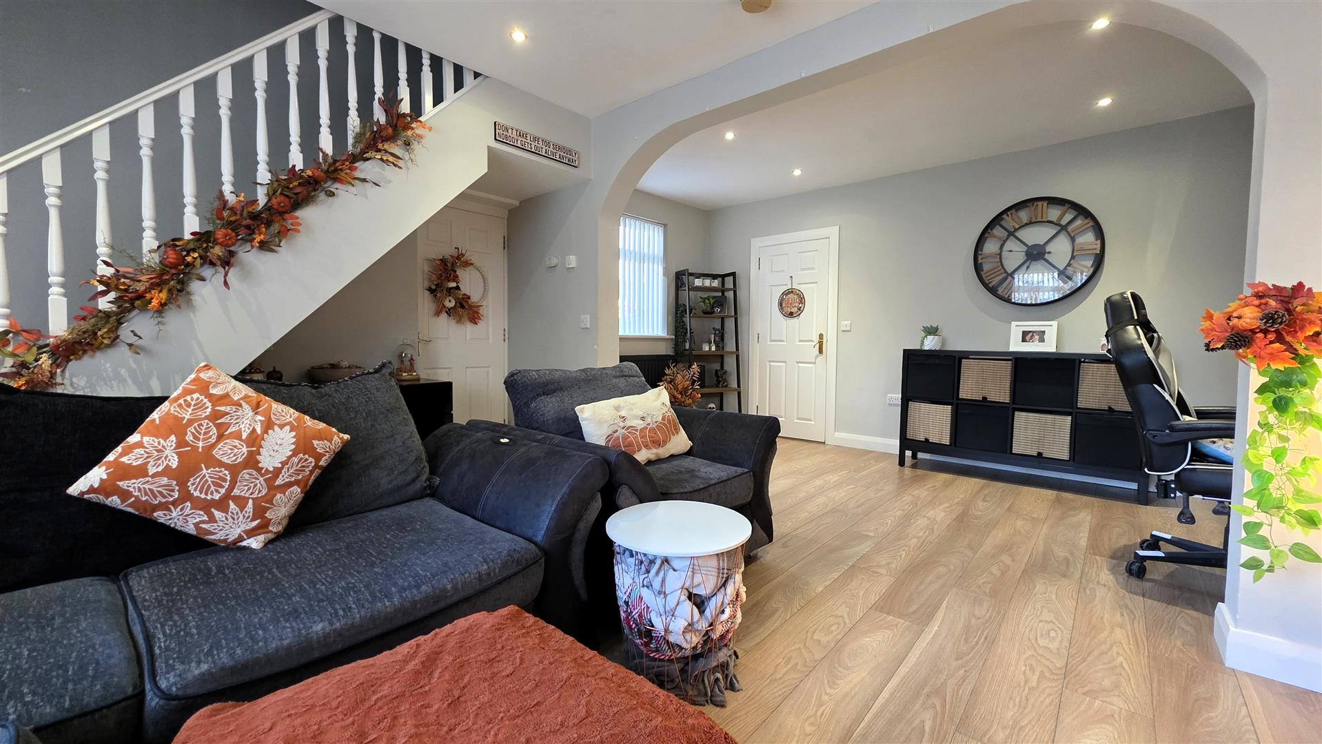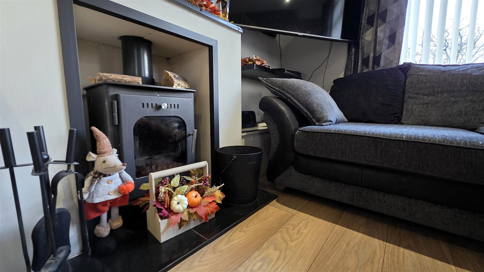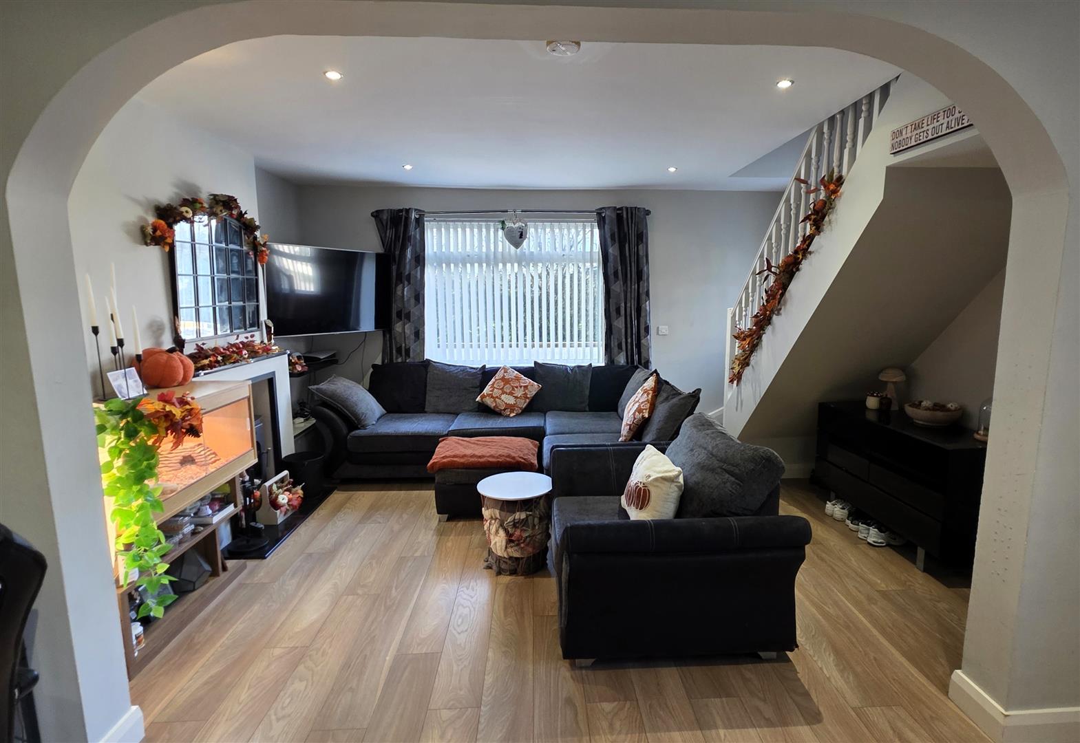 Feature inglenook style, multi fuel stove with back boiler. Featuring a polished granite hearth. Would laminate flooring. Low voltage down lighting. Dual aspect windows. Staircase to first floor with moulded handrail. 2 x double radiators.