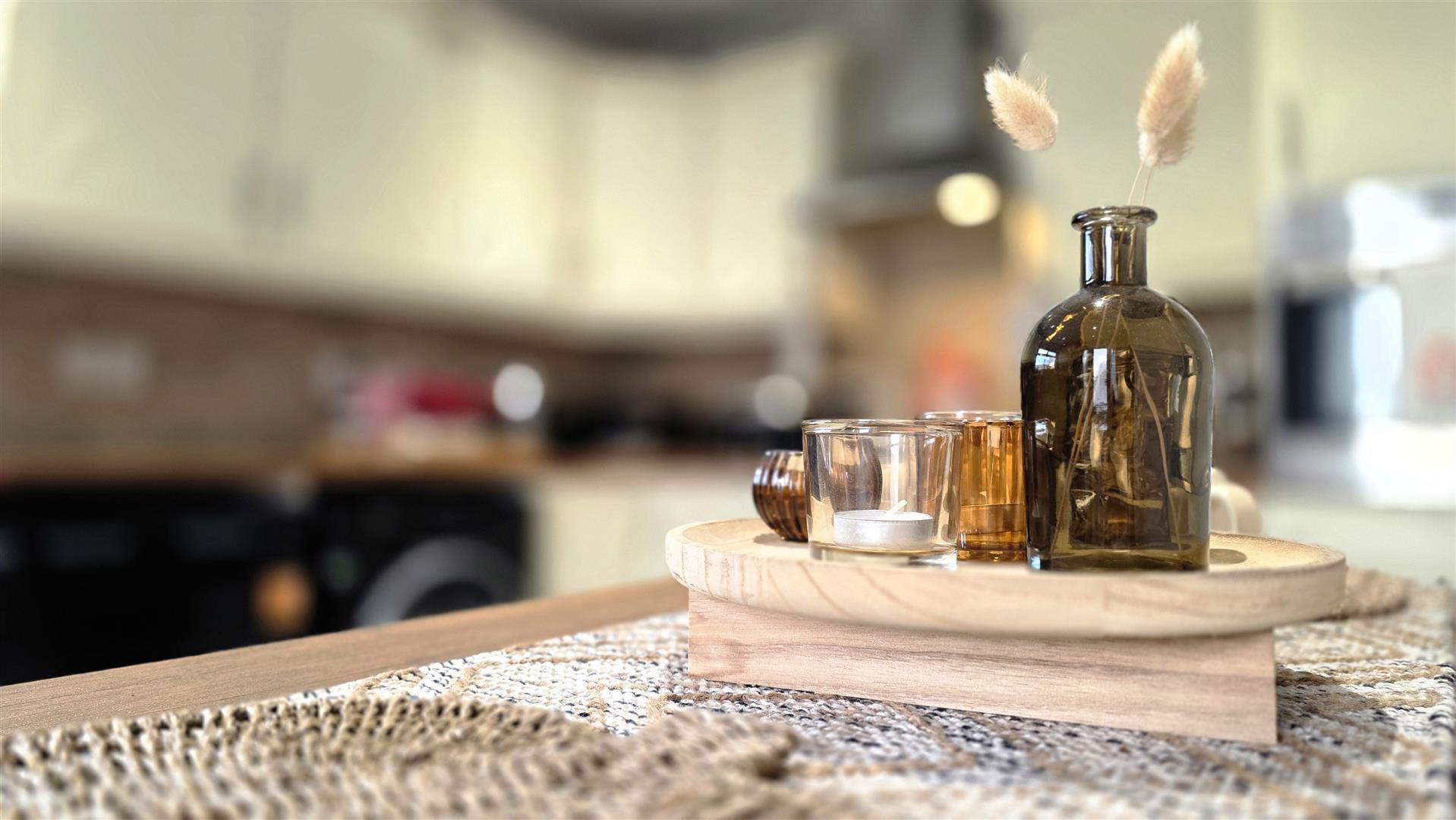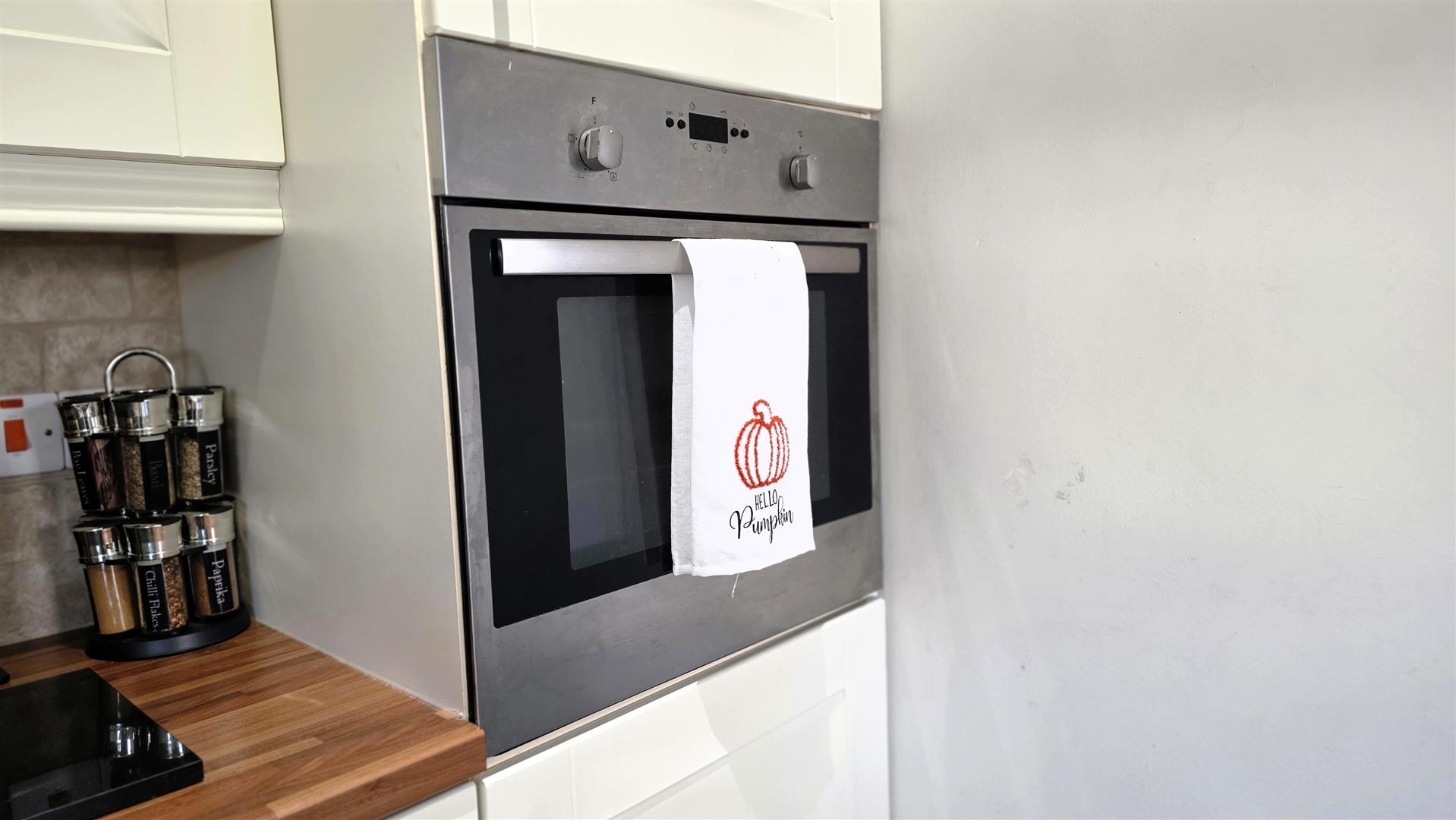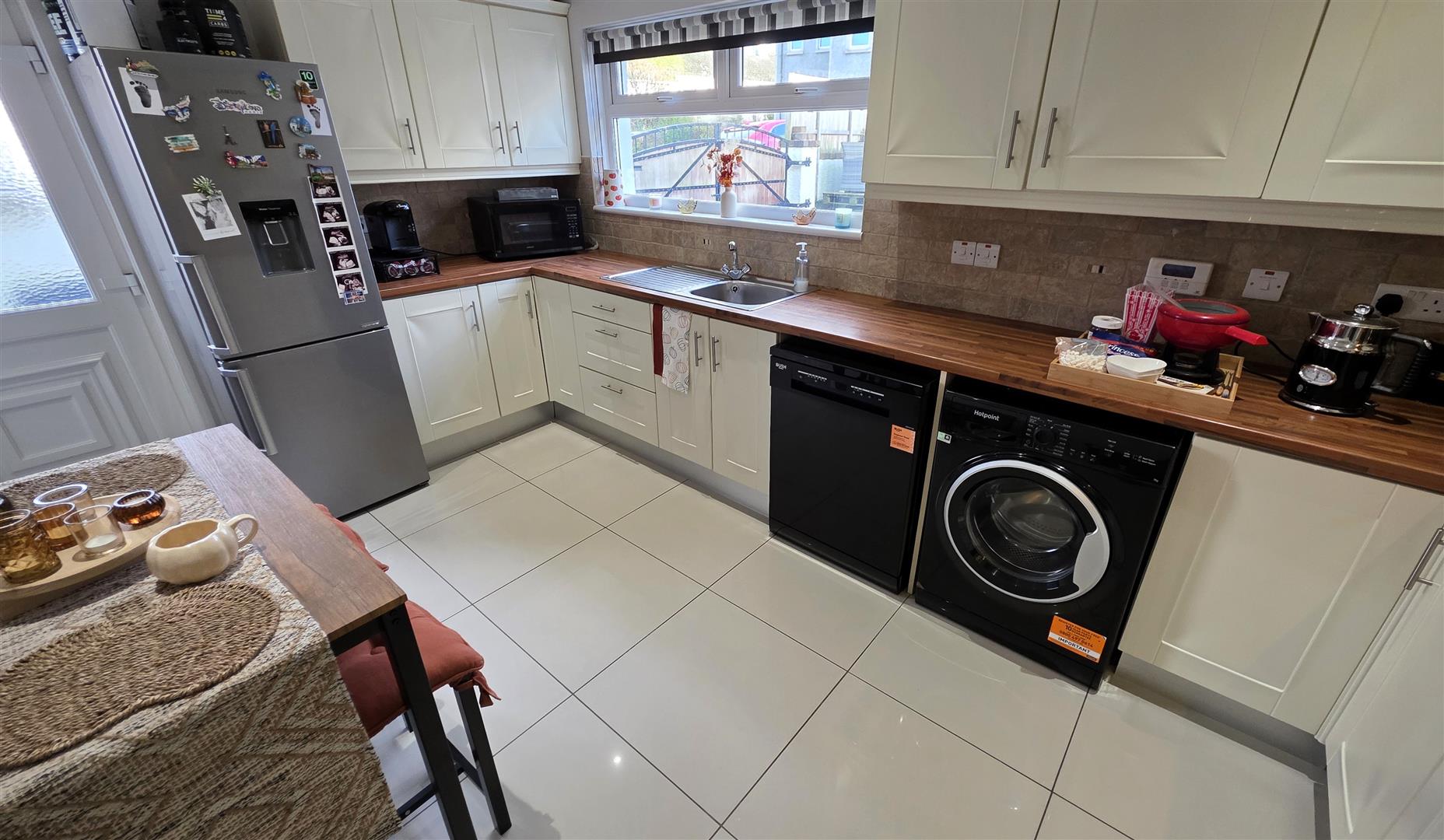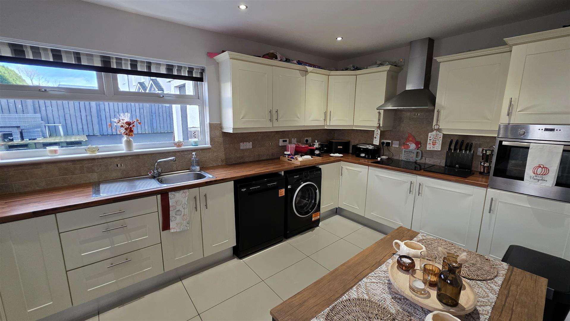 Fully fitted cream shaker style high and low level kitchen units with short chrome handles, contrasting butcher block style work surfaces and complimentary splashback tiling. Single drainer stainless steel sink unit with chrome mixer tap. Integrated appliances to include a four ring halogen hob with stainless steel pyramid style Overhead extractor fan and a combination mid level oven and grill. Space for washing machine, tumble, dryer or dishwasher and fridge freezer. Low voltage down lighting fully tiled floor double radiator PVC double glazed door to the rear.