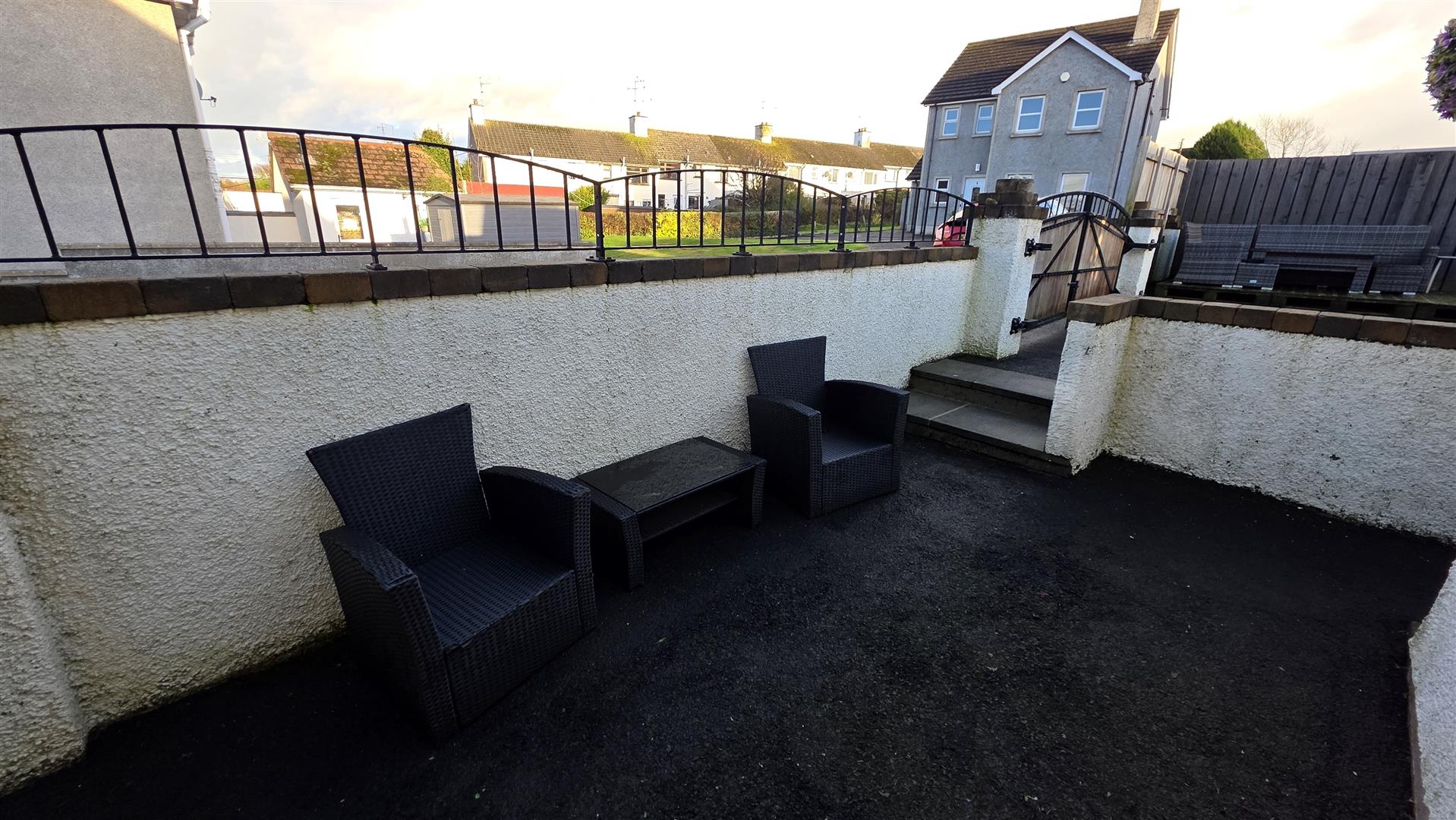 Fully enclosed, rear garden with a mix of six foot timber fencing and a four foot wall with a cast iron railings over. Mostly tarmacked with paved patio area. Raised timber decking. Outside tap and outside lighting. Cast iron and timber double gates to side. Boiler house and outside storage. Option of additional parking to the rear.
