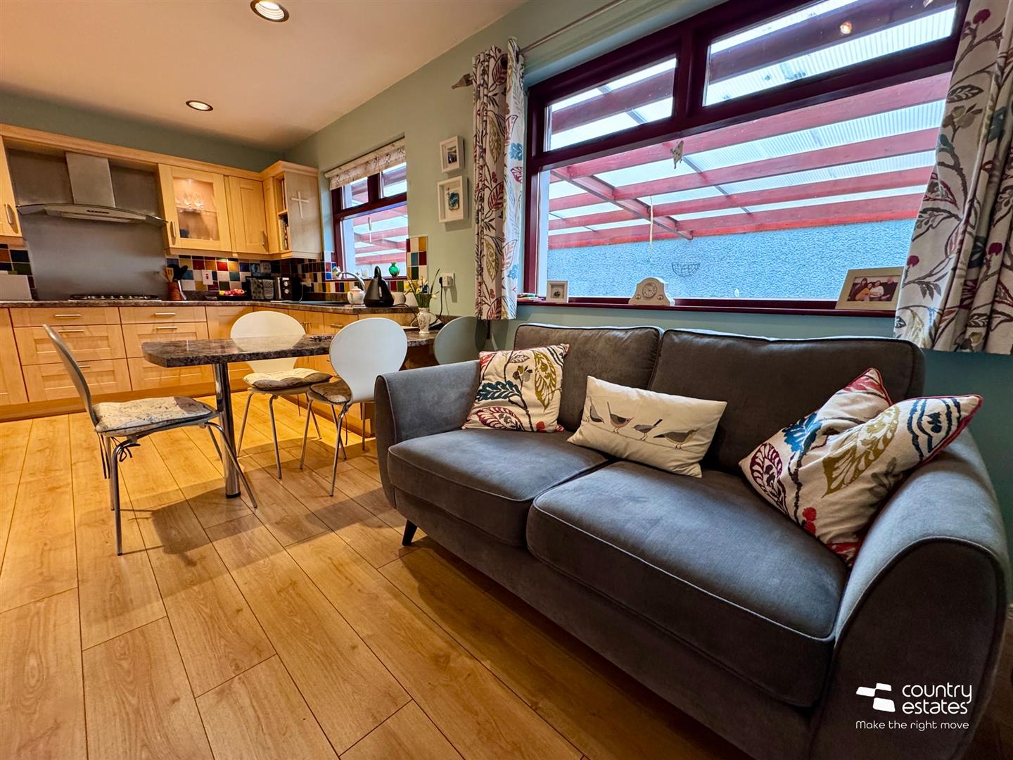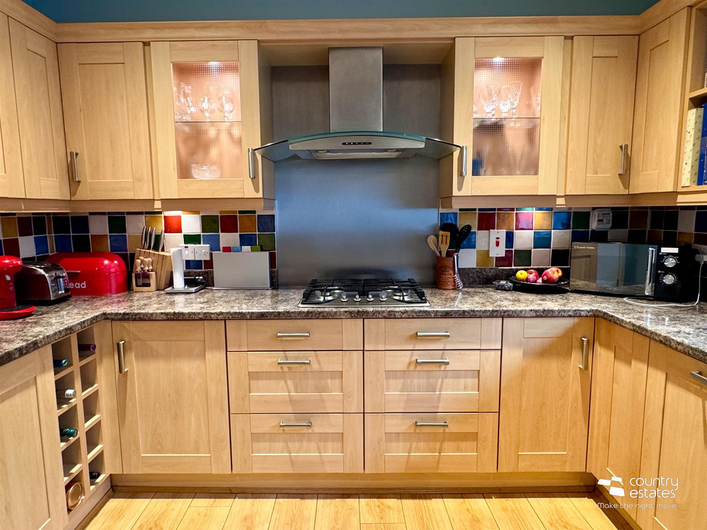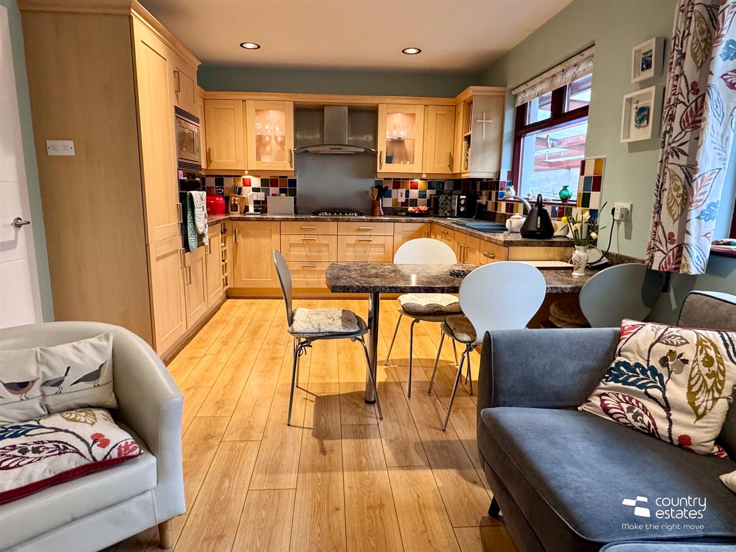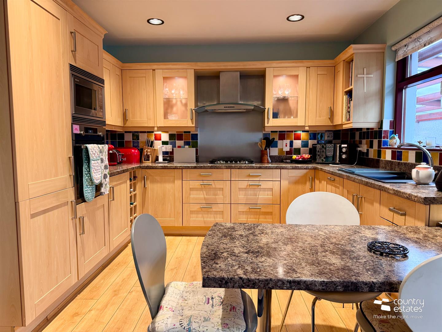 Equipped with a comprehensive range of high and low level shaker style fitted units with contrasting work surfaces. Inlaid colour coded one and half bowl drainer sink unit with mixer tap. Twin glazed cabinets. Integrated eye level microwave with under oven. Separate four gas hob with overhead extractor fan housed in stainless steel canopy with glass hood and stainless steel splashback. Fixed wine rack. Integrated dishwasher and under counter fridge. Pull out fitted carousel unit. Fixed breakfast table for casual dining. Quality laminate plank flooring. Dual window aspect.