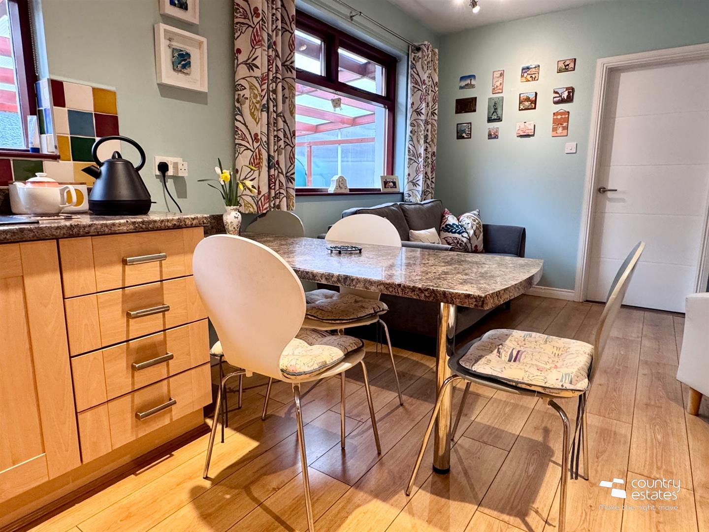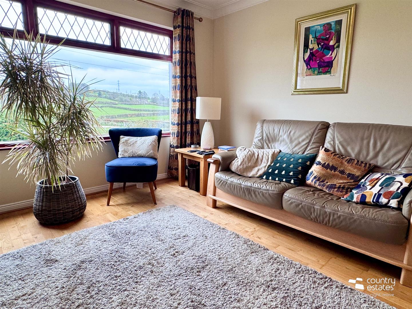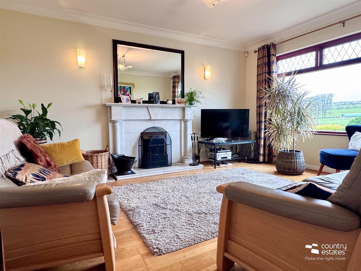 Attractive marble open fireplace with matching hearth and inset with back boiler. Exposed hardwood flooring. Picture style window with far reaching views over garden extending towards surrounding countryside. Dual wall light facility.