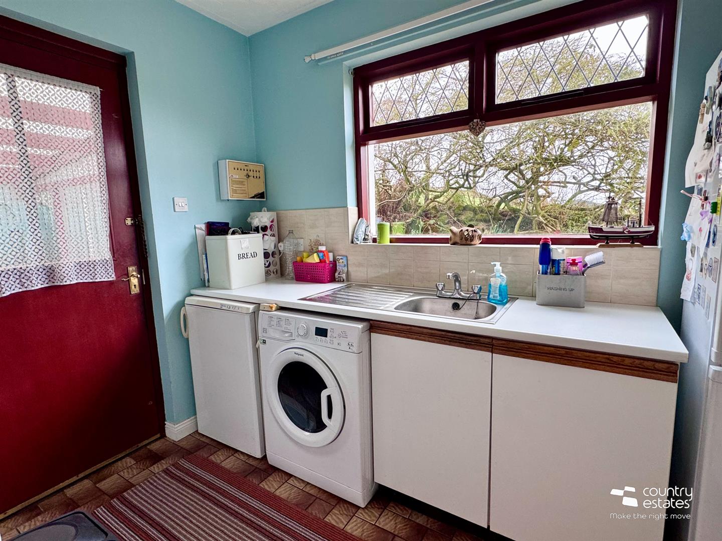 Fitted with a range of low level units single drainer stainless steel sink unit. Plumbed for washing machine. Part tiled walls. Tile floor. External door to rear.