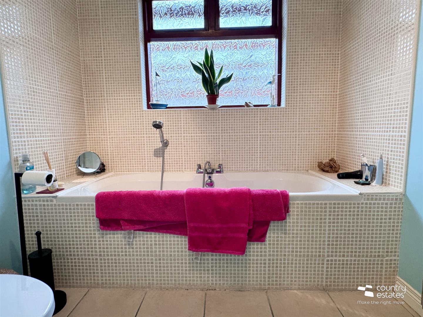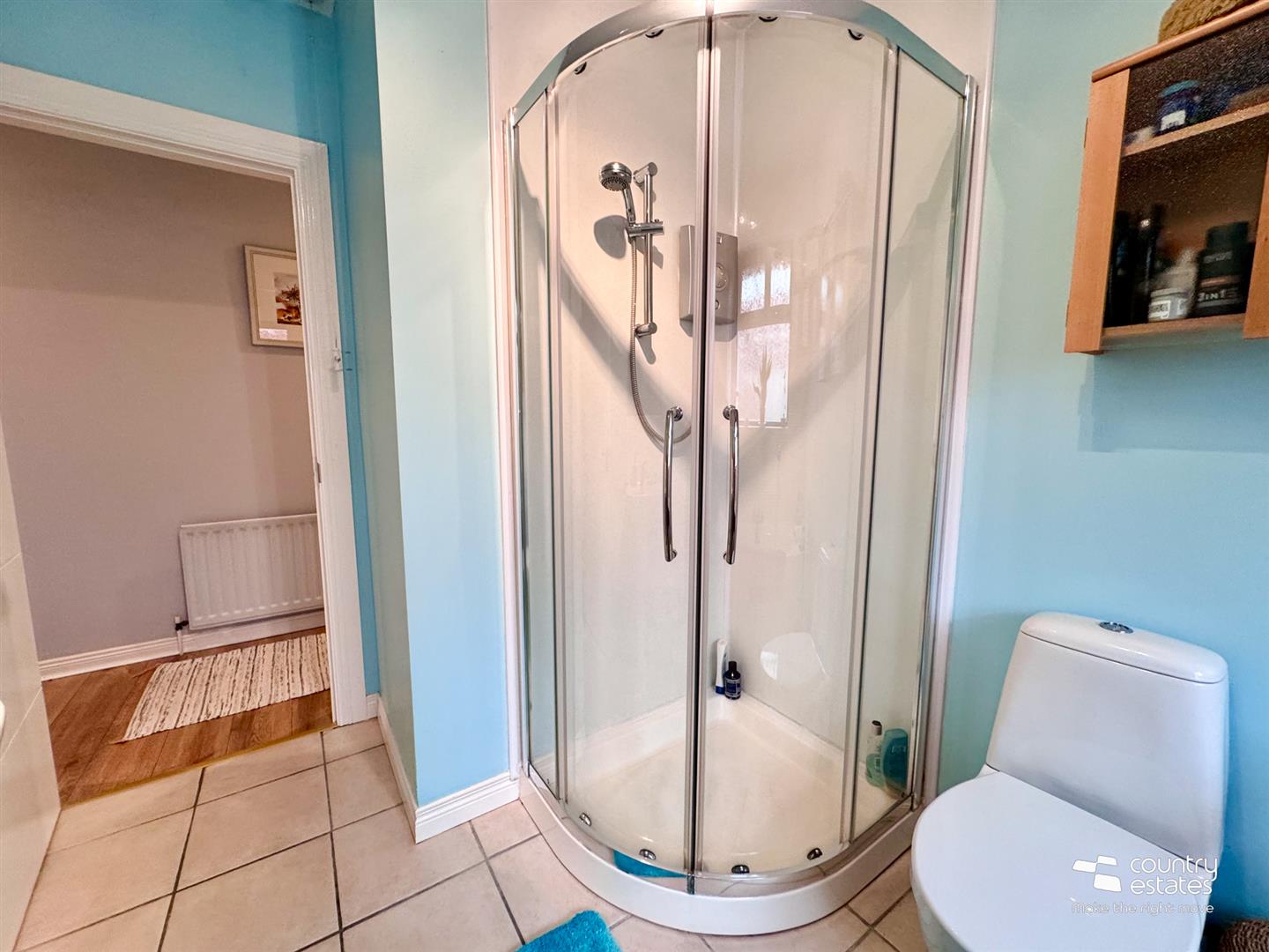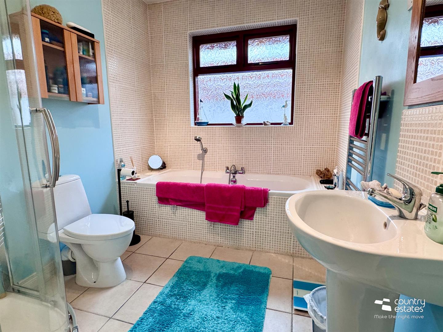 Four piece suite comprising pedestal wash hand basin with single lever tap, button flush w.c, tiled panelled bath with hand shower attachment and quarter rounded shower cubicle with electric shower unit. Tiled floor.
