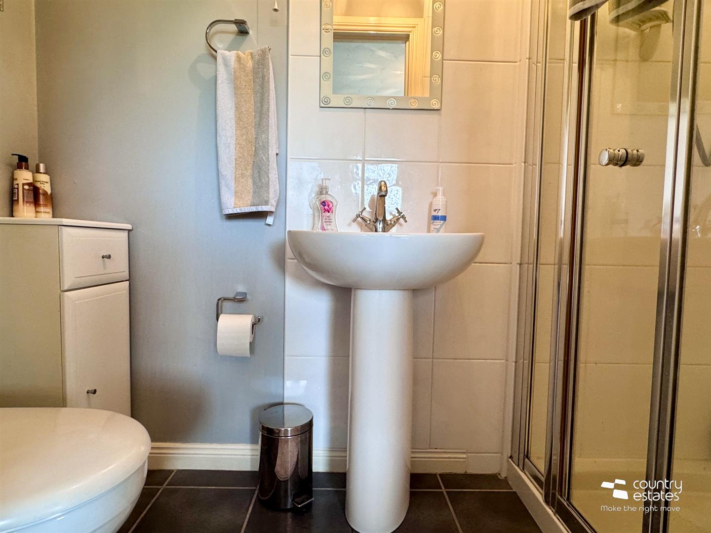 Comprising pedestal wash hand basin, button flush w.c and fully tiled shower enclosure with electric shower unit. Tiled floor.