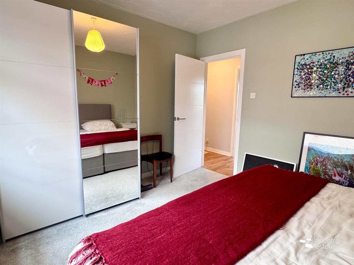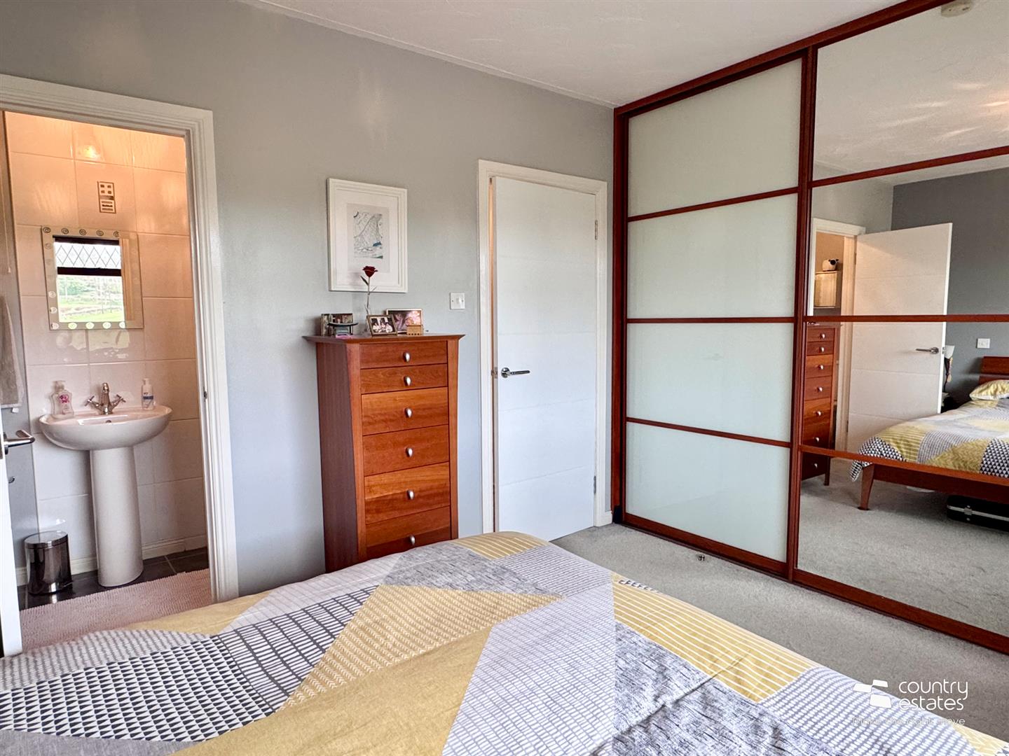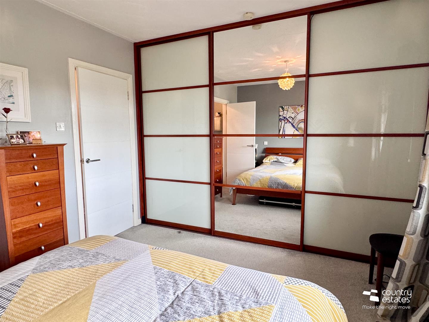 Bespoke fitted modern wall to wall sliderobe with mirrored centre. Views over gardens extending over surrounding countryside.